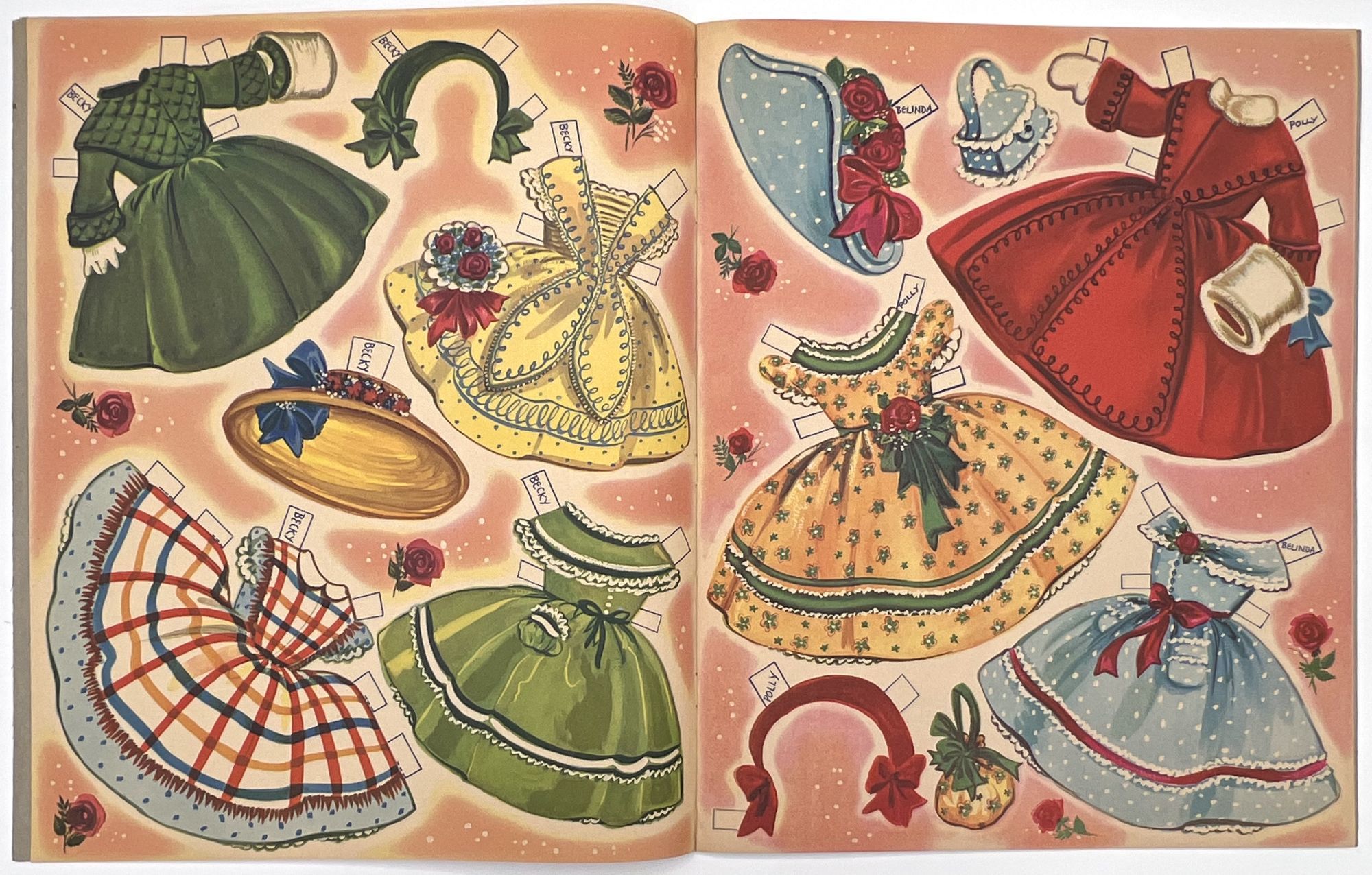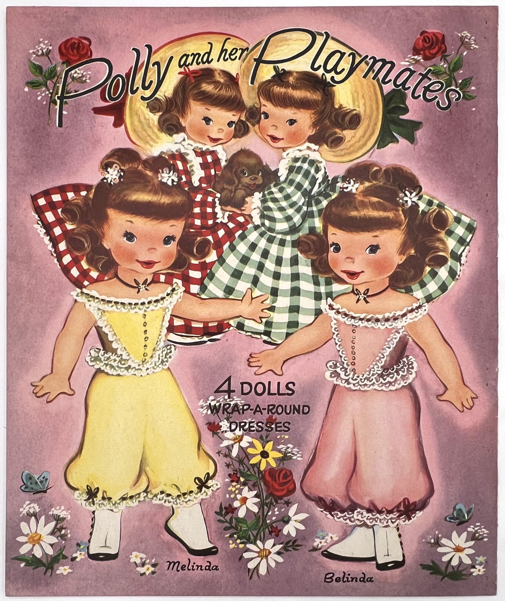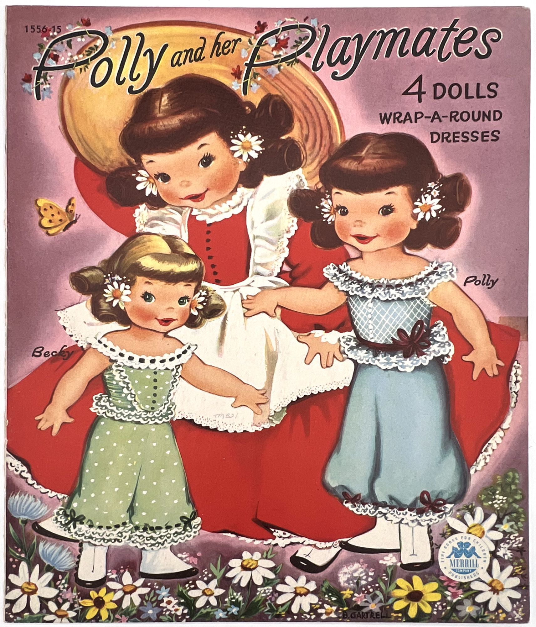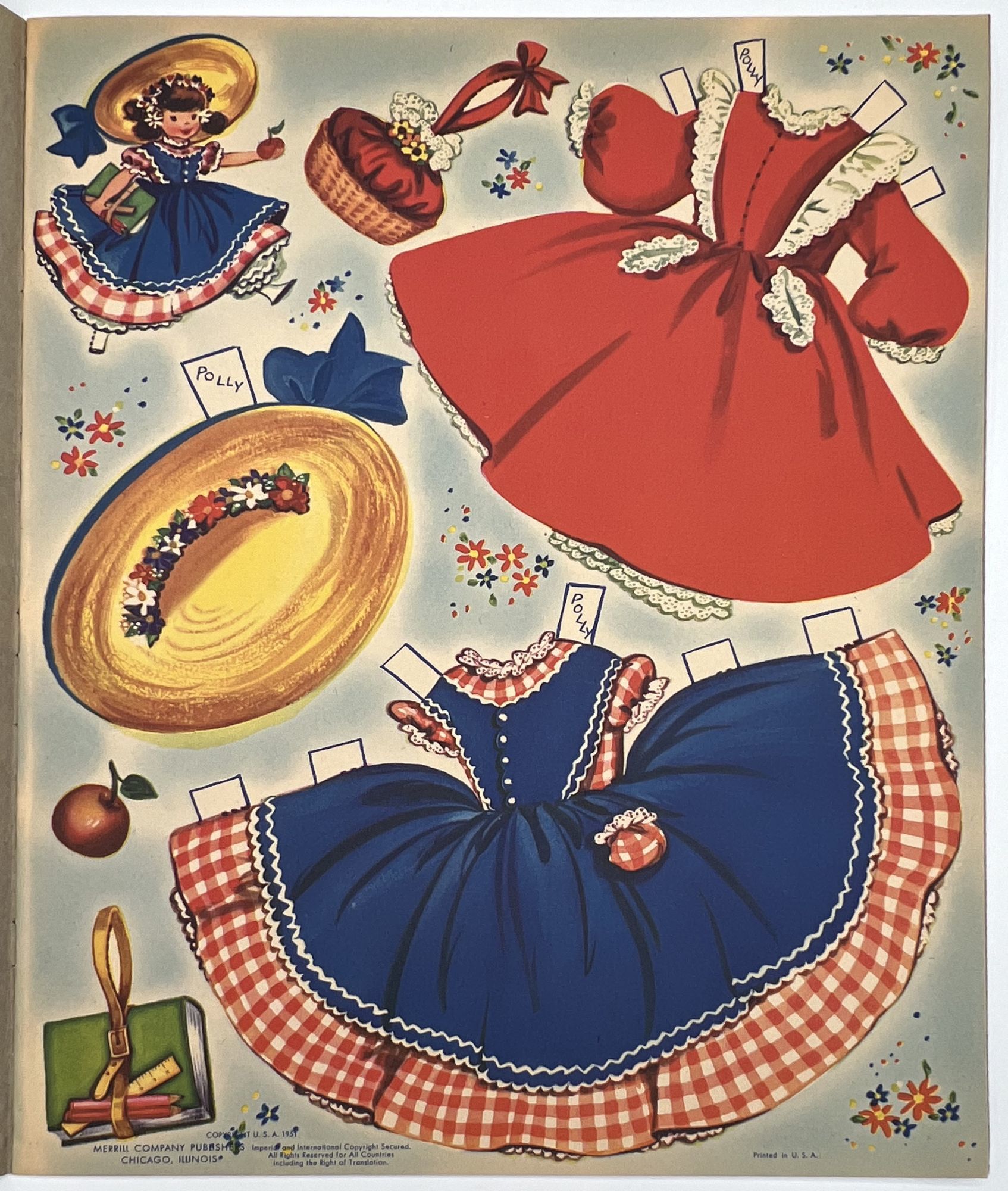 "Polly and her Playmates". Chicago: Merrill Publishers, 1951. Single vol. (12.75" by 10.25"), 8 leaves of uncut outfit pages, stapled in original illustrated covers with two uncut dolls on each cover.