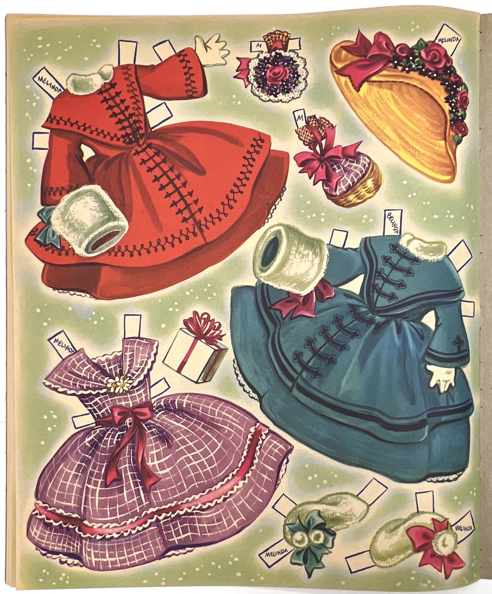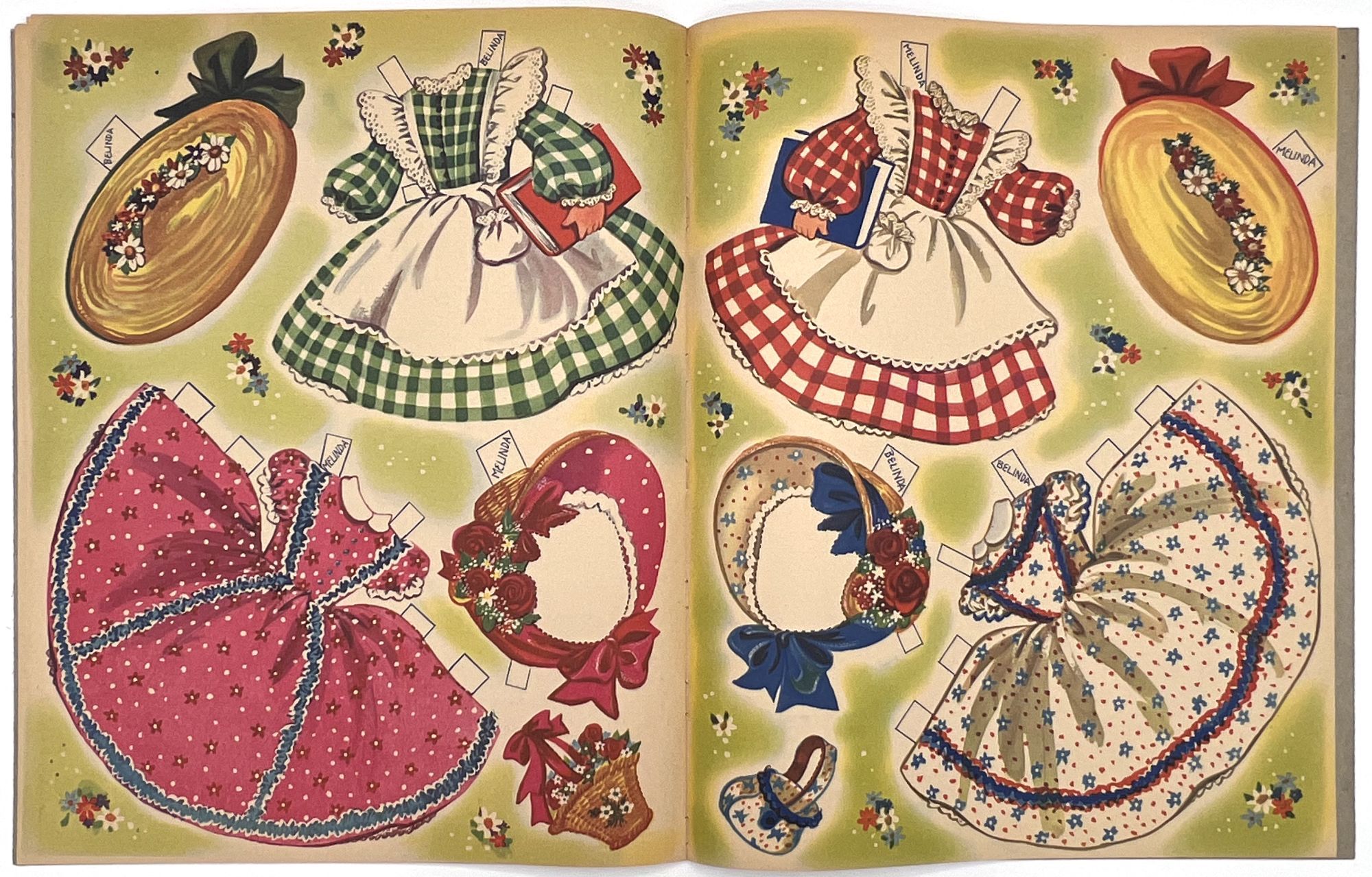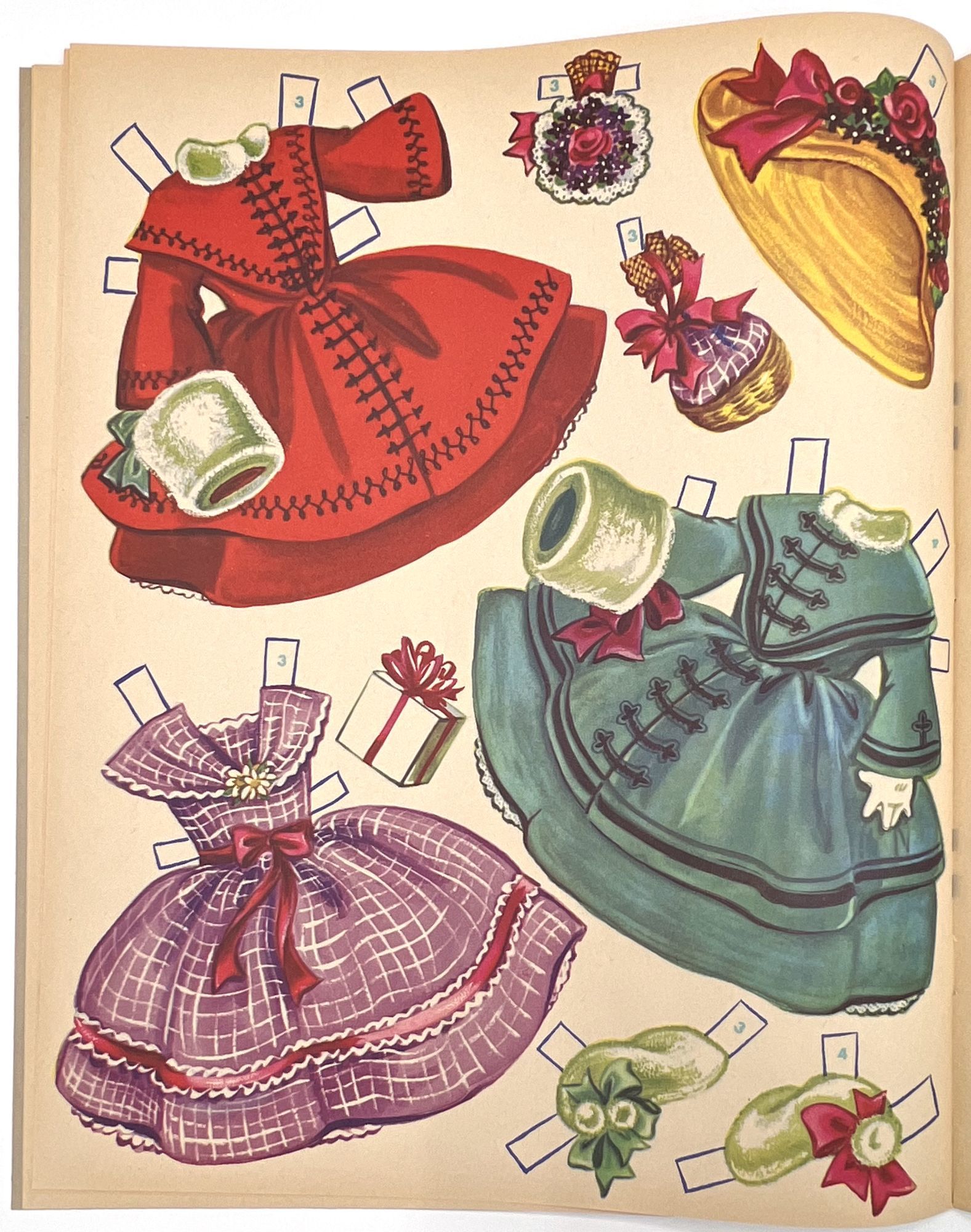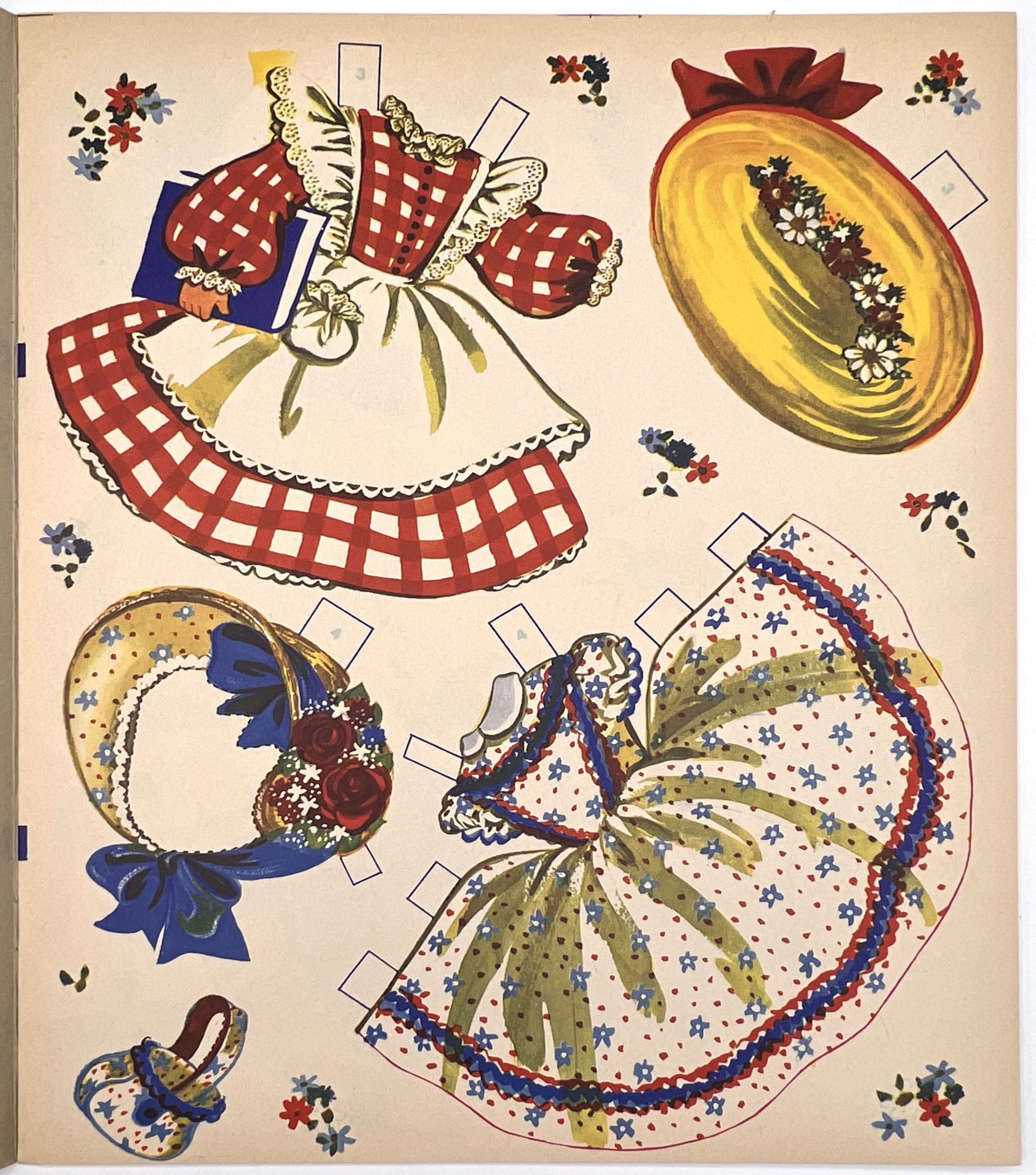 "Polly and her Playmates". Chicago: Merrill Publishers, 1951. Single vol. (12.75" by 10.25"), 8 leaves of uncut outfit pages, stapled in original illustrated covers with two uncut dolls on each cover.