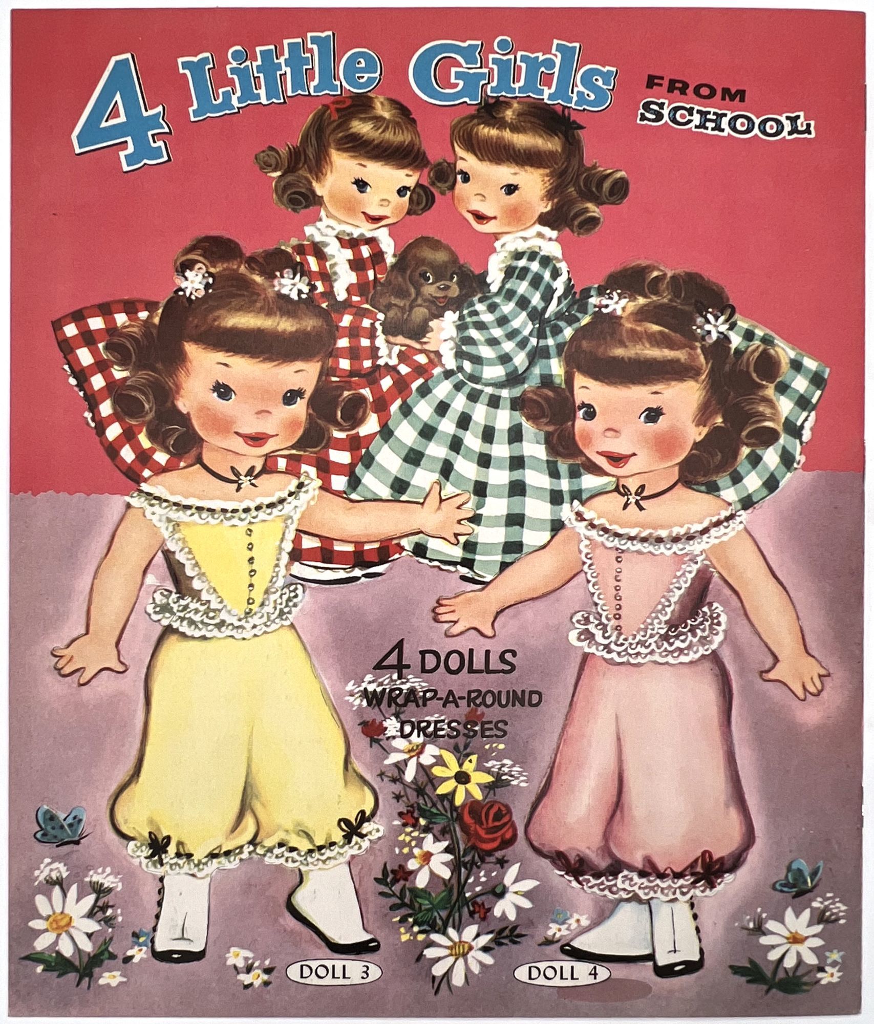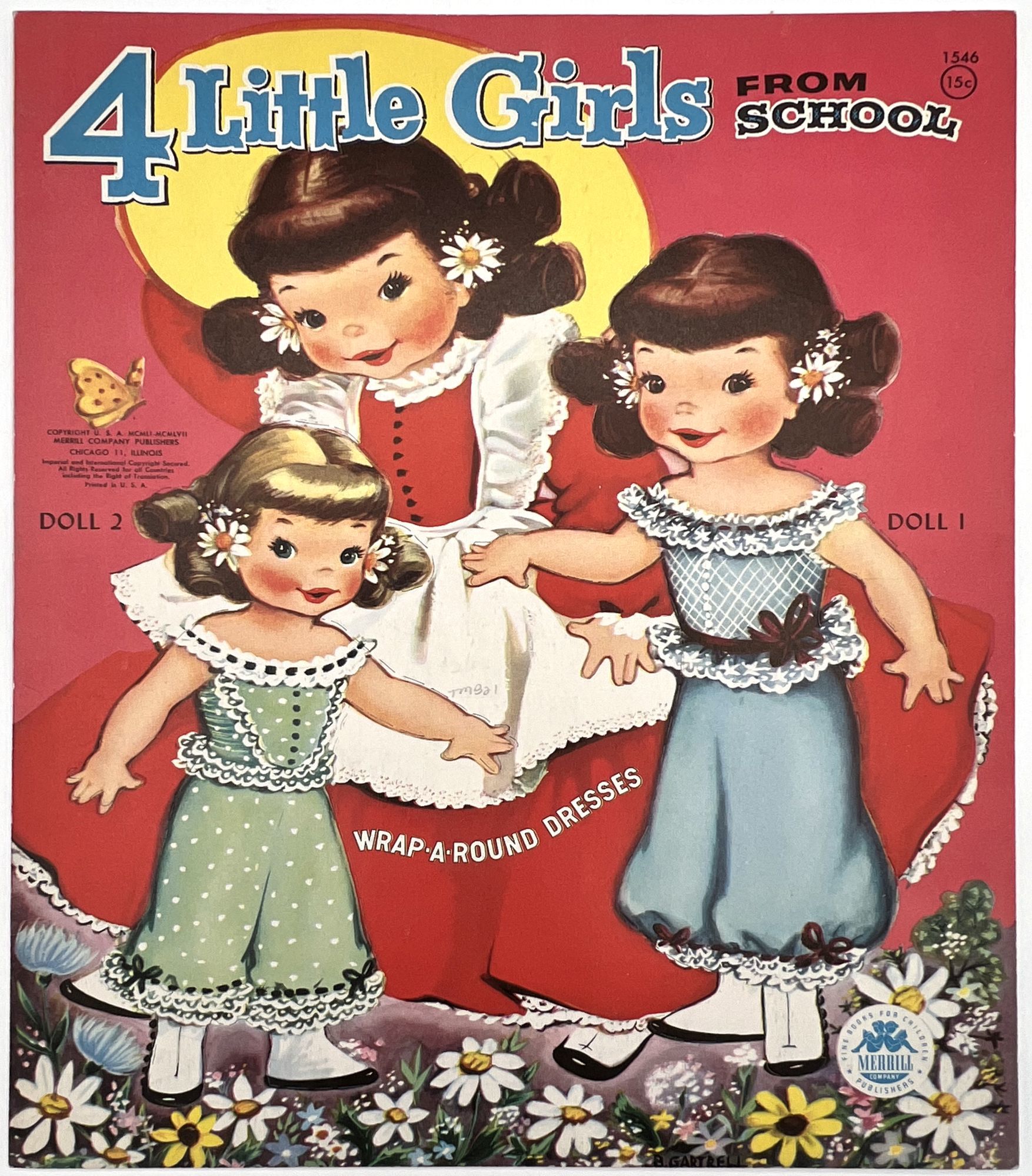 "4 Little Girls from School". Chicago: Merrill Publishers, c.1951. Single vol. (12.5" by 10.25"), 6 leaves of uncut outfit pages, stapled in original illustrated covers with two uncut dolls on each cover.