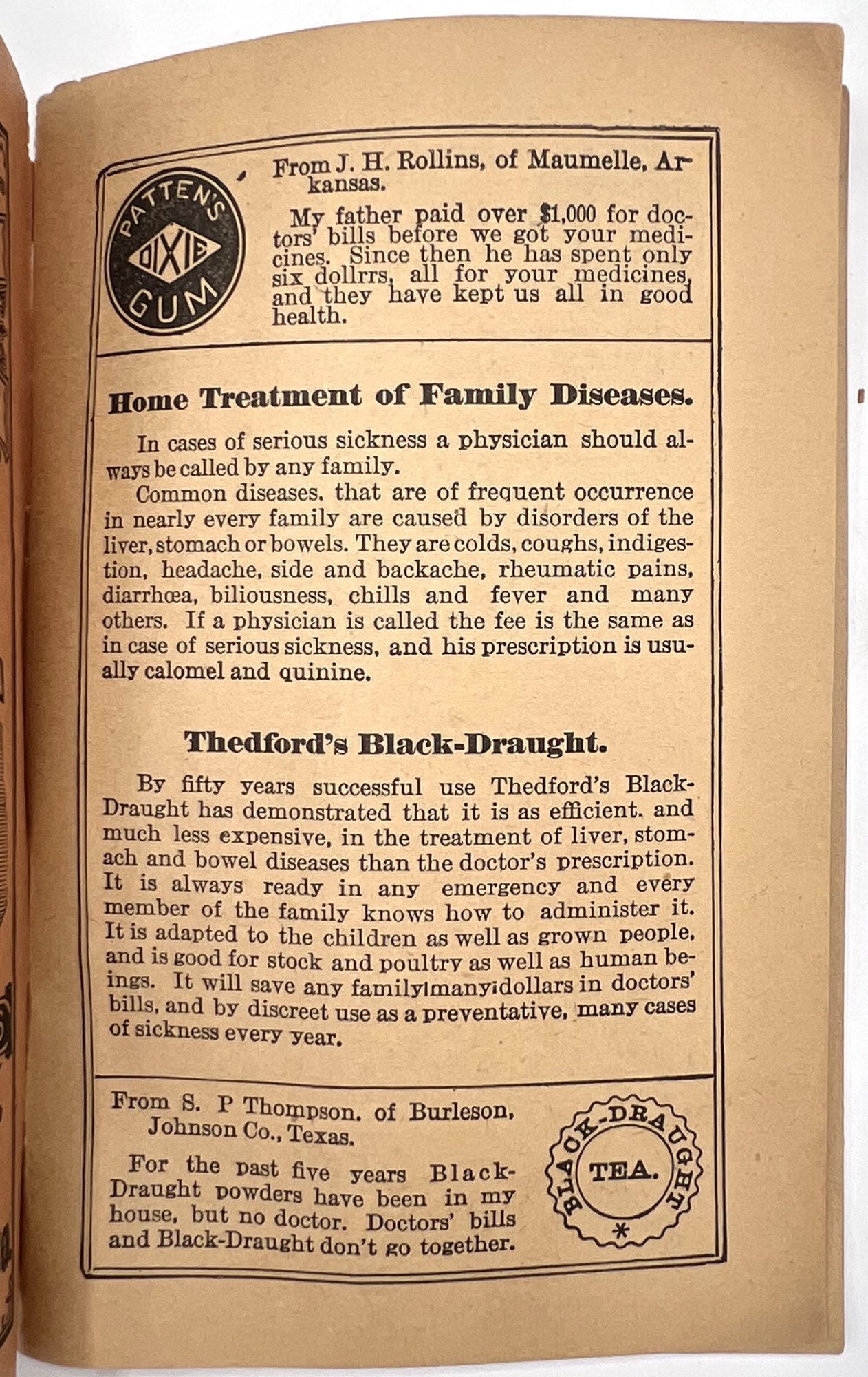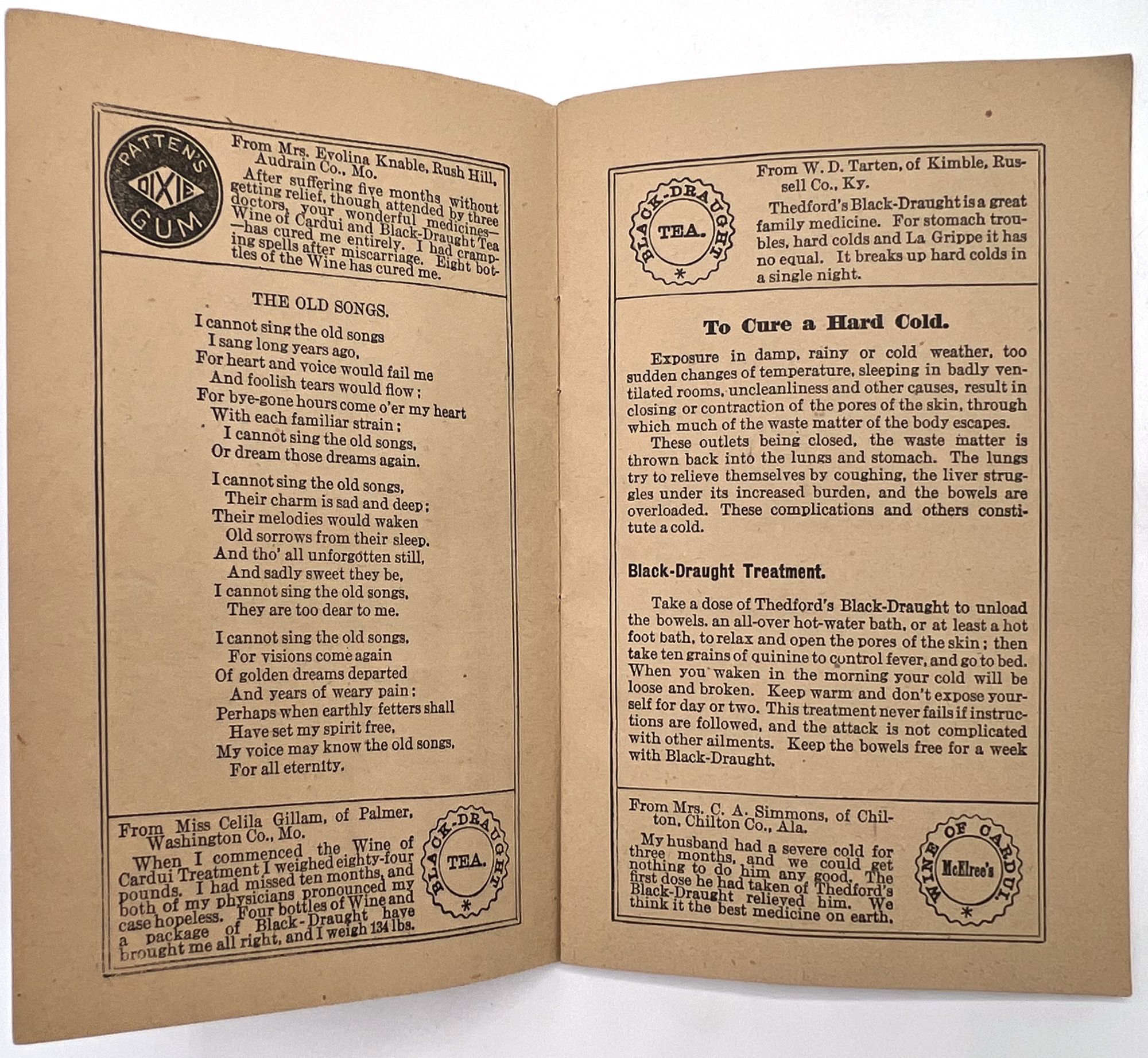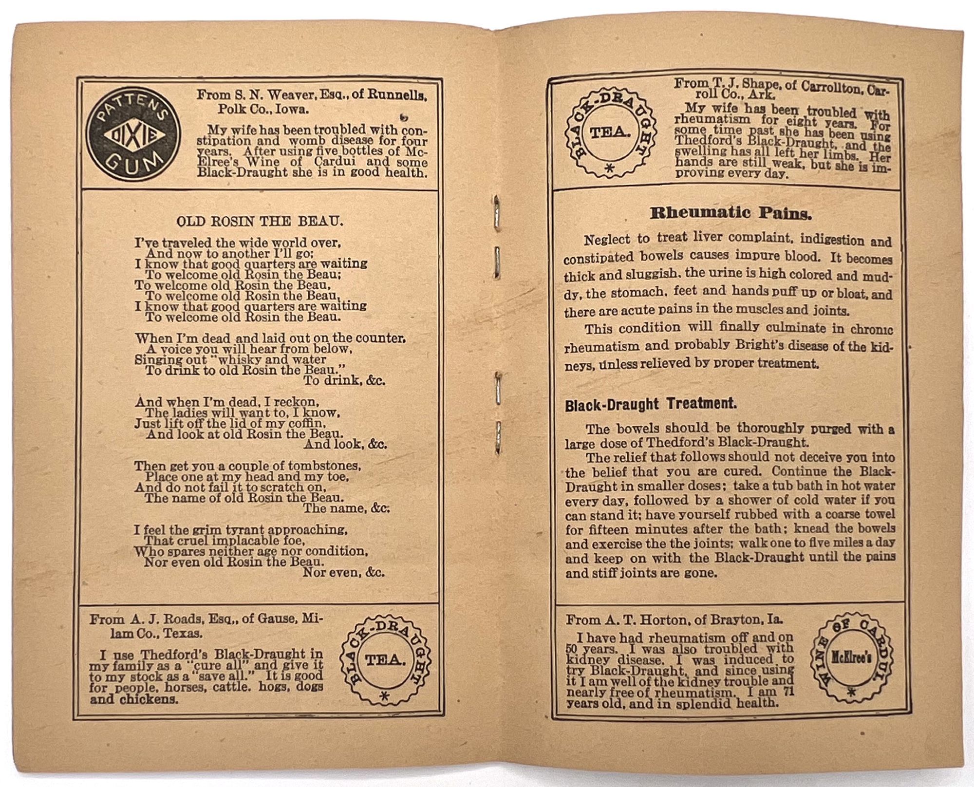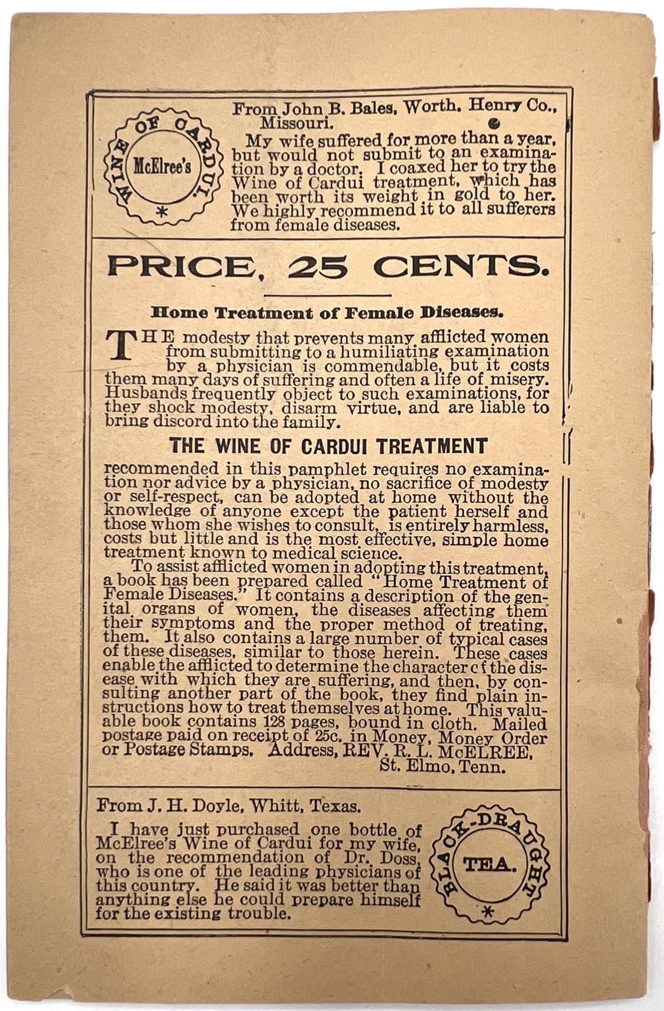 Chattanooga, Tennessee: The Chattanooga Medicine Co, 1880. Good. Toned, chipping. Lower wrapper lacking.. A scarce pocket-sized songster advertising patent medicines sold by the Chattanooga Medicine Company, for the treatment and prevention of common family illnesses ranging from coughs and colds to rheumatism and "female diseases" (e.g. painful or delayed menstruation). Note the way in which the medicine for "female diseases" is marketed on the last page via a testimonial from a man, not a woman: "My wife suffered for more than a year, but would not submit to an examination by a doctor. I coaxed her to try the Wine of Cardui treatment, which has been worth its weight in gold". Each recto in the songster offers medical advice and testimonials, and each verso has different song lyrics. Song titles include: "My Sweetheart's the Man in the Moon"; "I Whistle and Wait for Katie"; and "Willow, Titwillow". An interesting and scarce example of the kind of ephemera produced by pharmaceutical companies to sell medicine to American families at this time. Single vol. (5.75" by 3.75"), pp. [30], in original illus. wrps. with wood engraving of a hiker "gathering roots and herbs at Lookout Mountain Tenn. for" the company. The Chattanooga Medicine Company was founded in 1879 and became best known for selling pain relievers family medicines including laxatives and panaceas for women's health ailments. The company continued well into the 20th century and expanded, interestingly, into producing K-Rations during WWII.