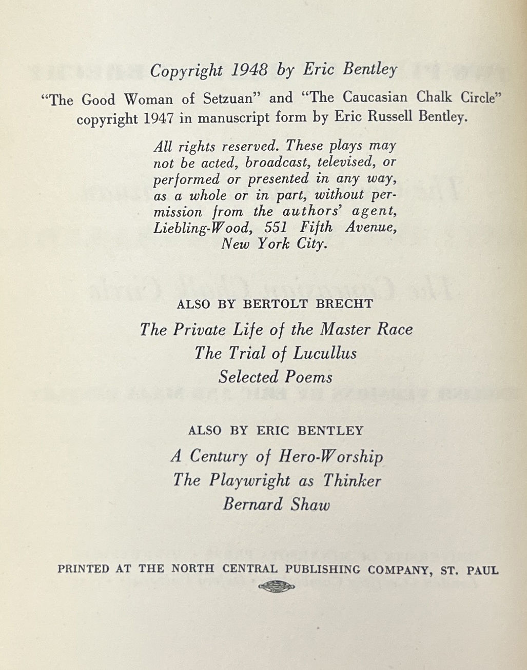 Minneapolis: University of Minnesota Press, 1958. First Edition. Hardcover. Very Good/Very Good. English version by Eric and Maja Bentley. Very Good in a Very Good jacket, unclipped but struck-through ($3.50), generally toned and rubbed, a chip at the bottom edge of the back panel. Black boards, rubbed at the bottom edge, with white ink lettering on the spine and front board. Square and firmly bound, clean internally. The first book appearance in any language of these two plays by the author of The Threepenny Opera.