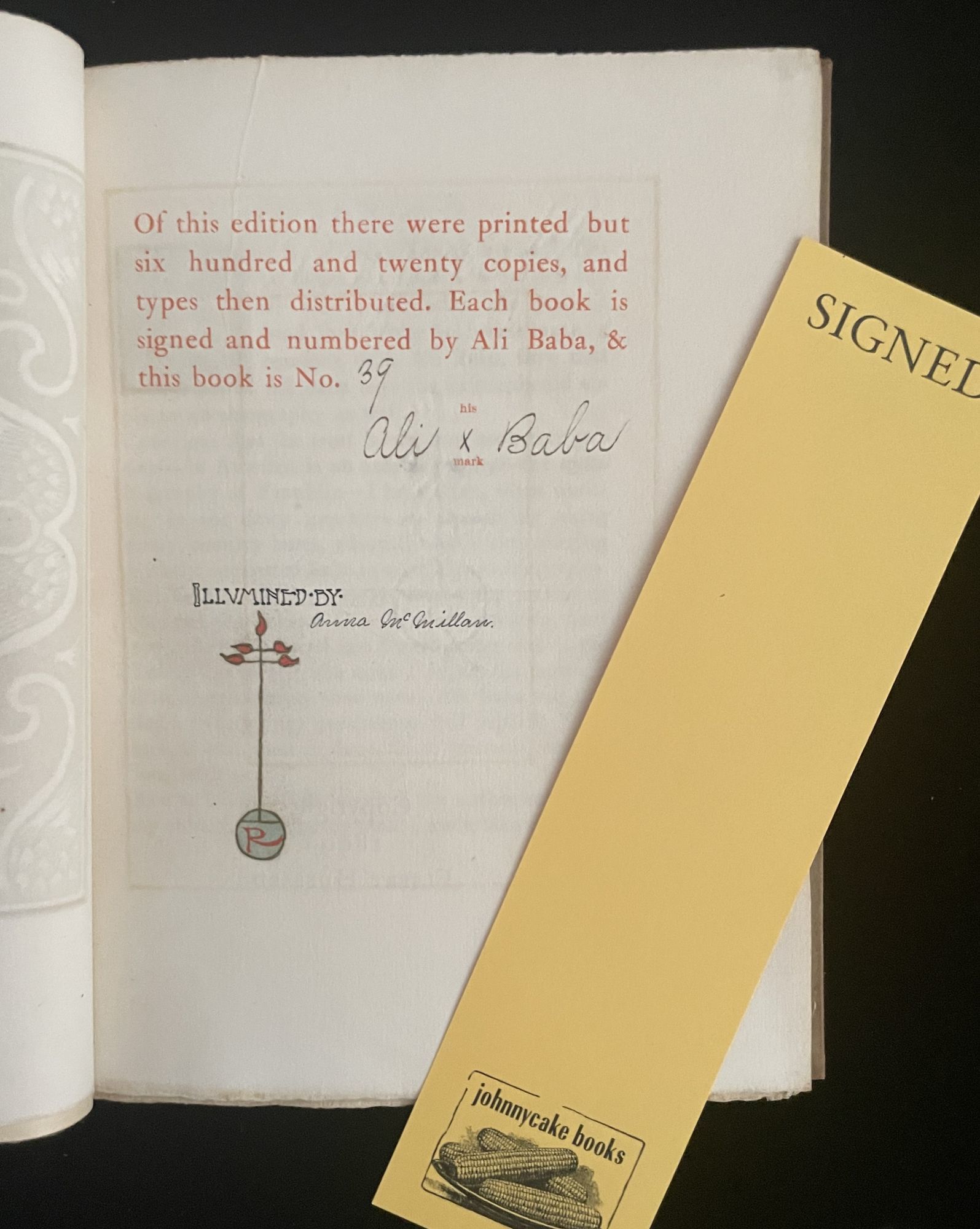 East Aurora, NY: Elbert Hubbard (Roycrofters), 1899. 1st Edition. Hardcover. Very Good. 8vo, quarter suede leather over light brown paper boards, gilt titles front cover, gilt titles on brown leather label to spine, frontispiece portrait, 150p, sides untrimmed. Limited edition, hand numbered 39/620 and signed by "Ali Baba". Illuminated by Anna McMillan, and signed by her next to her hand-illuminated Roycrofters device on limitation page. Also inscribed by Hubbard on the ffe: "To a Good Man + True from 'Fra Elbertus' Platt Dec25, 1899" Suede spine dulled, with shallow loss at head, covers moderately soiled. Internals fine, binding firm.