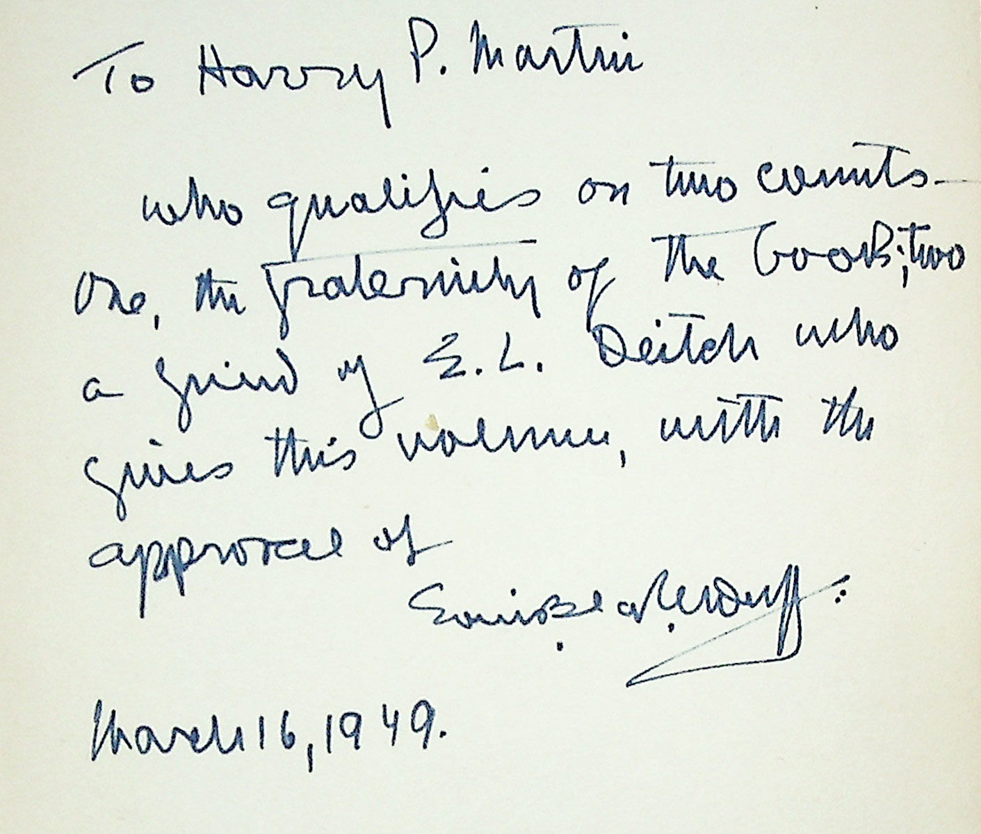 Toronto: The Ryerson Press, 1949. First Edition. First printing. Inscribed on the front endpaper: "To Harry P. Martin / who qualifies on two counts - one, the fraternity of the book; two a friend of E.L. Deitch who gives this volume, with the aproval of / Louis Blake Duff," dated March, 1949. Octavo (20cm). Yellow cloth; dustwrapper; 224pp. Tight, straight, and unmarked; Near Fine. In the original pictorial dustwrapper, slightly soiled on lighter portions; small sticker remnant to front panel; Very Good.