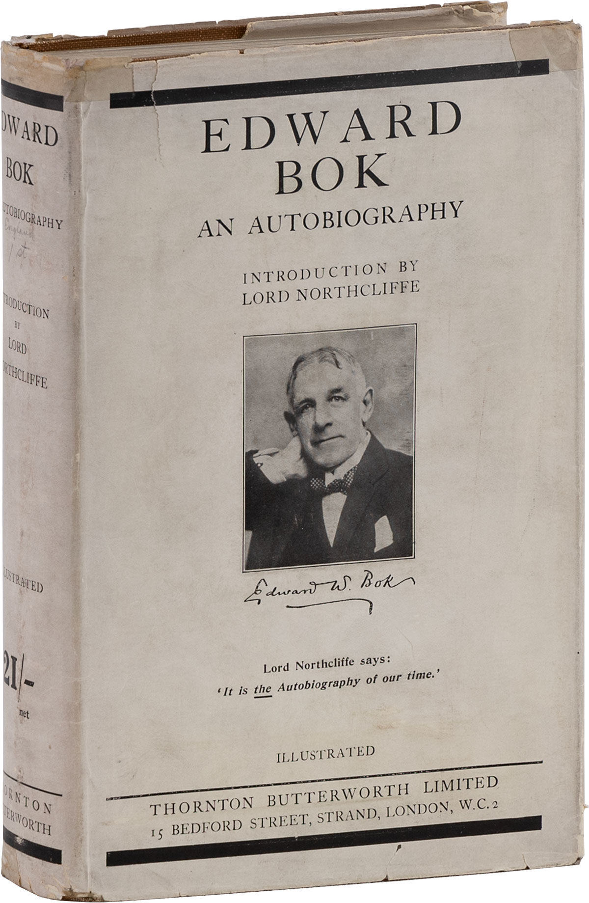 London: Thornton Butterworth Ltd, 1921. First U.K. Edition. Signed by Bok on front endpaper, and further inscribed in his hand: "Abridged edition published in London June 1921...American portions omitted for then-existing political conditions which tended towards an anti-American feeling." Octavo. Tan publisher's cloth; dustjacket; 318pp; bottom and fore-edges untrimmed. Tight and straight, Near Fine; in the original dustwrapper, lightly rubbed and soiled, with clear-tape reinforcements at spine ends; Very Good. "Priced 21/– net" on spine panel.