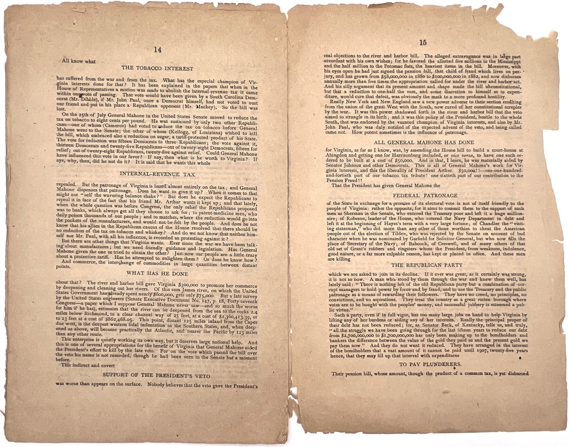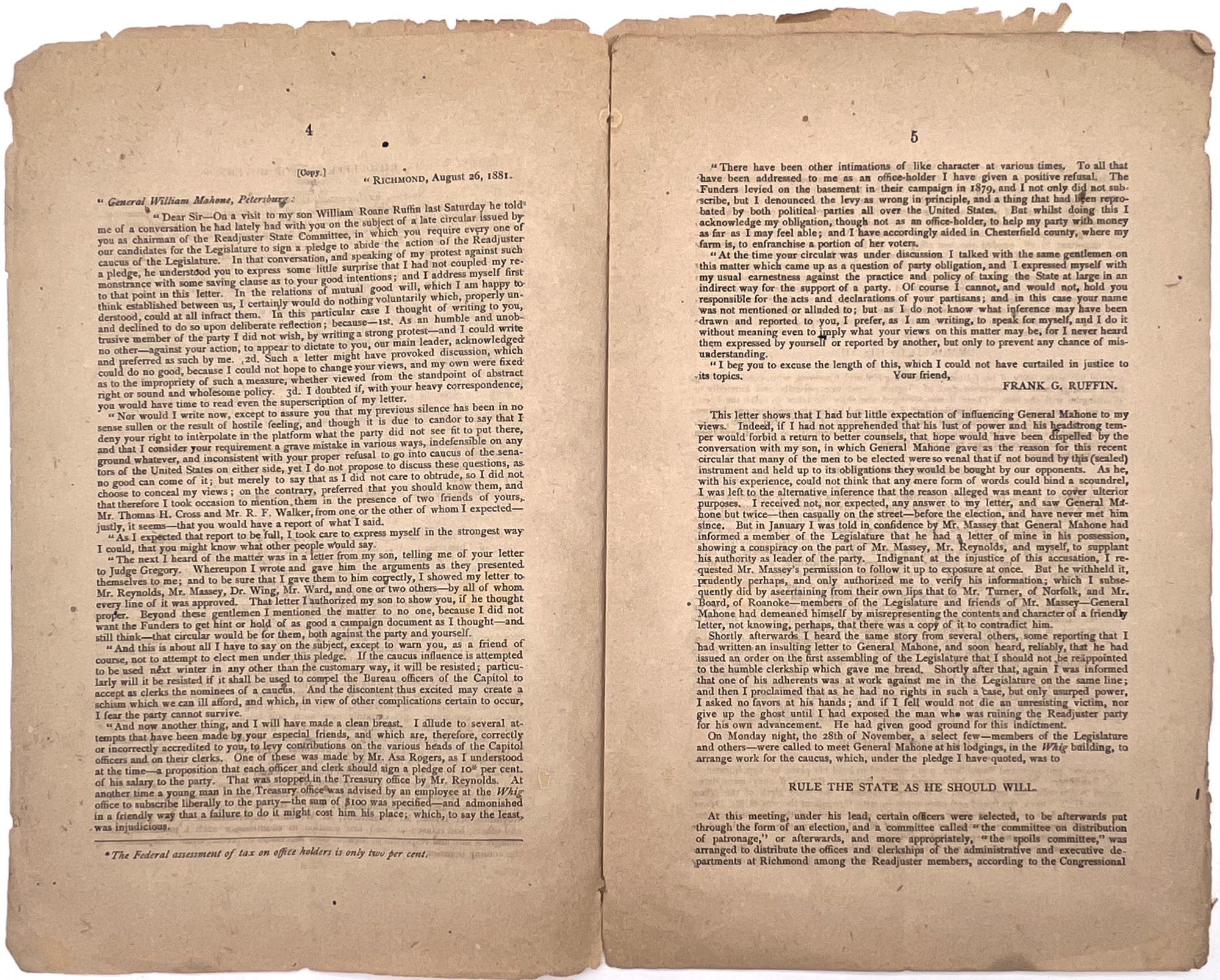 [Richmond, Virginia], 1882. Good to very good. Toned with short tears, wear.. Virginians Will Not Wear Collars": a salient political pamphlet on postbellum Virginian politics, featuring a letter to John E. Massey from Francis Gildart Ruffin (1816-1892), a Chesterfield County, Virginia planter, Confederate colonel, and political writer. Written during the turbulent Reconstruction period, in which the Virginia "Readjuster Party", lead by William Mahone, sought to re-appropriate power and wealth held by white planters in the state in order to pay down debt and promote education. Single vol. (9.5" by 6"), pp. 16, unbound.