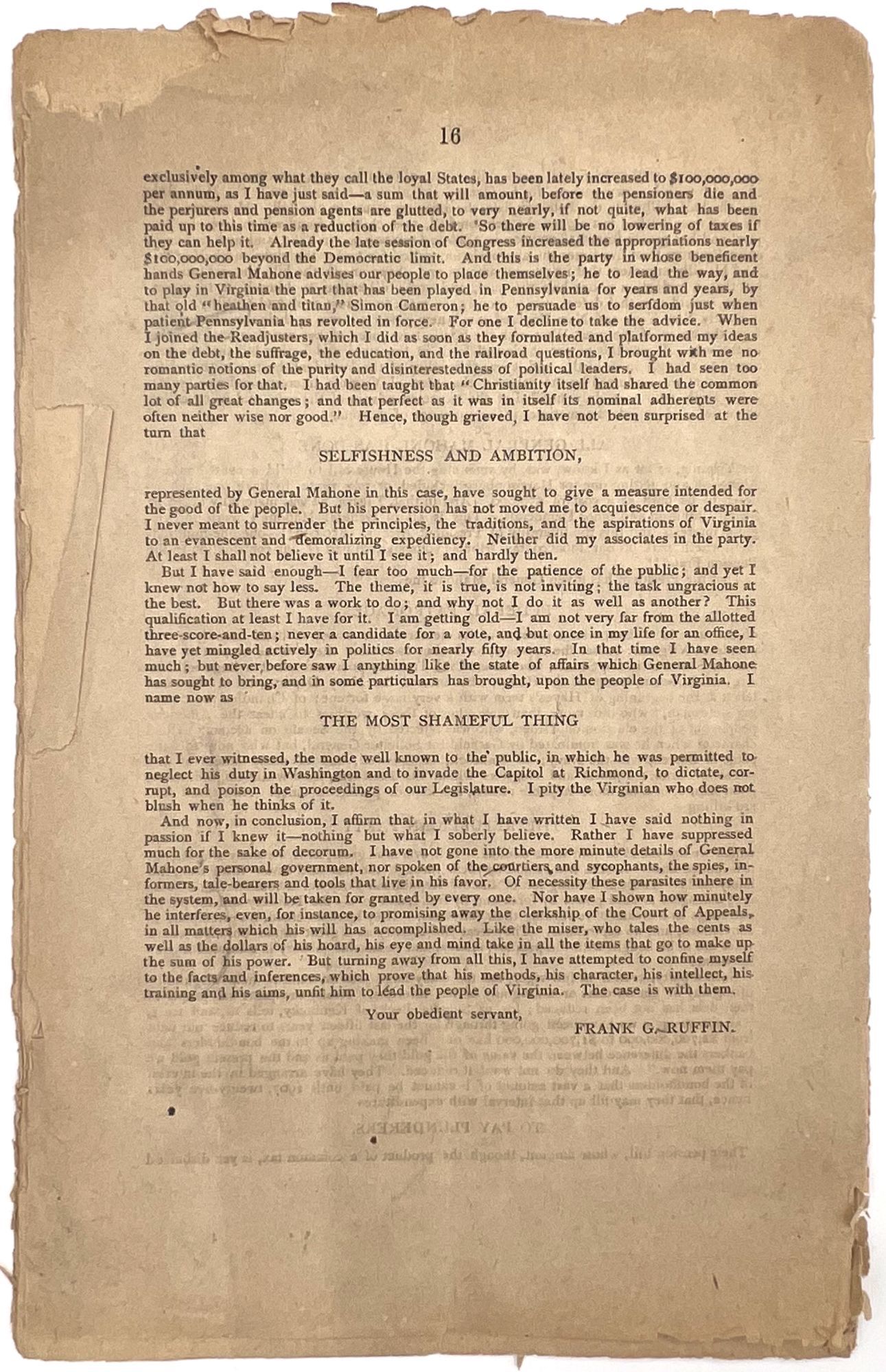 Colonel Frank G. Ruffin's letter. A terrible arraignment. Mahoneism unveiled! The great plot to sell out Virginians to the Republican Party exposed. The Republican Party now and always the bitterest foes of Virginia. Virginians will not wear collars