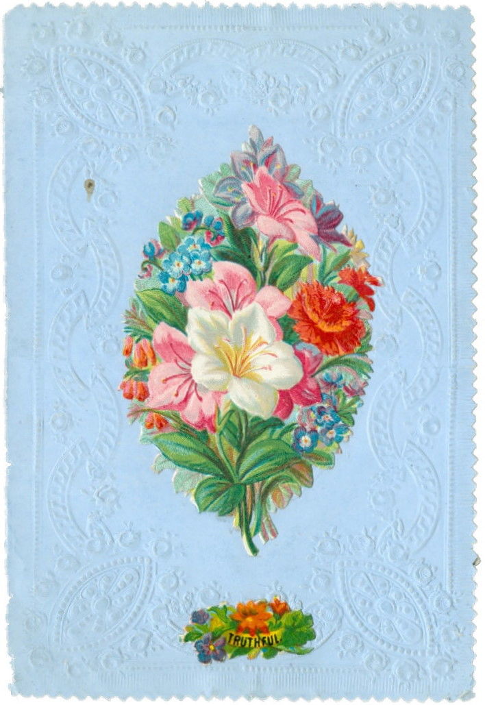A single fold embossed valentine with an applied scrap depicting an array of spring flowers. A small floral scrap that reads, "Truthful." Condition: small area of discoloration upper left. Scrapbook residue and pencil inscription on reverse.