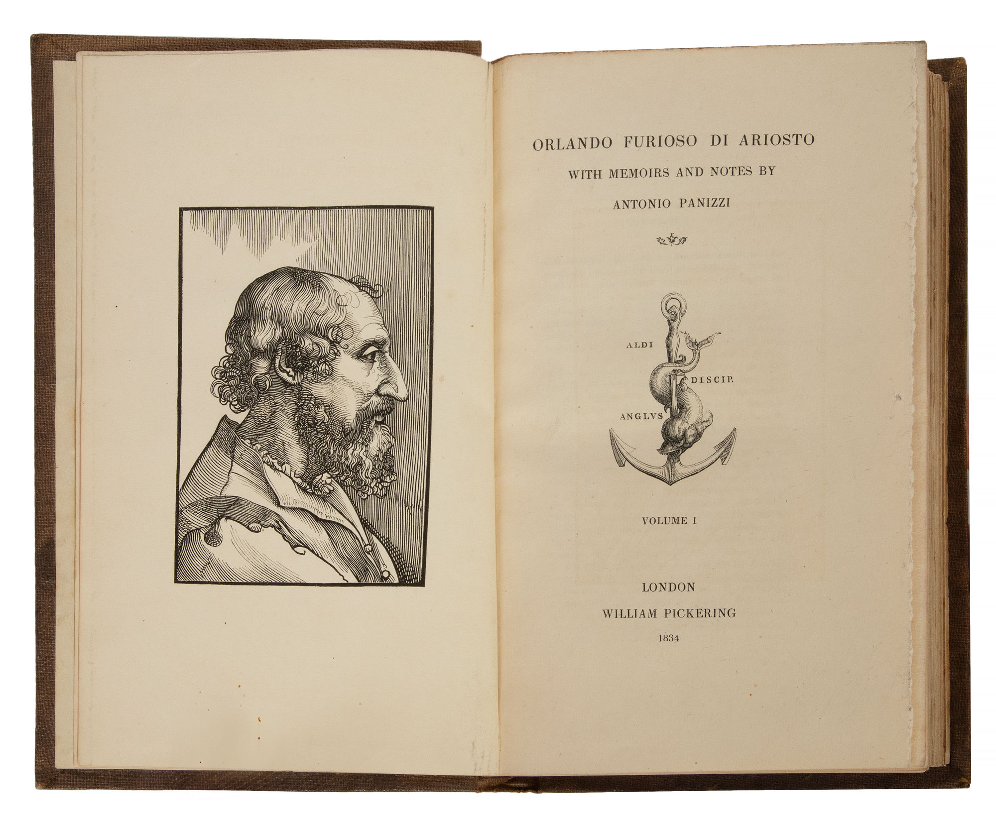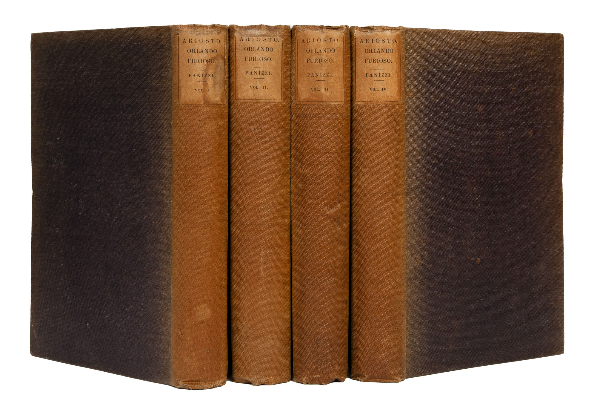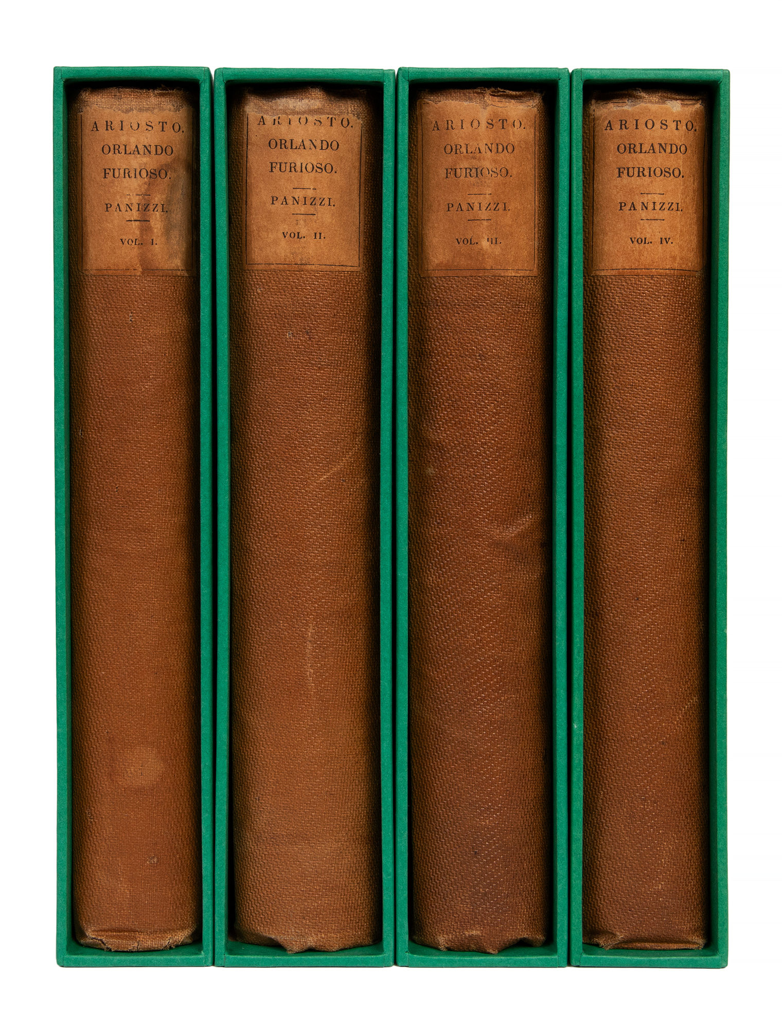 London: William Pickering, 1834. First Panizzi edition of Ariosto’s Orlando Furioso, issued in four volumes by William Pickering in 1834, from the celebrated library of Frances Mary Richardson Currer. Set during the Saracen invasion of France, Orlando Furioso (1516-1532) follows the adventures of Charlemagne’s high-strung knight Orlando, who goes mad for love. Ariosto’s comic epic was hugely influential, going on to inspire works as various as The Faerie Queene, Much Ado About Nothing, Don Quixote, and Don Juan. Pickering issued this set as a companion to Panizzi’s 1830 edition of Boiardo’s Orlando Innamorato. It was Pickering’s practice to keep his books in sheets and bind them over time: the morocco-grain cloth used on this set likely dates from slightly later in the nineteenth century. This copy of Orlando Furioso contains the bookplates and purchaser’s note of Yorkshire coal heiress Frances Mary Richardson Currer (1785-1861), who built a celebrated library of some 20,000 volumes. Contemporaries praised Currer’s scholarship and taste, as well as the rigorous organization and “choice condition” of her books. The bibliographer Thomas Frognall Dibdin called her a “book-genius,” and remarked of her library: “The ‘Collections’ are nearly perfect.” In 1820, and again in 1833, Currer issued a catalogue of her holdings, widely viewed as “the model catalogue of a private library” (DNB), and sent copies to book collectors across England and Europe, including members of the newly formed Roxburghe Club, quietly asserting her place among them. Also known for her commitment to charitable causes, Currer is obliquely noted as a “wealthy lady, in the West Riding of Yorkshire” who paid off the debts of a new widower, Patrick Brontë; scholars speculate that Charlotte Brontë’s unusual pen name, Currer Bell, is a tribute to Frances Currer. Text in Italian. See Keynes, William Pickering, Publisher. A near-fine copy, in the publisher’s cloth, with excellent bibliophilic provenance. Four octavo volumes, measuring 7.5 x 4.5 inches: [vii]-viii, clxxvi, 198; [4], 436; [4], 424; [4], 330, 79, [1]. Original publisher’s morocco-grain plum cloth, printed paper spine labels, text uncut and partially unopened. Woodcut frontispiece portrait after Titian; woodcut publisher’s device to title pages. Bookplates of Frances Mary Richardson Currer and John Porter; Porter’s Pickering collection label to rear pastedown of Volume I. Ink note in Currer’s hand to verso of front free endpaper of Volume I: “Russell Smith – 13s: 6d.” Spines sunned and slightly bubbled, light scattered foxing. Housed in later green card slipcases.