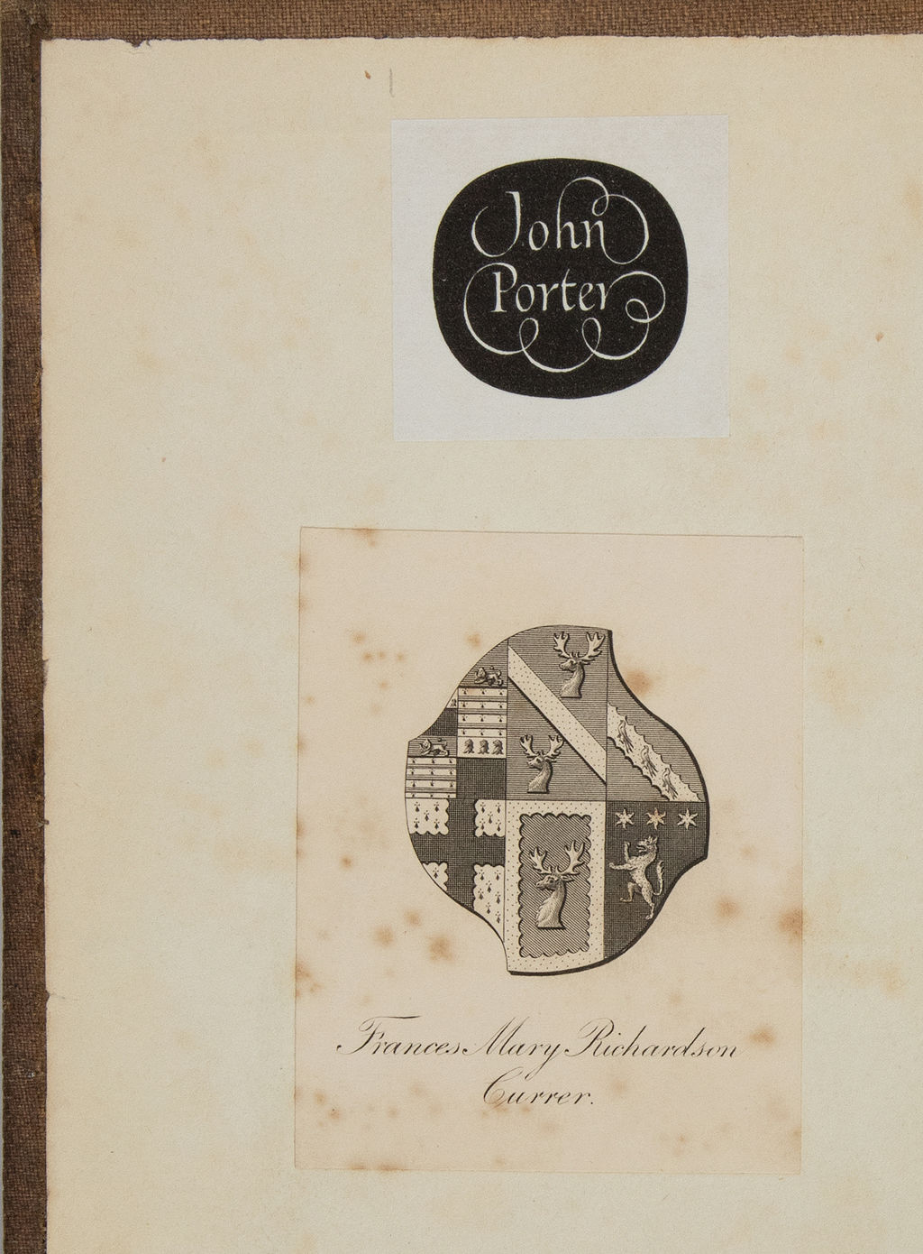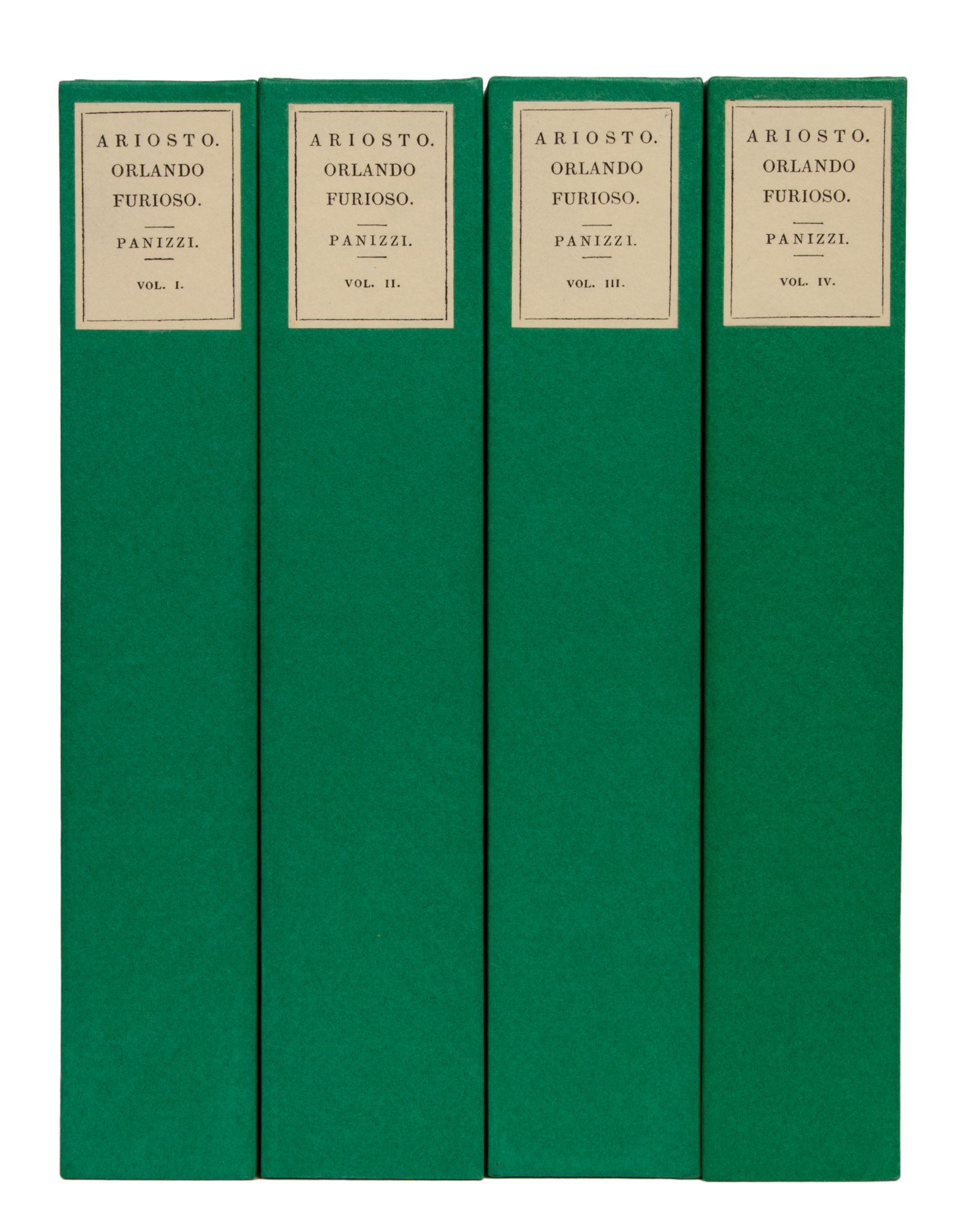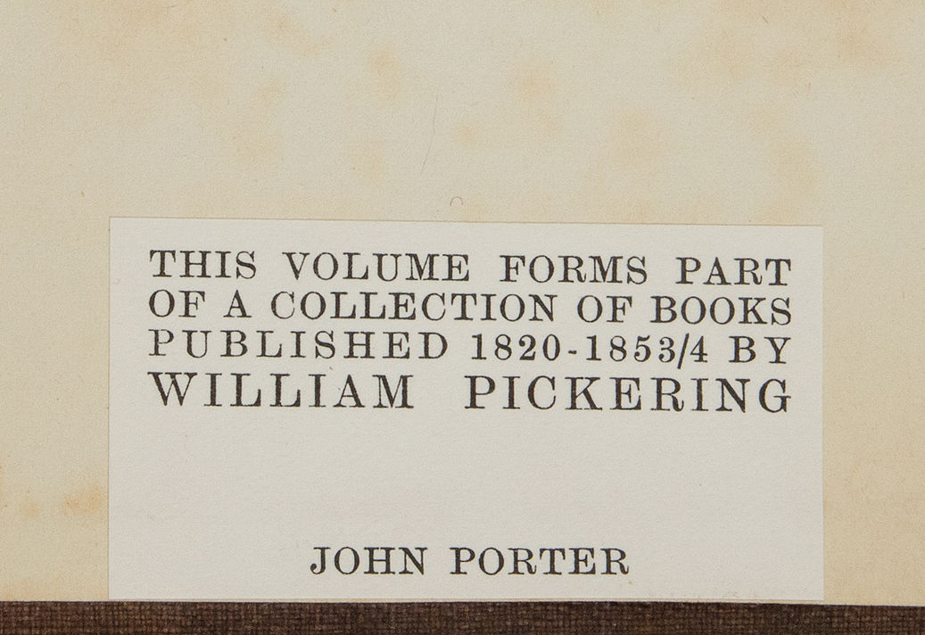London: William Pickering, 1834. First Panizzi edition of Ariosto’s Orlando Furioso, issued in four volumes by William Pickering in 1834, from the celebrated library of Frances Mary Richardson Currer. Set during the Saracen invasion of France, Orlando Furioso (1516-1532) follows the adventures of Charlemagne’s high-strung knight Orlando, who goes mad for love. Ariosto’s comic epic was hugely influential, going on to inspire works as various as The Faerie Queene, Much Ado About Nothing, Don Quixote, and Don Juan. Pickering issued this set as a companion to Panizzi’s 1830 edition of Boiardo’s Orlando Innamorato. It was Pickering’s practice to keep his books in sheets and bind them over time: the morocco-grain cloth used on this set likely dates from slightly later in the nineteenth century. This copy of Orlando Furioso contains the bookplates and purchaser’s note of Yorkshire coal heiress Frances Mary Richardson Currer (1785-1861), who built a celebrated library of some 20,000 volumes. Contemporaries praised Currer’s scholarship and taste, as well as the rigorous organization and “choice condition” of her books. The bibliographer Thomas Frognall Dibdin called her a “book-genius,” and remarked of her library: “The ‘Collections’ are nearly perfect.” In 1820, and again in 1833, Currer issued a catalogue of her holdings, widely viewed as “the model catalogue of a private library” (DNB), and sent copies to book collectors across England and Europe, including members of the newly formed Roxburghe Club, quietly asserting her place among them. Also known for her commitment to charitable causes, Currer is obliquely noted as a “wealthy lady, in the West Riding of Yorkshire” who paid off the debts of a new widower, Patrick Brontë; scholars speculate that Charlotte Brontë’s unusual pen name, Currer Bell, is a tribute to Frances Currer. Text in Italian. See Keynes, William Pickering, Publisher. A near-fine copy, in the publisher’s cloth, with excellent bibliophilic provenance. Four octavo volumes, measuring 7.5 x 4.5 inches: [vii]-viii, clxxvi, 198; [4], 436; [4], 424; [4], 330, 79, [1]. Original publisher’s morocco-grain plum cloth, printed paper spine labels, text uncut and partially unopened. Woodcut frontispiece portrait after Titian; woodcut publisher’s device to title pages. Bookplates of Frances Mary Richardson Currer and John Porter; Porter’s Pickering collection label to rear pastedown of Volume I. Ink note in Currer’s hand to verso of front free endpaper of Volume I: “Russell Smith – 13s: 6d.” Spines sunned and slightly bubbled, light scattered foxing. Housed in later green card slipcases.