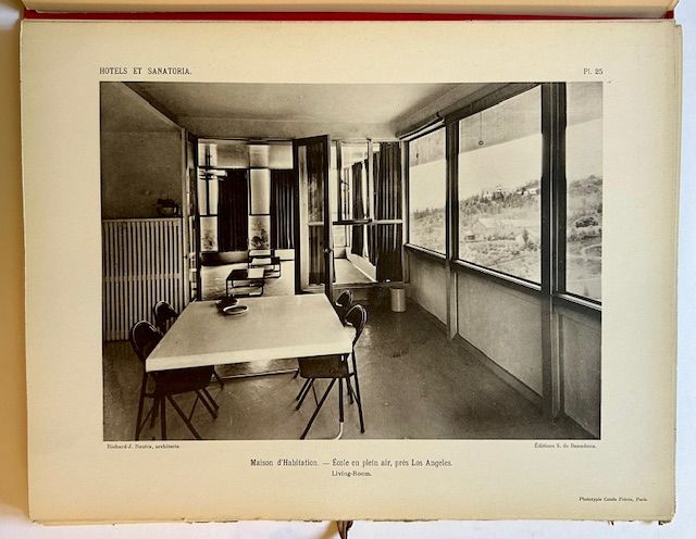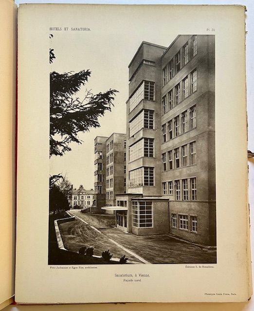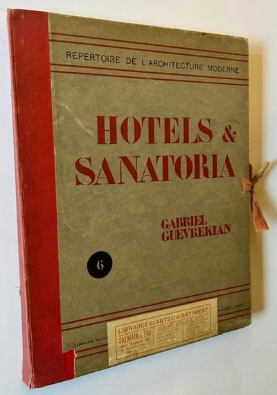 Paris: Bonadona, 1930. Portfolio. Very Good +. Impressive 1930 portfolio of 56 loose collotypes, as issued, each produced by Catala Freres of Paris. All plates (collotypes) crisp, bright and very clean, all documenting "sanatoria" and hotels catering to recovery. Collected by Gabriel Guevrekian (1900-1970), chief architect of Tehran from 1933-1937 and eventual Architecture professor at University of Illinois. The plates are all housed in a printed red and gray chemise, with its original red ribbon-ties fully intact and publisher's import label affixed to the front panel. The chemise is solid and VG, with light wear along the spine and very mild scuffing to the panels.