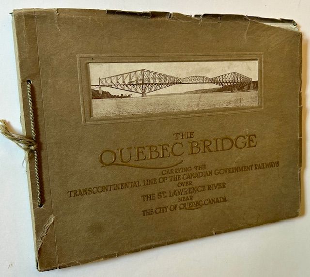 The Canadian Bridge Company, Ltd, 1918. Card Wrappers. Very Good. Fascinating booklet describing in words and crisp black-and-white photographs the --often fraught-- history of the construction of The Quebec Bridge. Solid and VG to VG+ in its ribbon-tied gray wrappers, with mounted photo of the completed bridge. One 2" closed tear along the front panel's bottom-edge, light soiling along the edges of the first several pages and mild chipping along the top-edges. Still though, presentable and well-preserved, Oblong quarto, 80 remarkable photos all told plus charts and diagrams, in addition to a detailed text.