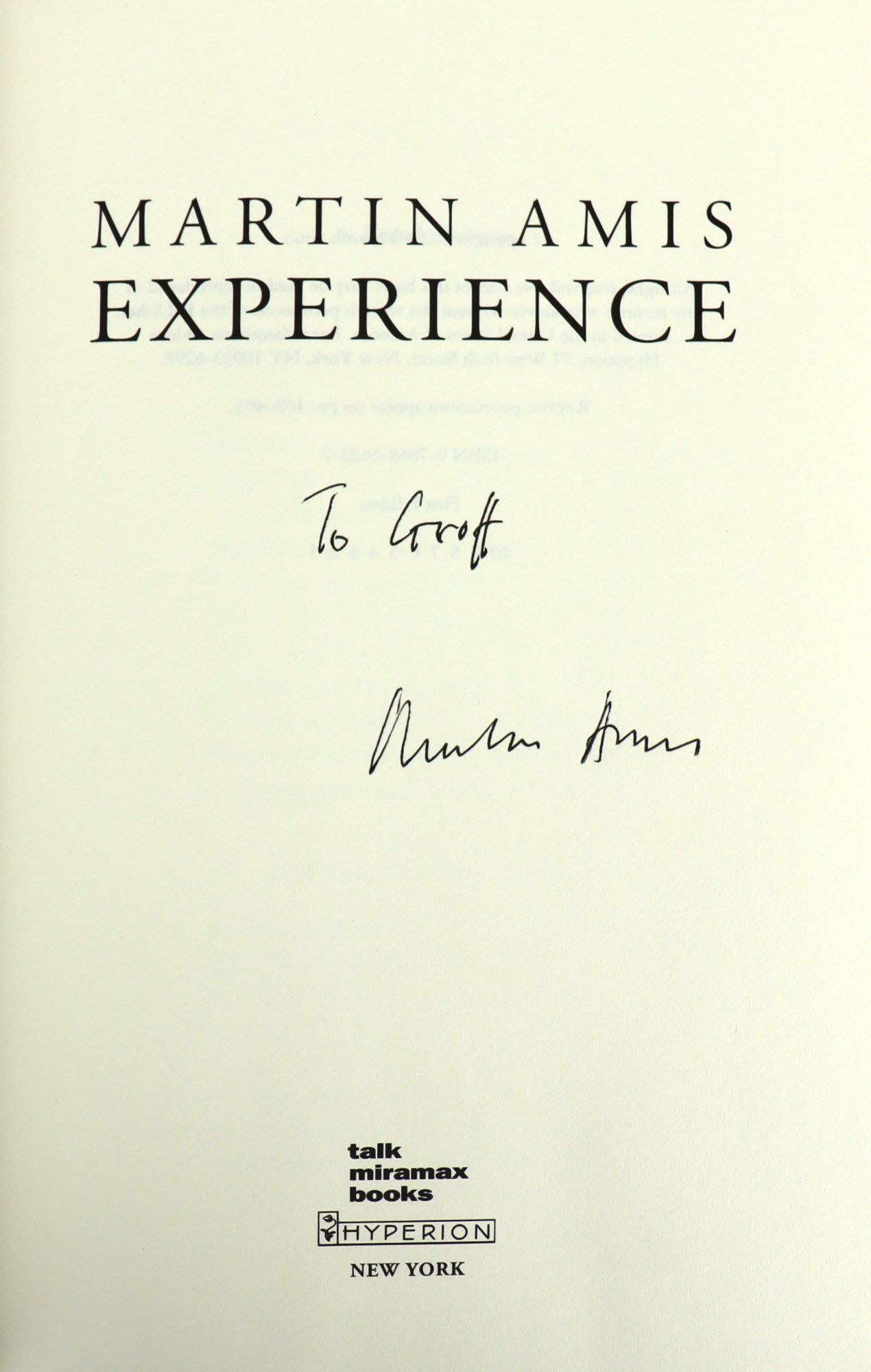 Signed by Martin Amis on title page with inscription "To Groff." The memoir recounts his relationship with his author father, Kingsley Amis, and the changing literary landscape of Britain and America.