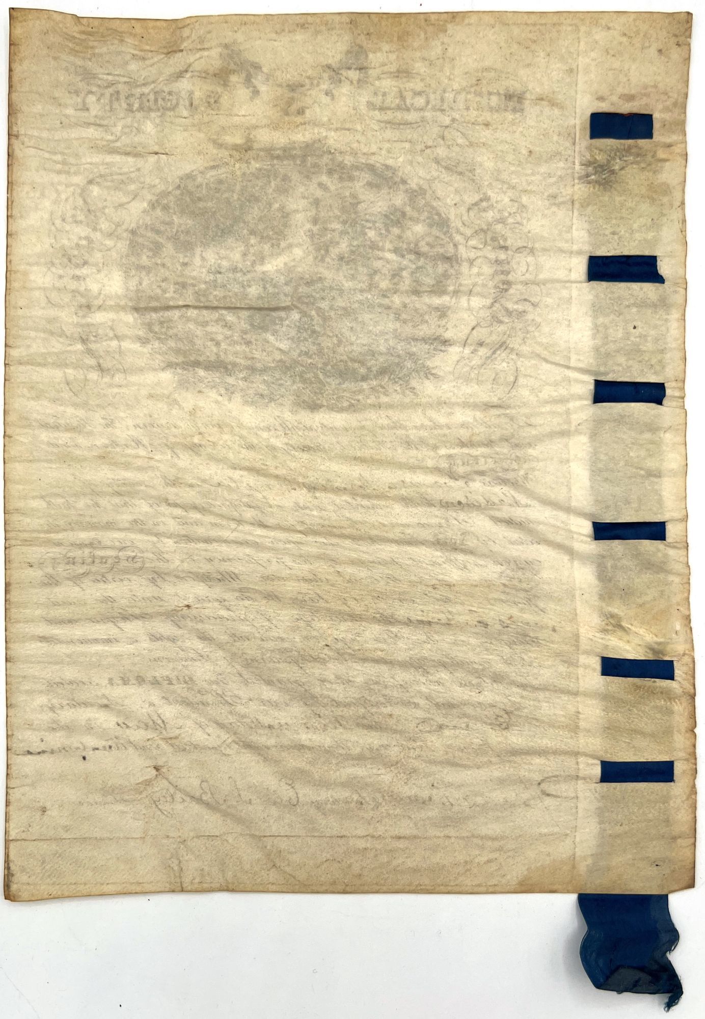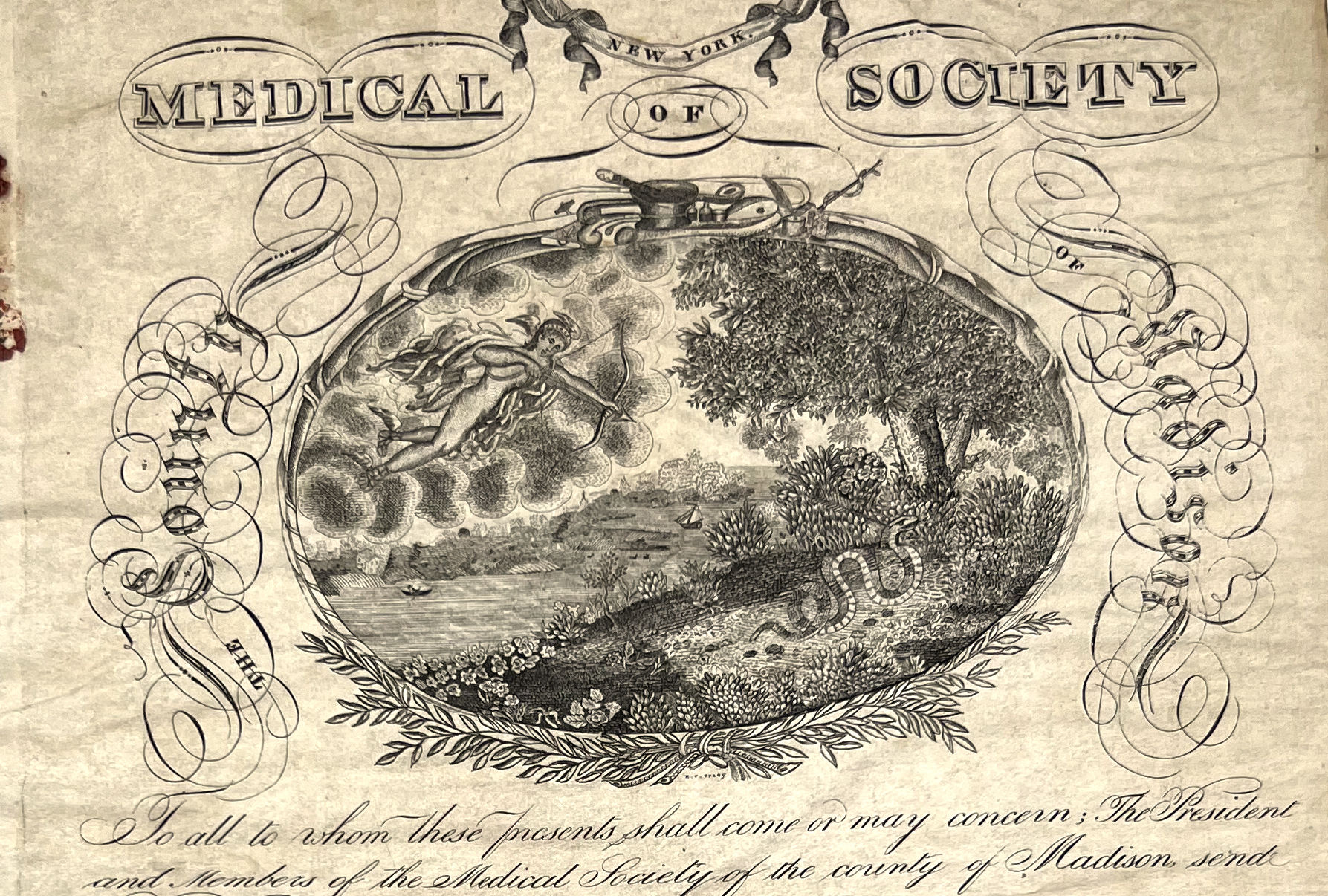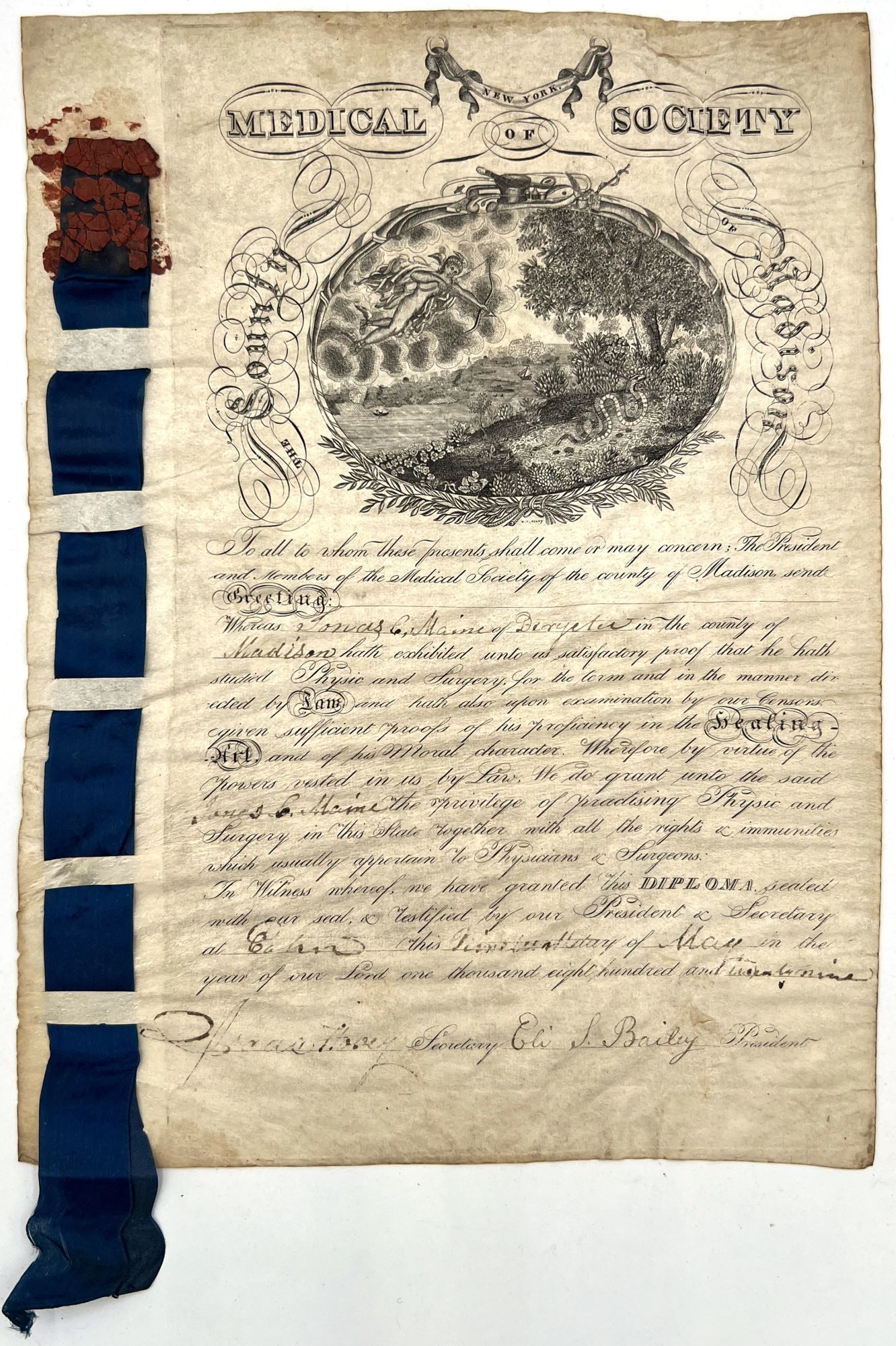DeRuyter, New York: Medical Society of New York, 1829. Good to very good. Wrinkled with some dust soiling, toning, wear/damage to wax seal.. Original parchment diploma certifying "proficiency in the healing art" for Jonas C. Maine of DeRuyter, Madison County, New York. It is dated May 1829, and is signed by the President and Secretary of the Medical Society of New York. Includes a handsome engraved allegorical image of a Hermes in flight, having shot an arrow and pierced a serpent on the forest floor. Engraved parchment leaf measuring approx. 12.25" by 9.75", with blue silk ribbon woven into the left-hand margin and secured with red wax seal. Dr. Jonas Chapman Maine (c.1806) was a renaissance man who worked as a doctor, farmer, and musician, as well as Yale law student and town surveyor in Bolton, Connecticut. He graduated medical school from the Castleton Vermont medical college.