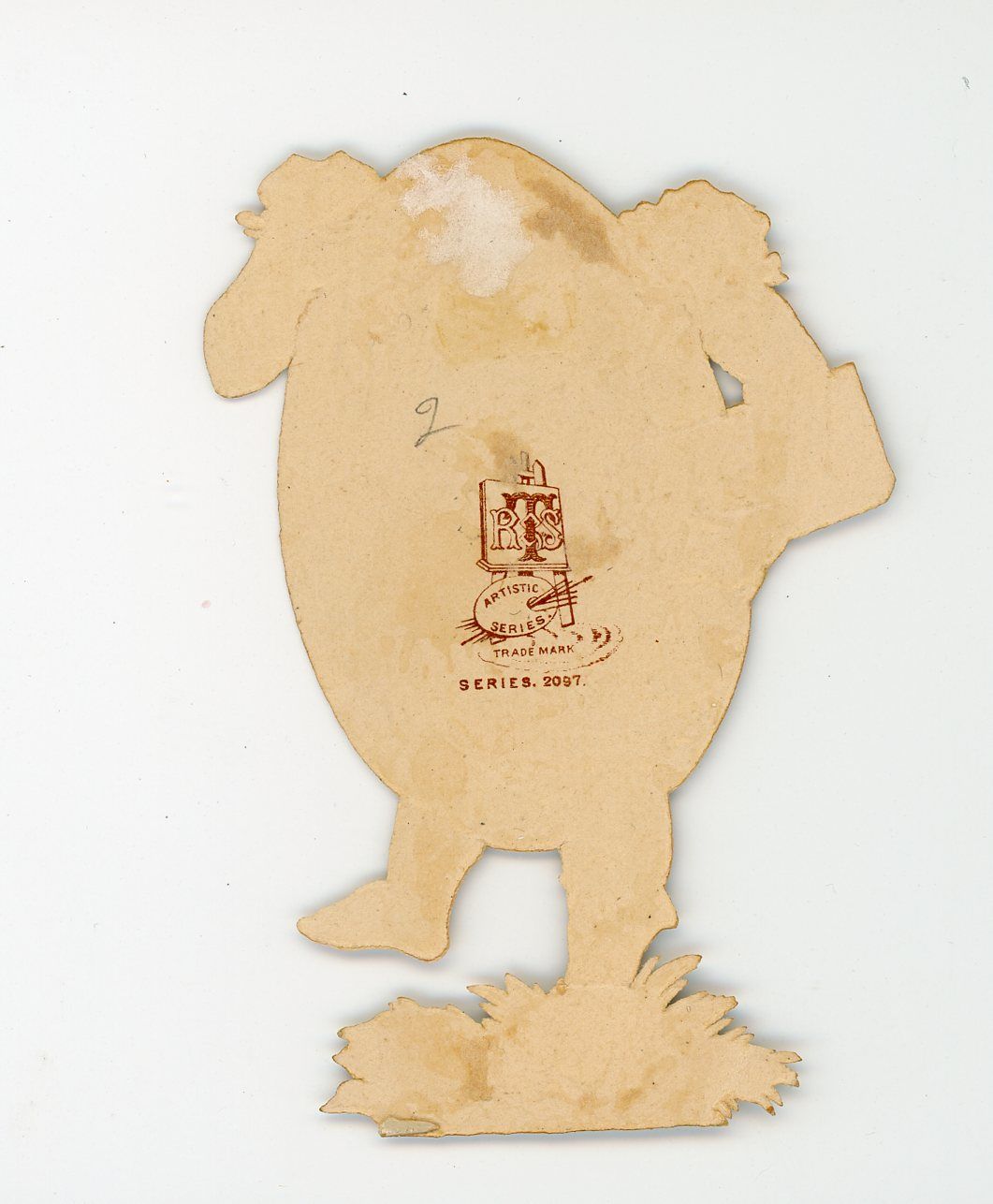 This listing is a 3 3/4" x 2 1/2" embossed die-cut novelty greeting card. It depicts a child hatching from an egg (arms and legs only -- no head yet!). It is captioned "With polite Christmas Regards". Marked Raphael Tuck & Sons, at base and on reverse. Series 2097. Condition: ankle bend; some missing surface litho on arm. Light scrapbook residue on reverse.