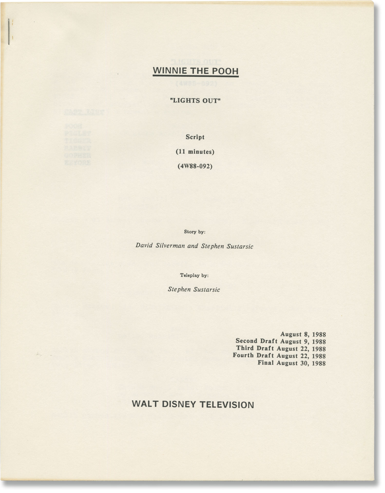 White titled wrappers, lacking rear wrappers, noted as FInal on the front wrapper, production No. 4W88-092, dated August 30, 1988, with credits for Stephen Sustarsic. Title page integral with front wrapper. 24 leaves, with last page of text numbered 23. Xerographic duplication, rectos only. Pages Near Fine, wrapper Near Fine, bound with a staple at the top left corner.