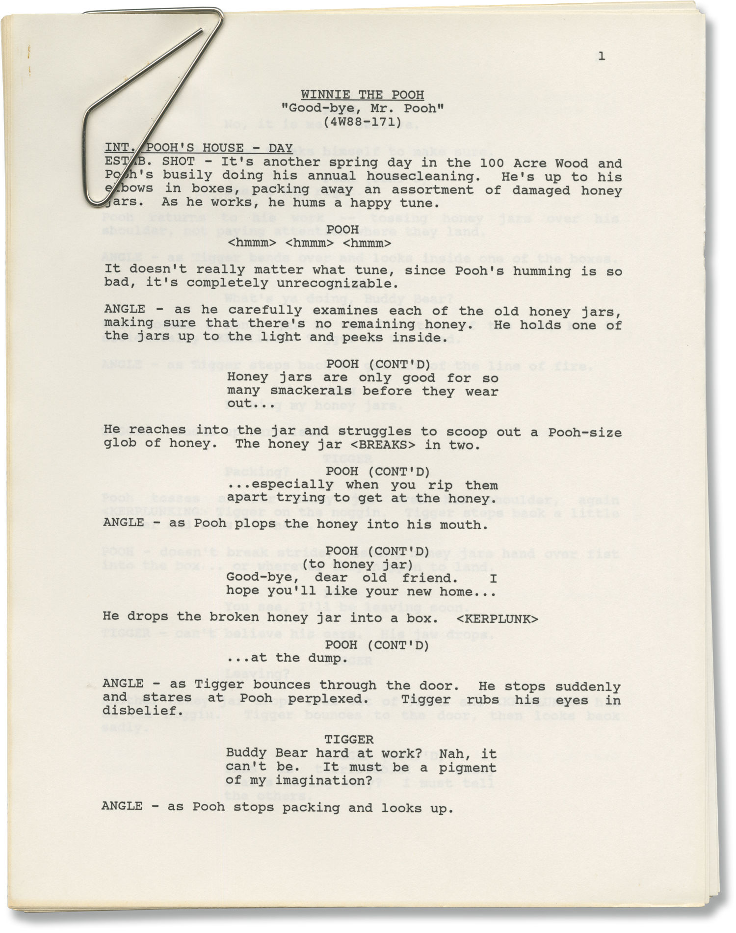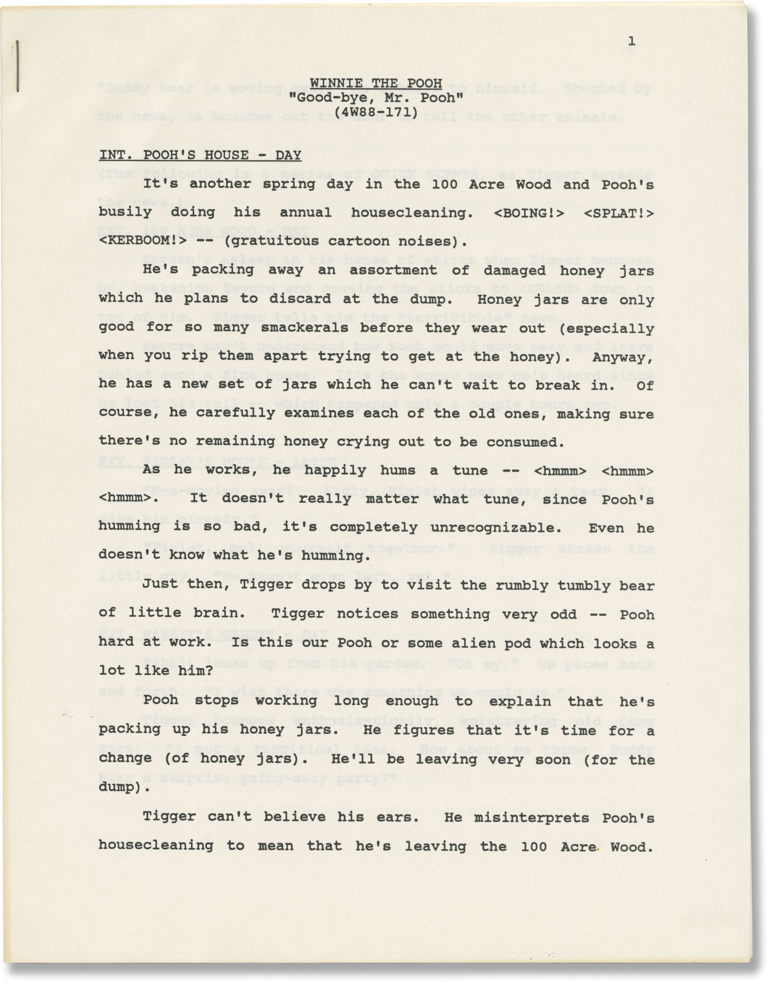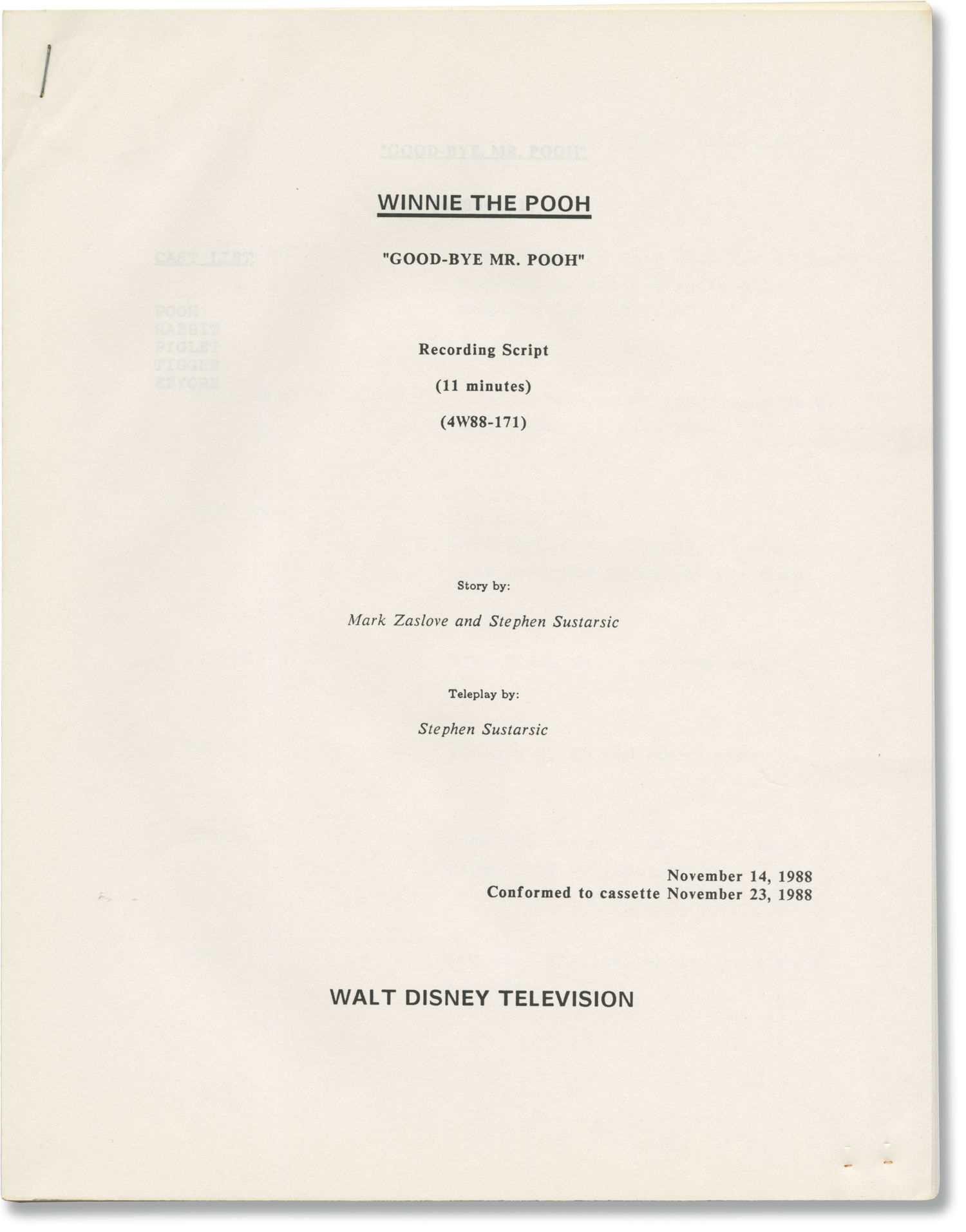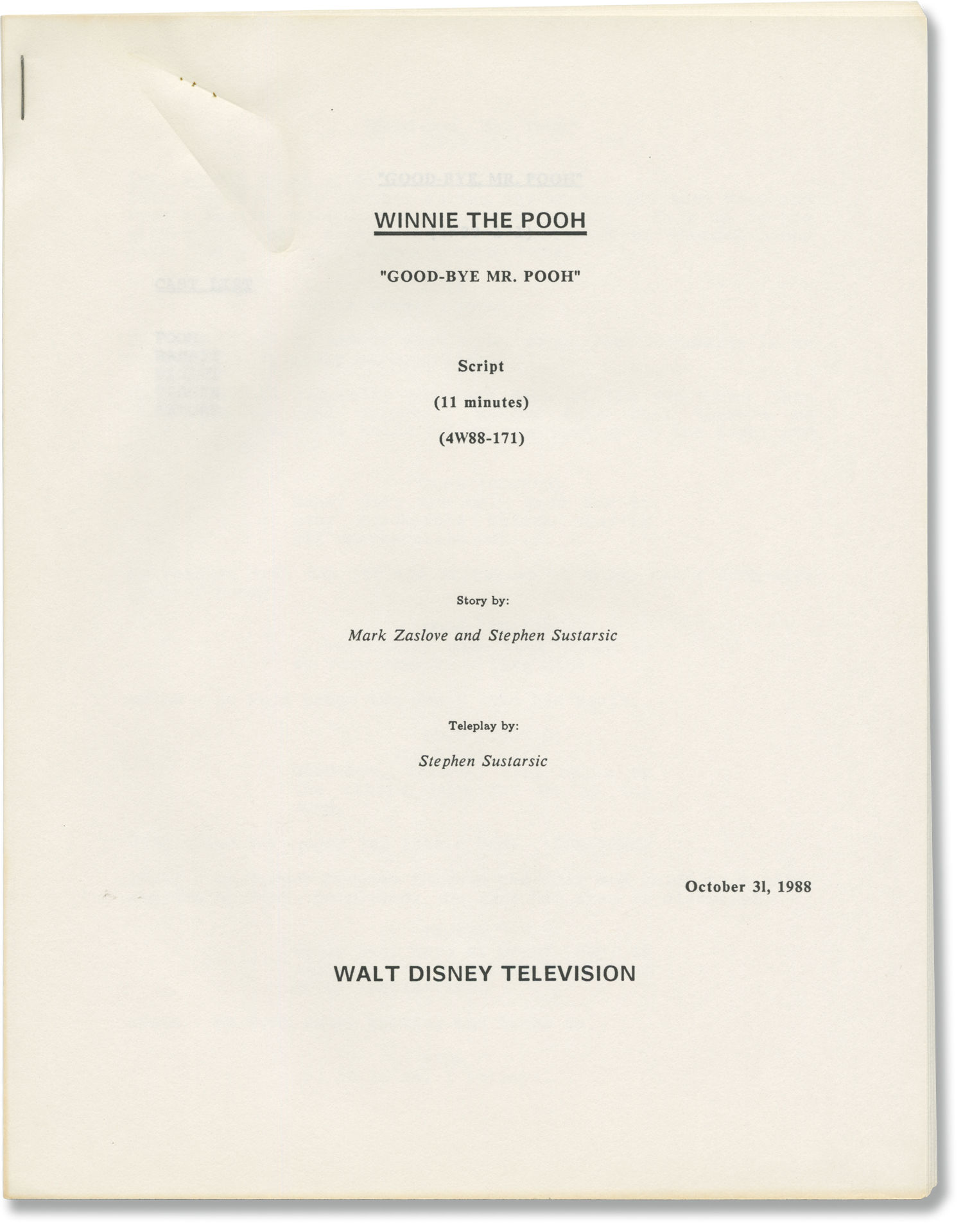 Burbank, CA: Walt Disney Television, 1988. One Recording script, two Draft scripts, and two Treatment scripts for part 2 of Season 2 Episode 2 of the 1988-1991 television series. Originally aired September 16, 1989 on ABC. One treatment script here under working title "Pooh's Farewell". Also included in this collection is one separately bound correction page.