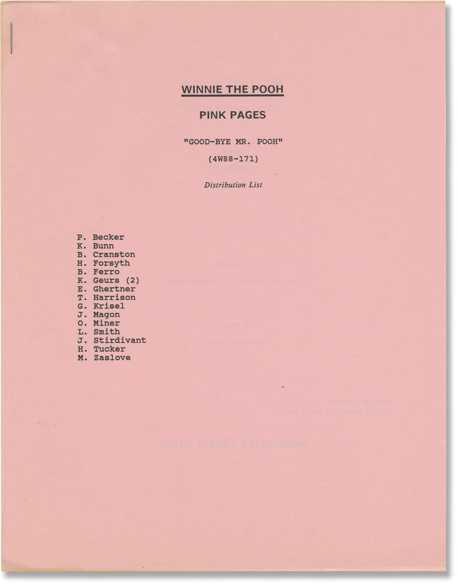 Distribution page bound as outer wrapper. Pink titled self-wrappers, lacking rear wrapper, production No. 4W88-171, dated November 8, 1988, with credits for screenwriter Stephen Sustarsic. Title page integral with front wrapper. 3 leaves, with last page of text numbered 19. Xerographic duplication, rectos only. Pages Near Fine, wrapper Near Fine, bound with a staple at the top left corner. Printed on pink stock.