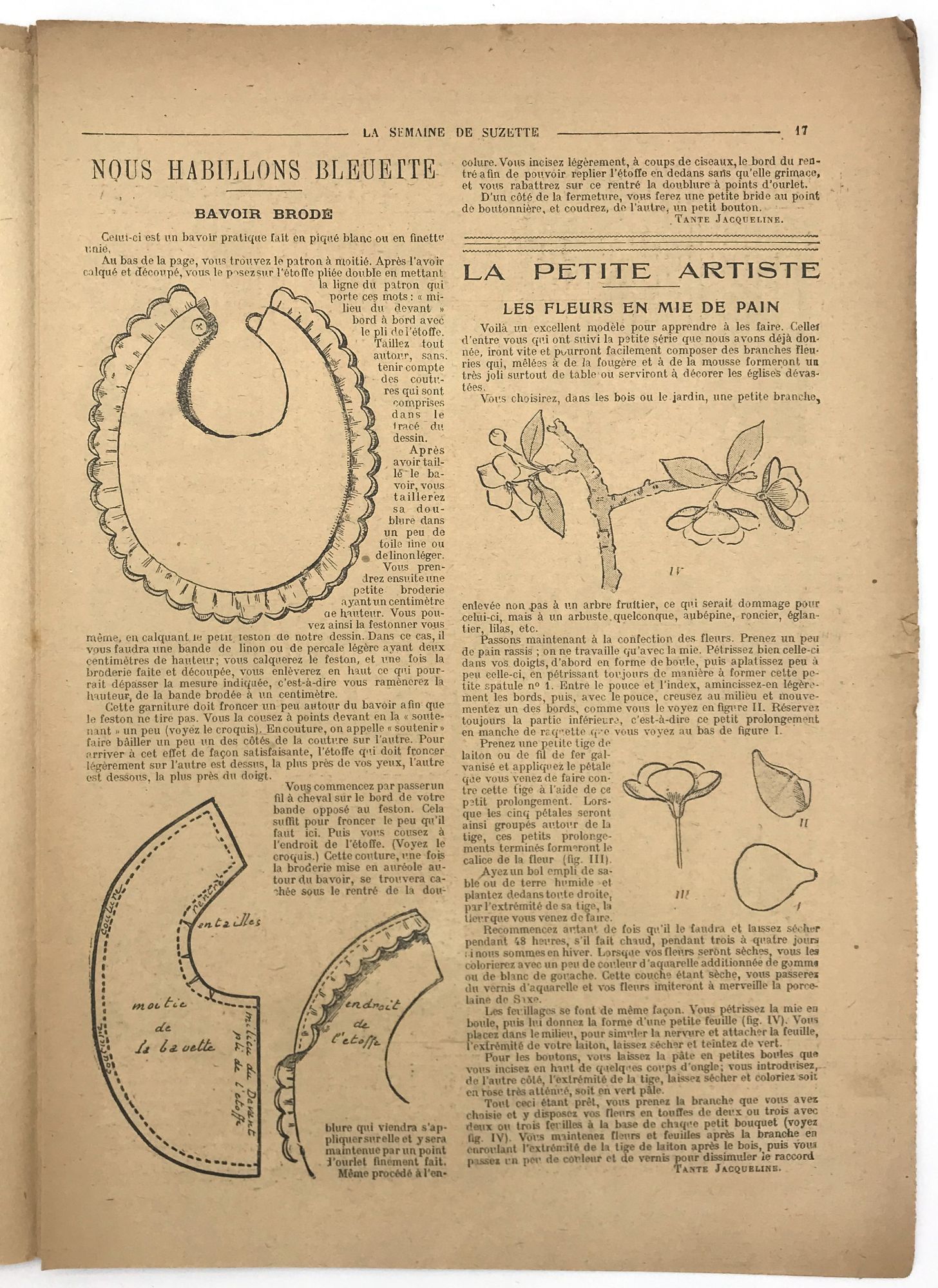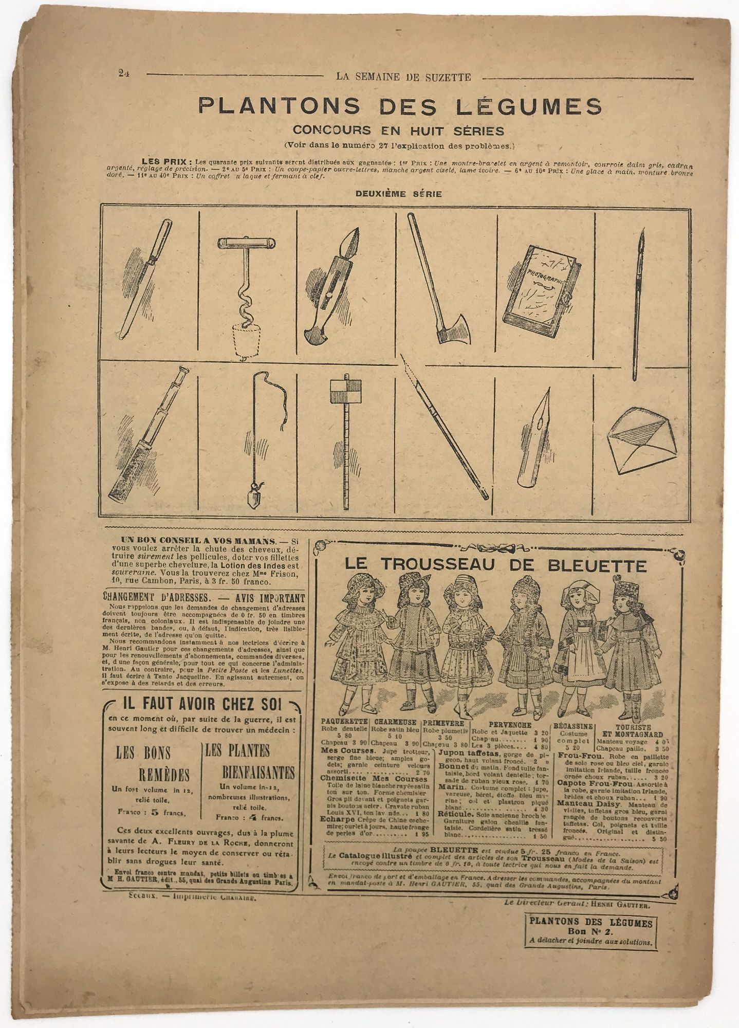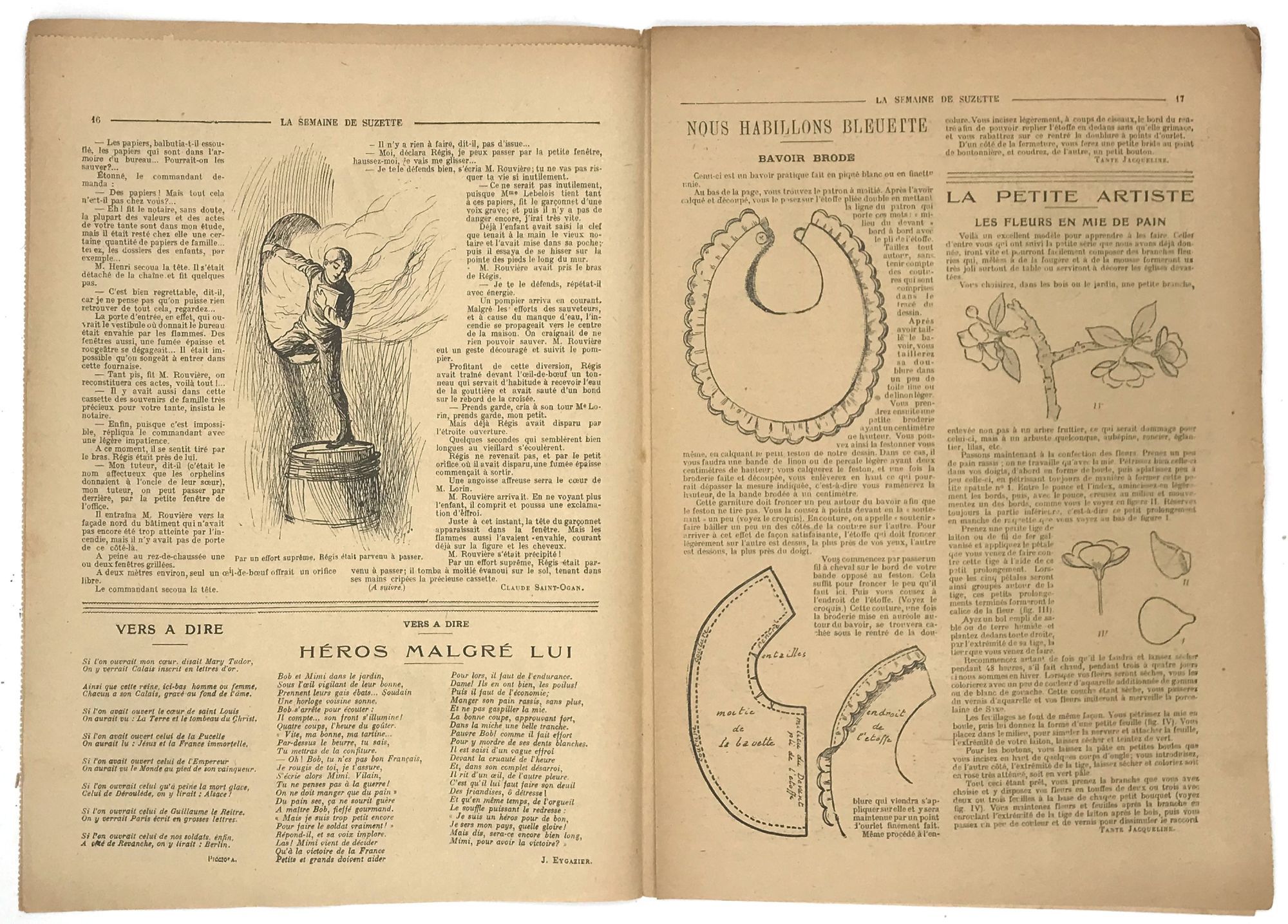 France: Henri Gautier, 1917. Very good. Toned.. A rather charming issue of "La Semaine de Suzette", an illustrated periodical for young girls published between 1905 and 1960. The present issue (No. 28, 9 August 1917) features a new installment of the story "Le Secret de la Roche qui Pleure" ("The Secret of the Weeping Rock"), rhymes, a sewing pattern for the periodical's mascot (a doll named "Bleuette"), directions for how to craft artificial flowers, a two-page spread of comics, and directions for crafting a homemade Ocarina, and many more stories and columns. Many of the columns are signed by a fictional "Tante Jacqueline" (Aunt Jacqueline).