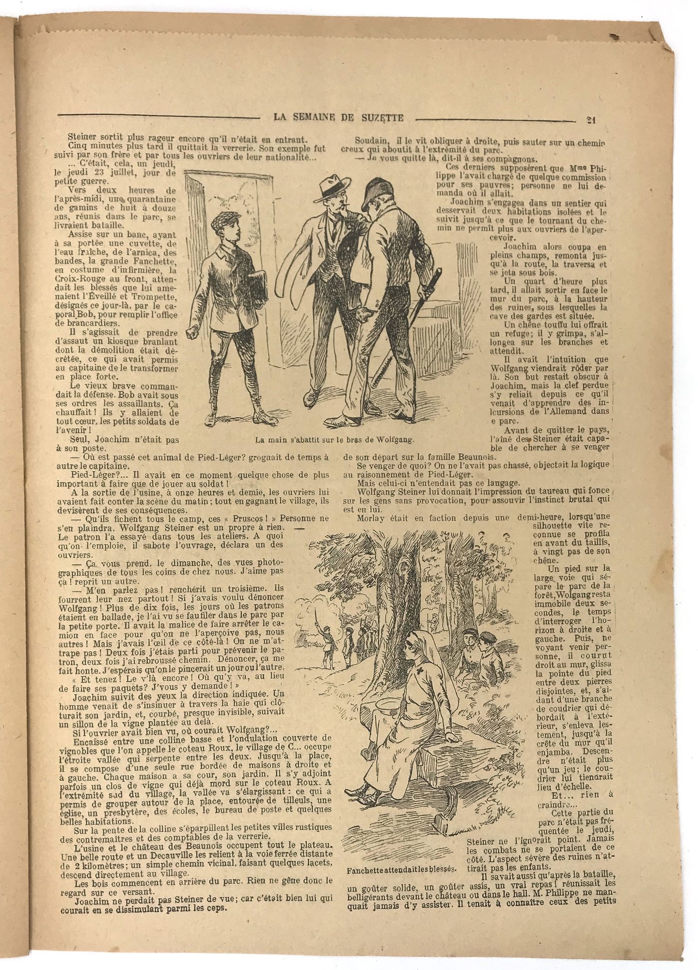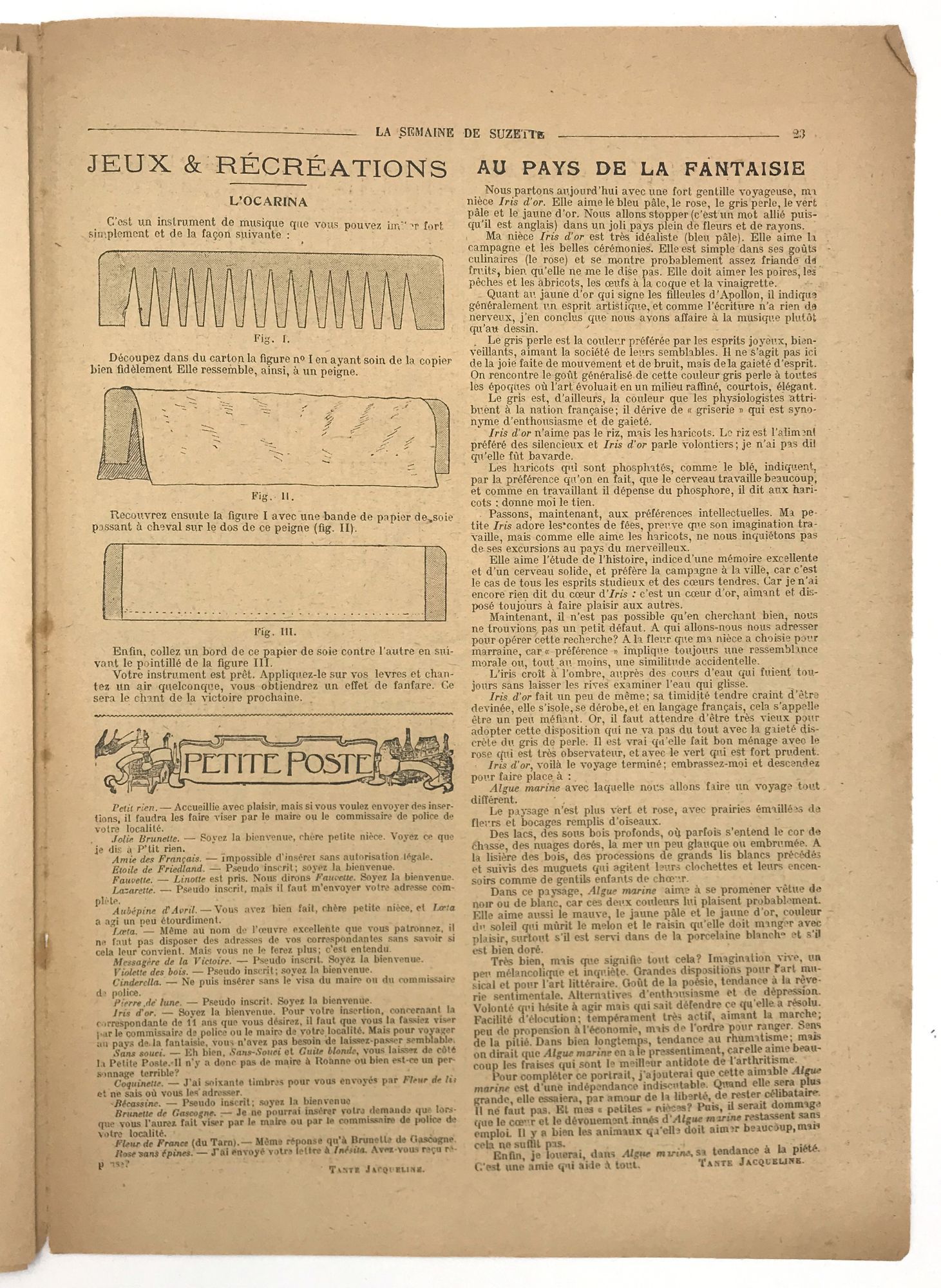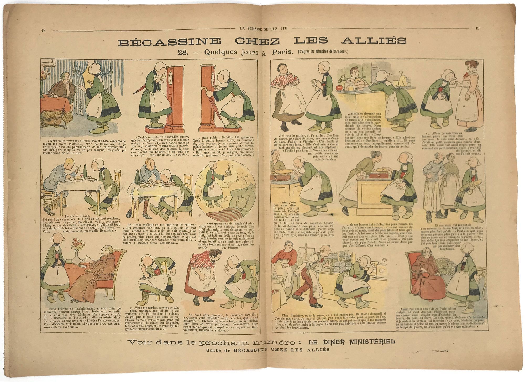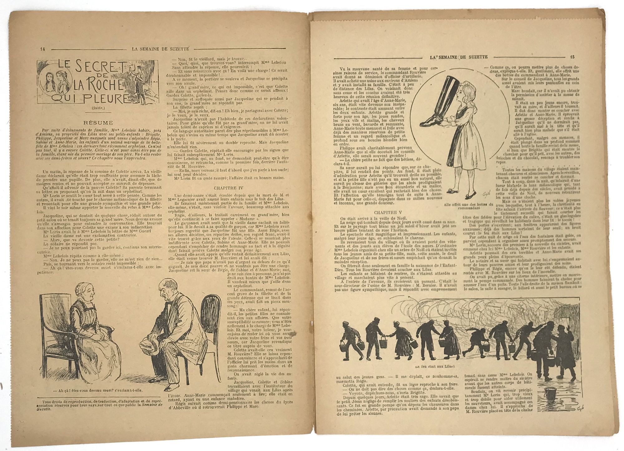 France: Henri Gautier, 1917. Very good. Toned.. A rather charming issue of "La Semaine de Suzette", an illustrated periodical for young girls published between 1905 and 1960. The present issue (No. 28, 9 August 1917) features a new installment of the story "Le Secret de la Roche qui Pleure" ("The Secret of the Weeping Rock"), rhymes, a sewing pattern for the periodical's mascot (a doll named "Bleuette"), directions for how to craft artificial flowers, a two-page spread of comics, and directions for crafting a homemade Ocarina, and many more stories and columns. Many of the columns are signed by a fictional "Tante Jacqueline" (Aunt Jacqueline).