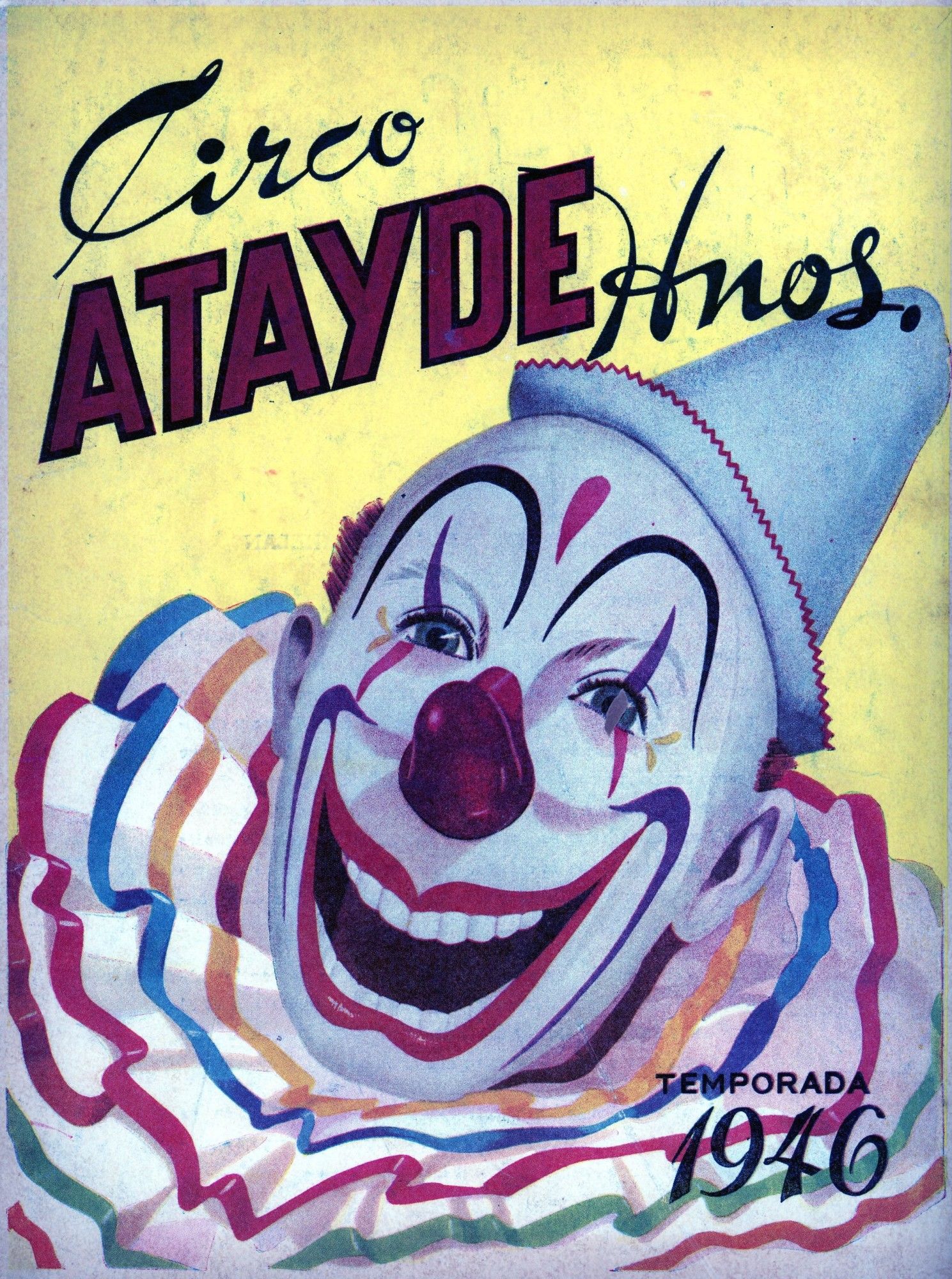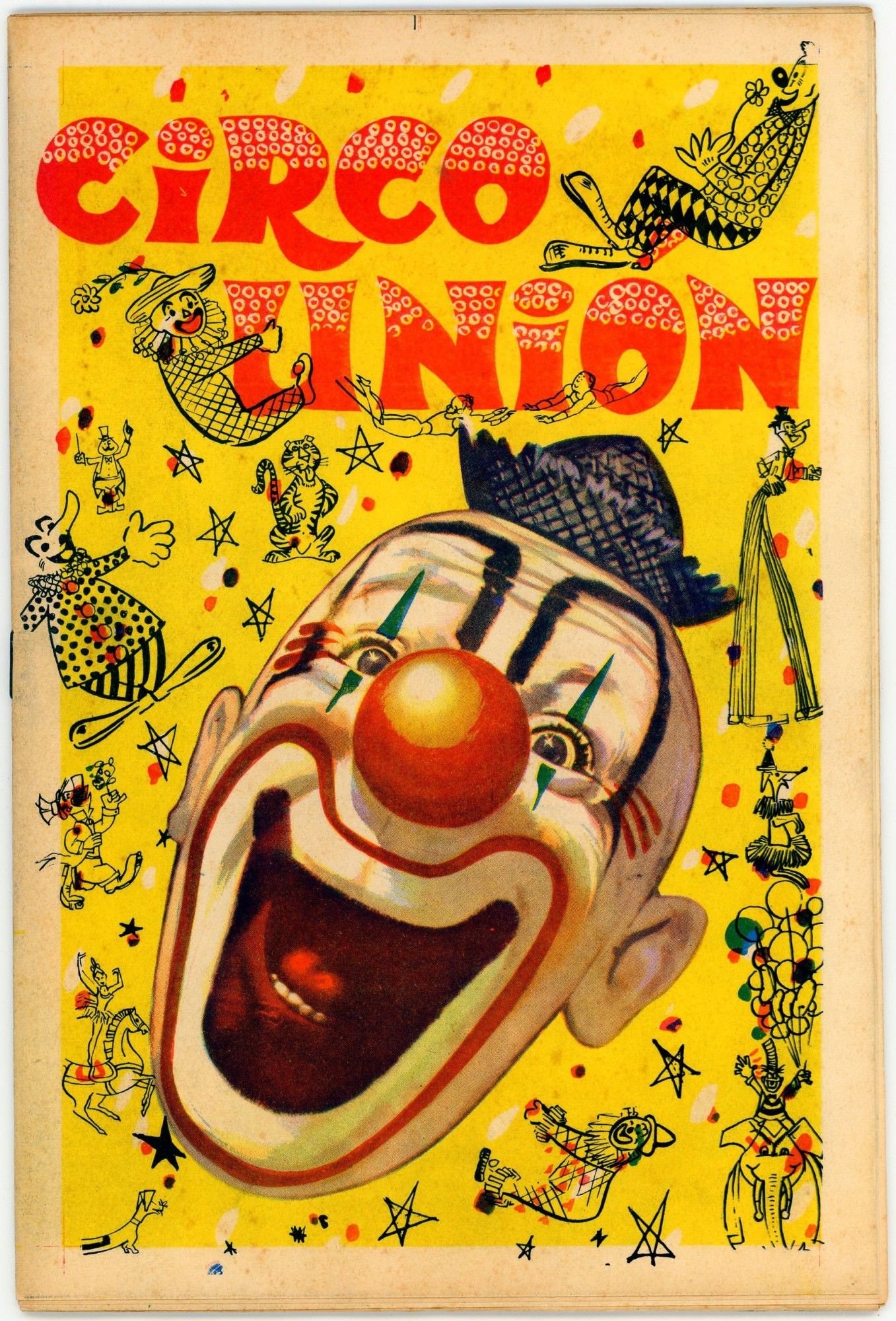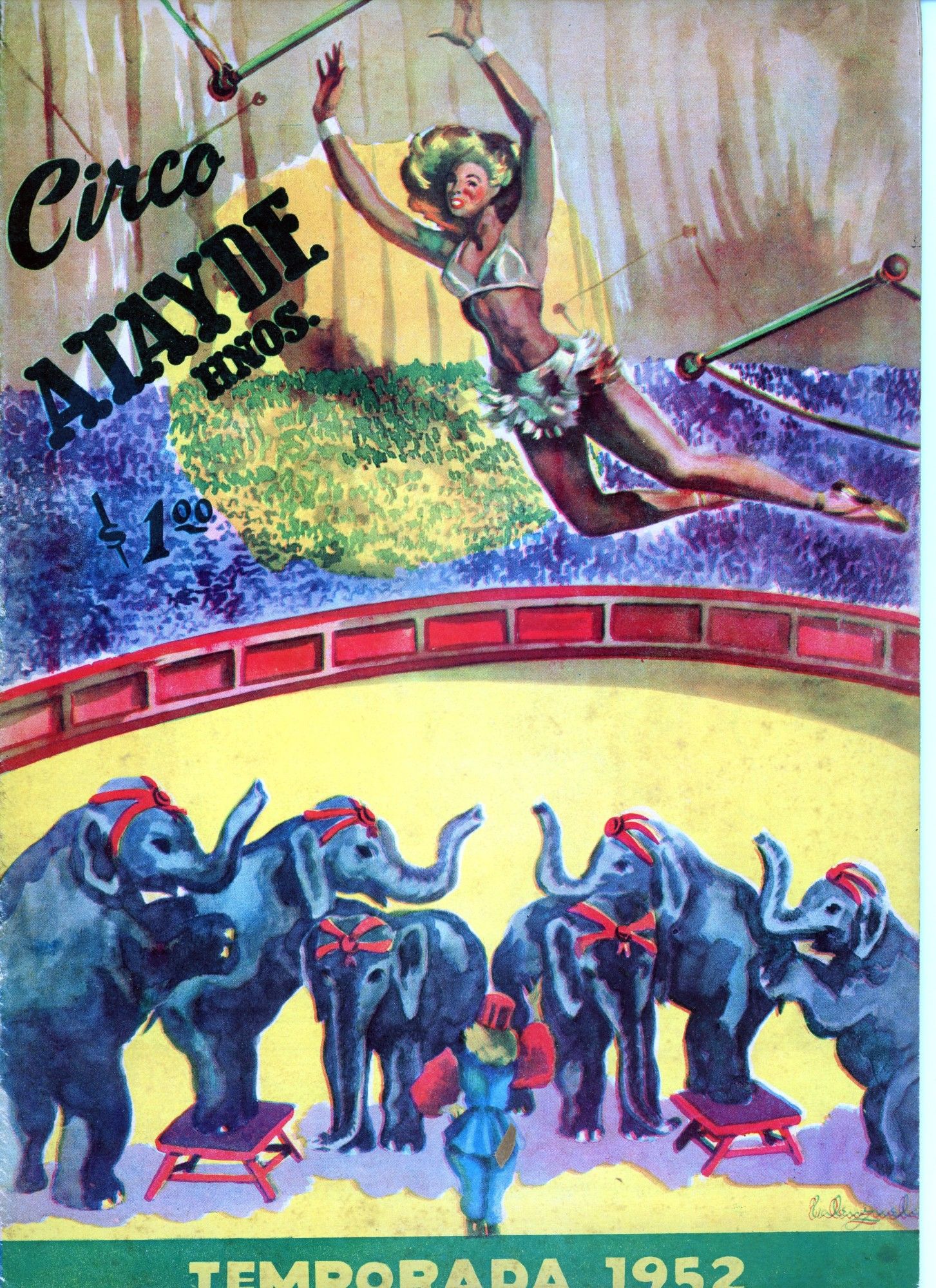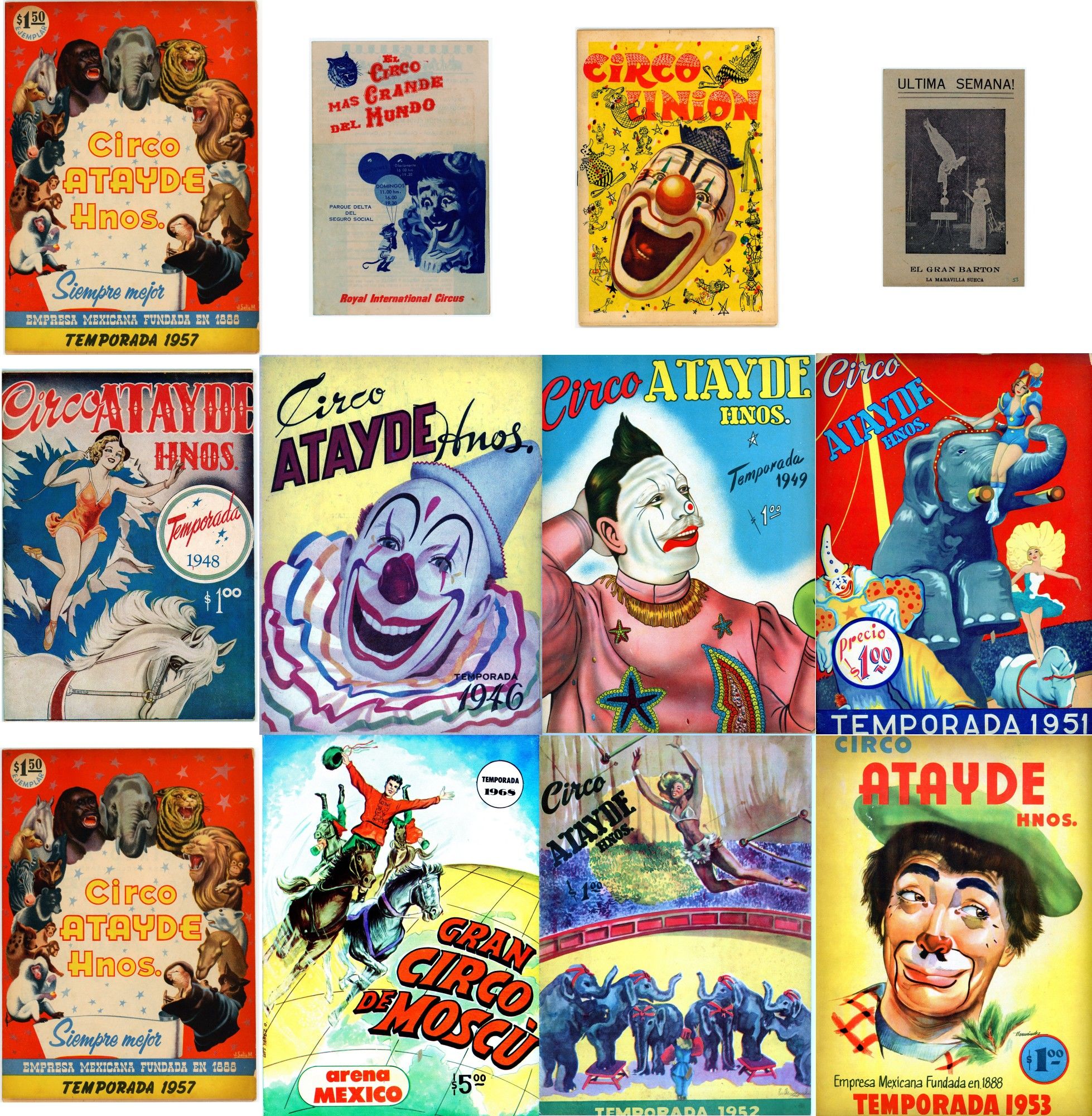 The bulk of this collection consists of 8 seasonal commemorations of the Circo Atayde Hermanos, published by the circus as advertisements for the following year. Included are the volumes from 1946, 1948, 1949, 1951, 1952, 1953, 1957, and 1958. Also included are the c.1958 20th anniversary commemoration of the Circo Union containing 2 inserts from other circus acts, and the Spanish language edition of the 1968 season of the Great Moscow Circus, or Gran Circo de Moscú. Each volume ranges from 6"x 9" to 9"x 12". All are full color on the covers with limited-palette pages, Spanish language, and very good condition. ~~Founded in 1888 by Don Aurelio Atayde and his brothers, The Circo Atayde Hermanos continues to operate in Mexico as a highly respected circus. Presented as a peek behind the curtain, the magazines contain articles, poetry, photographs, and drawings advertising performers, showcasing acts, sharing audience reactions, and providing history and context for circus work. A highly engaging historical look into a niche world.~.