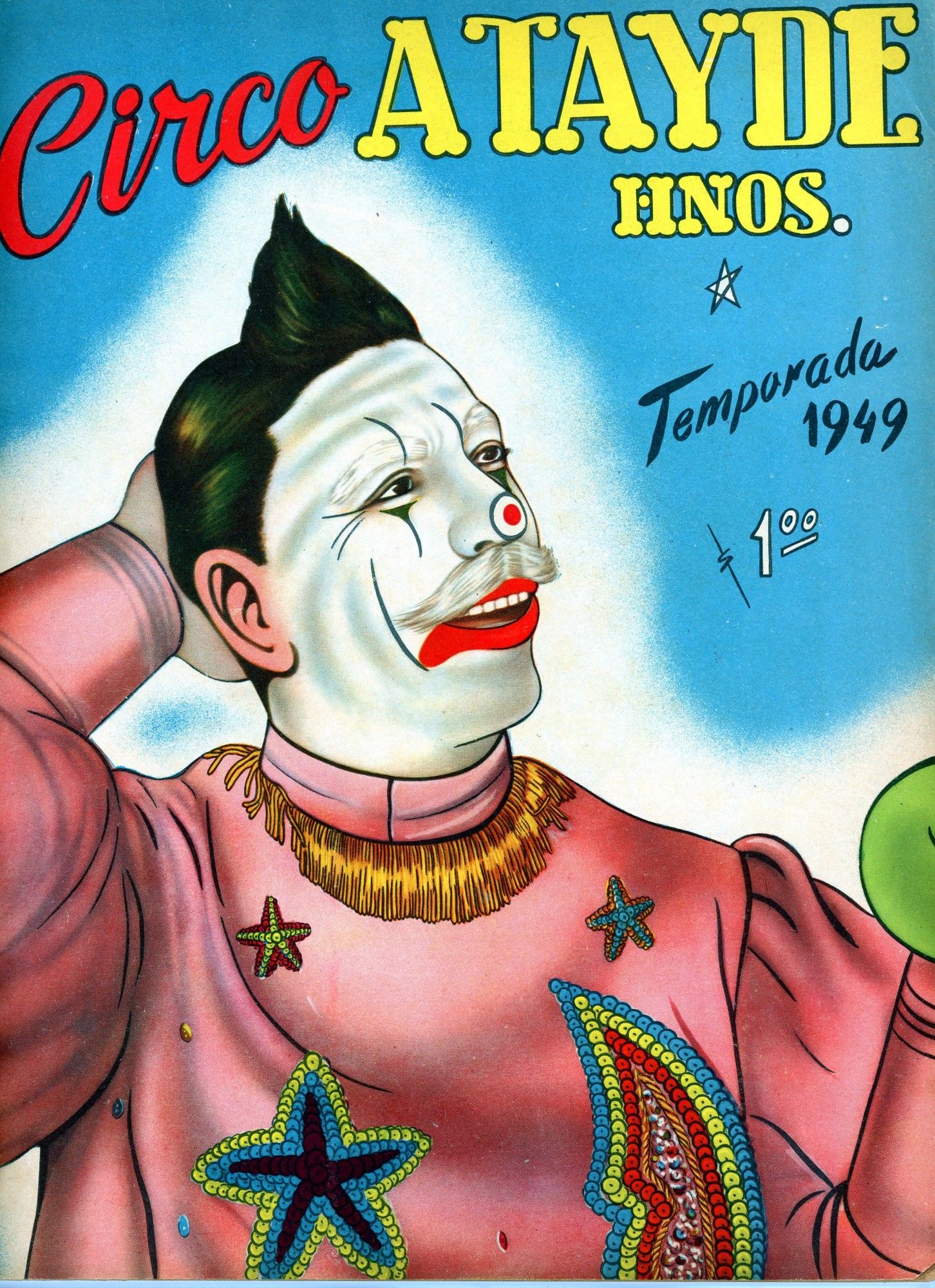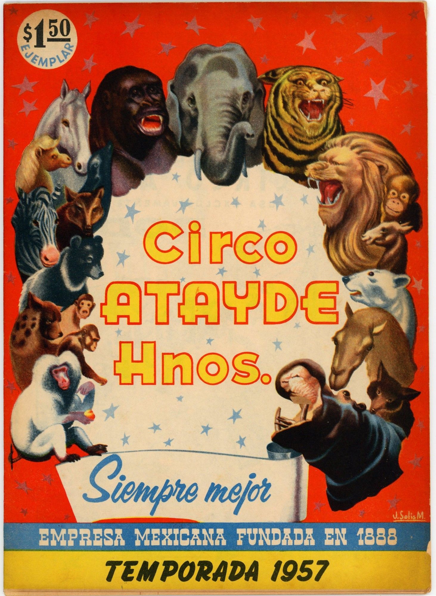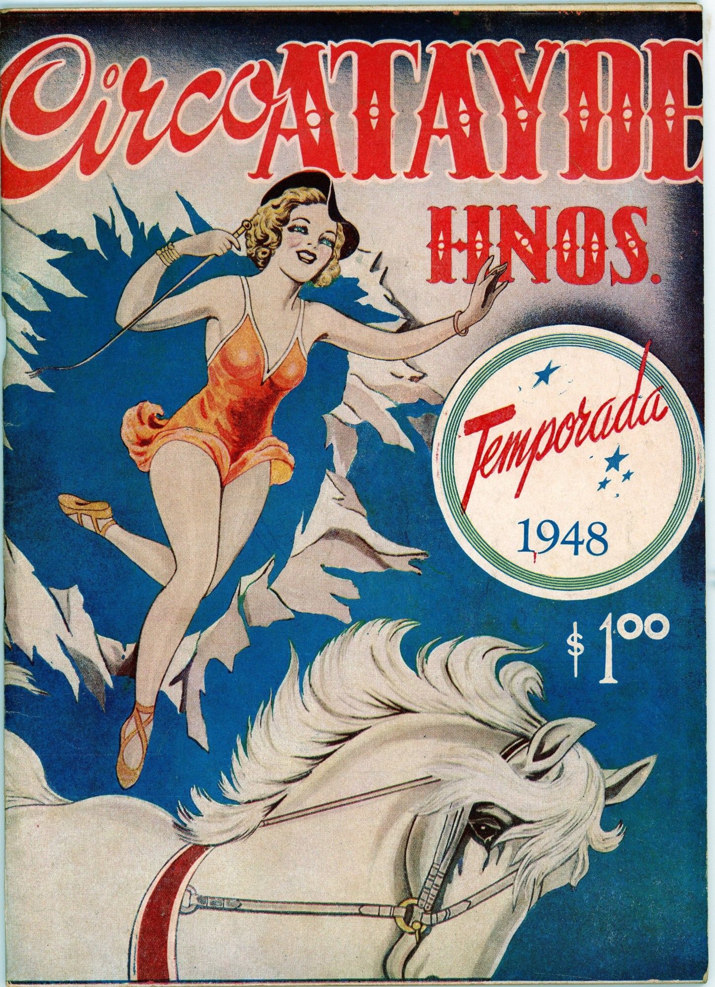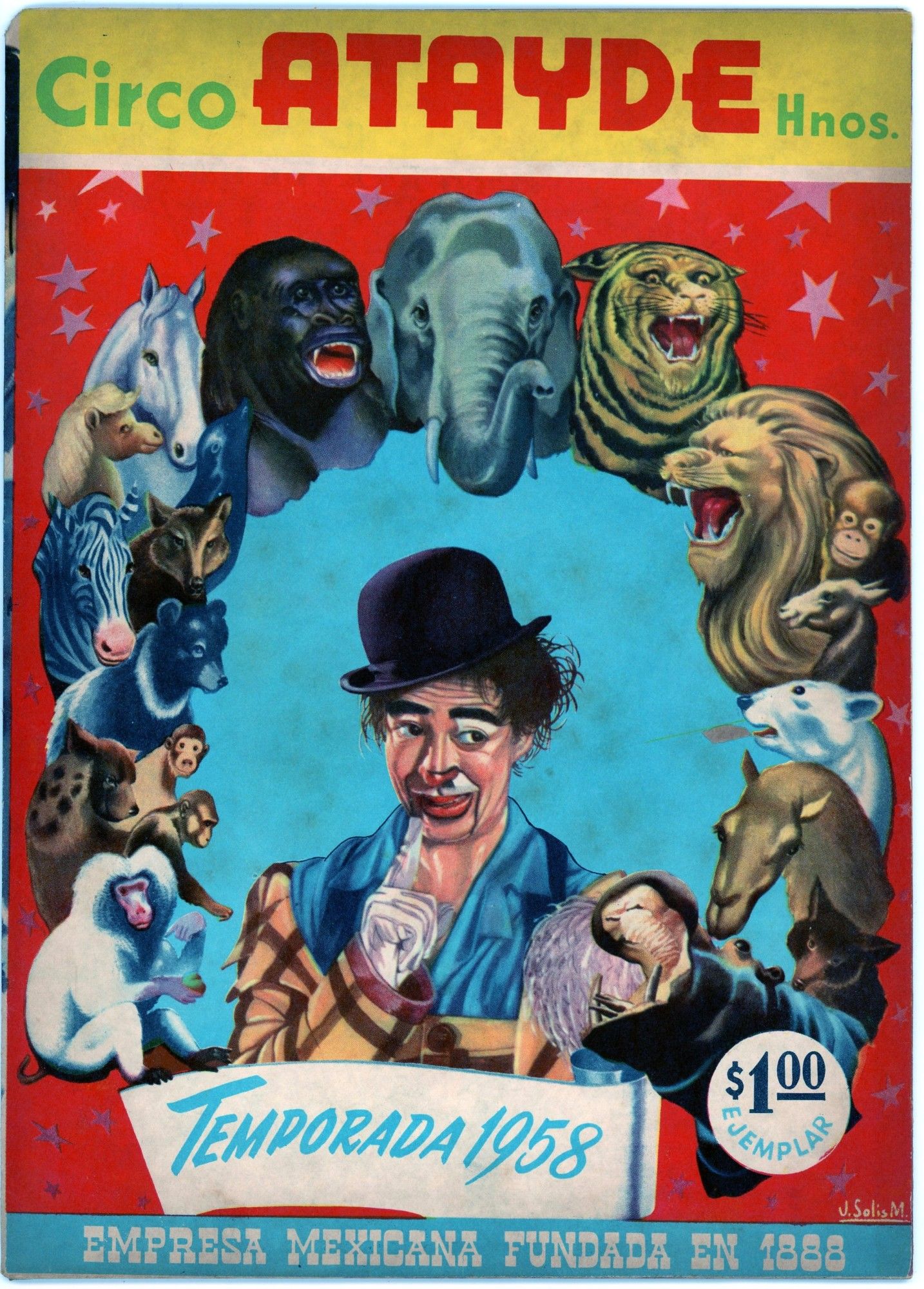 The bulk of this collection consists of 8 seasonal commemorations of the Circo Atayde Hermanos, published by the circus as advertisements for the following year. Included are the volumes from 1946, 1948, 1949, 1951, 1952, 1953, 1957, and 1958. Also included are the c.1958 20th anniversary commemoration of the Circo Union containing 2 inserts from other circus acts, and the Spanish language edition of the 1968 season of the Great Moscow Circus, or Gran Circo de Moscú. Each volume ranges from 6"x 9" to 9"x 12". All are full color on the covers with limited-palette pages, Spanish language, and very good condition. ~~Founded in 1888 by Don Aurelio Atayde and his brothers, The Circo Atayde Hermanos continues to operate in Mexico as a highly respected circus. Presented as a peek behind the curtain, the magazines contain articles, poetry, photographs, and drawings advertising performers, showcasing acts, sharing audience reactions, and providing history and context for circus work. A highly engaging historical look into a niche world.~.
