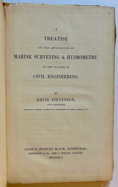 Edinburgh: Adam & Charles Black, 1842. The uncommon 1842 1st edition. Solid and VG in its bevelled, chocolate-brown boards, with very light chipping along the outer hinges and the spine crown. 13 full-page plates (including large fold-out plate opposite the first page of text) plus a number of figures and tables. According to the author in his Preface, this is likely the first published work on the subject of marine surveying and hydrometry in the practice of civil engineering.