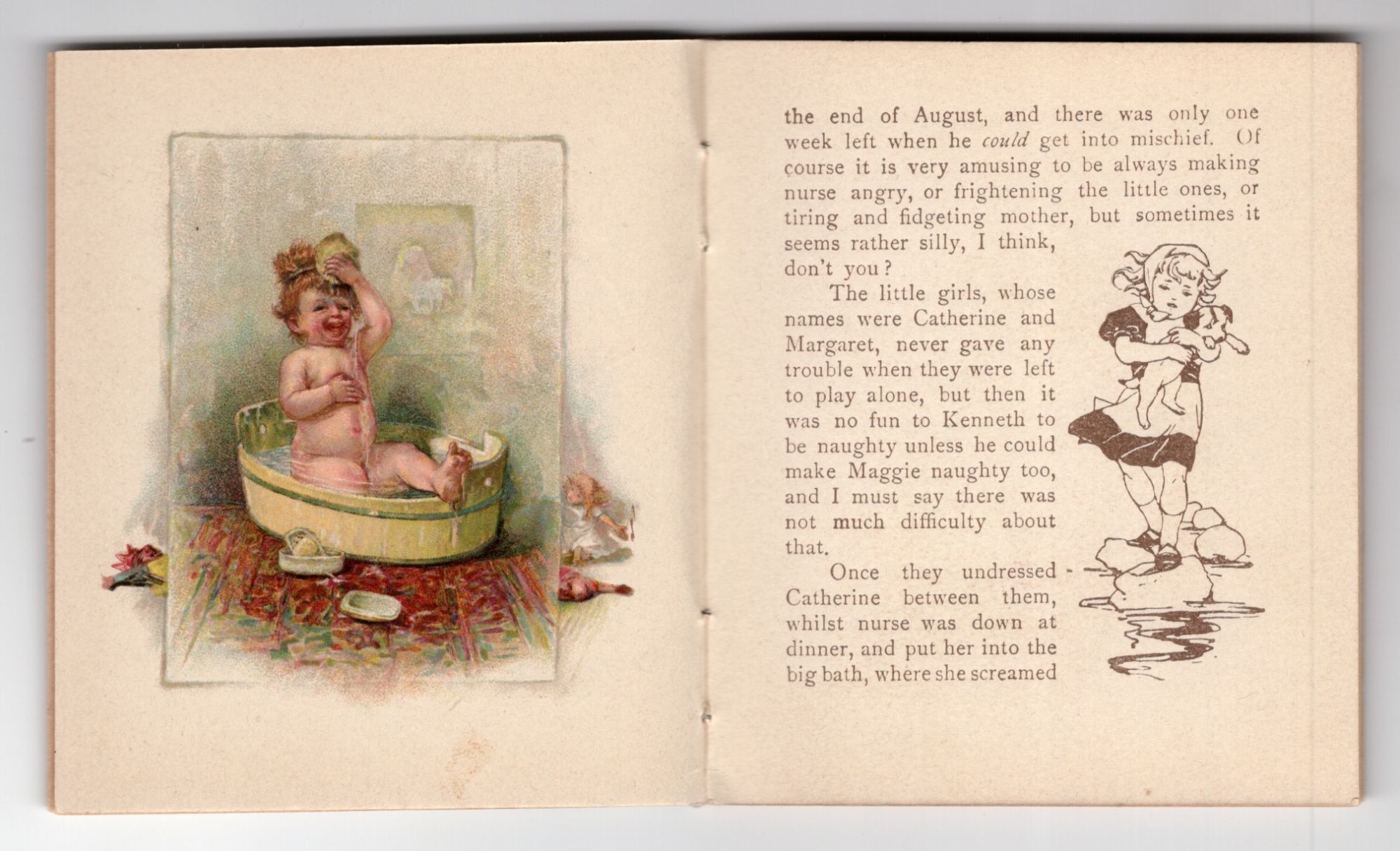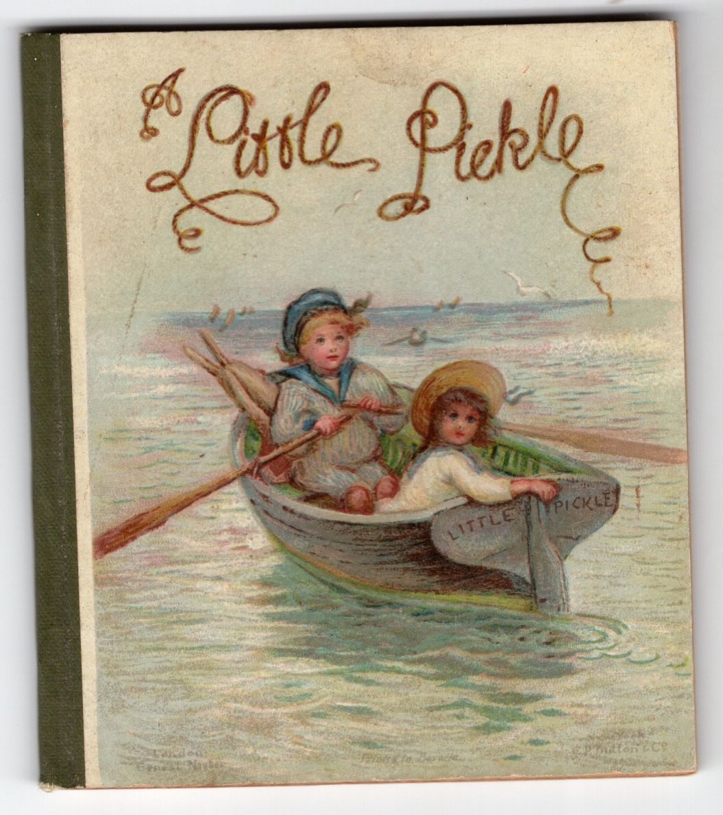 A 12 pp miniature book with pictorial covered broads. It is A Little Pickle. No. 1395. c1905. One of the books from The Little Good Library Series. The cover depicts a boy and girl in a rowing oat on a sea. Story by Geraldine R. Glasgow. Illustrated by H.M. Bennett, L.Lawson, Illustrations in sepia line drawings and four (4) color plates including Baby's Bathtime; Stepping Stones; Gardener's Boy and An Apple for Neddy (horse).; Measures 3 3/4" x 3 1/4". Condition: excellent. Minimal cover wear; Near mint.