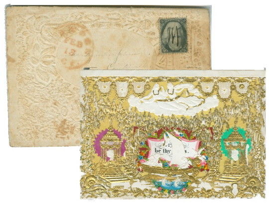 A single fold valentine with elaborate gold enhanced laced paper cover. The top of the lace depicts a decorative elements with two winged floating angels. At base green and purple wafers are shown behind gazebos on each side of a sail boat with two cherubs In front of the boat is applied scrap of two swans in water. Inside is an applied verse, "Joyful Be thy Days." Condition: overall excellent. Includes postally used envelope stamped Feb 13. Toning and stain on envelope.