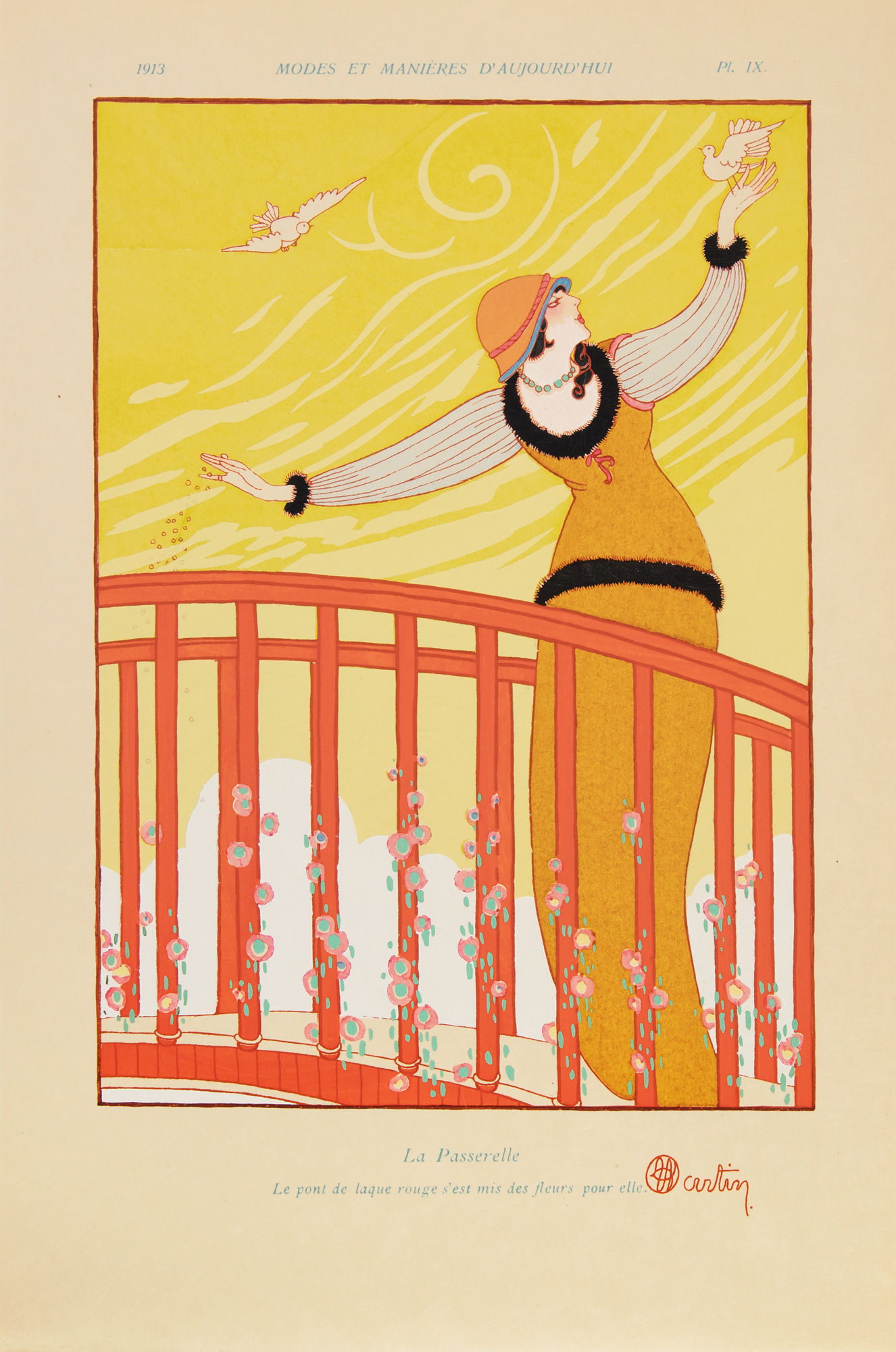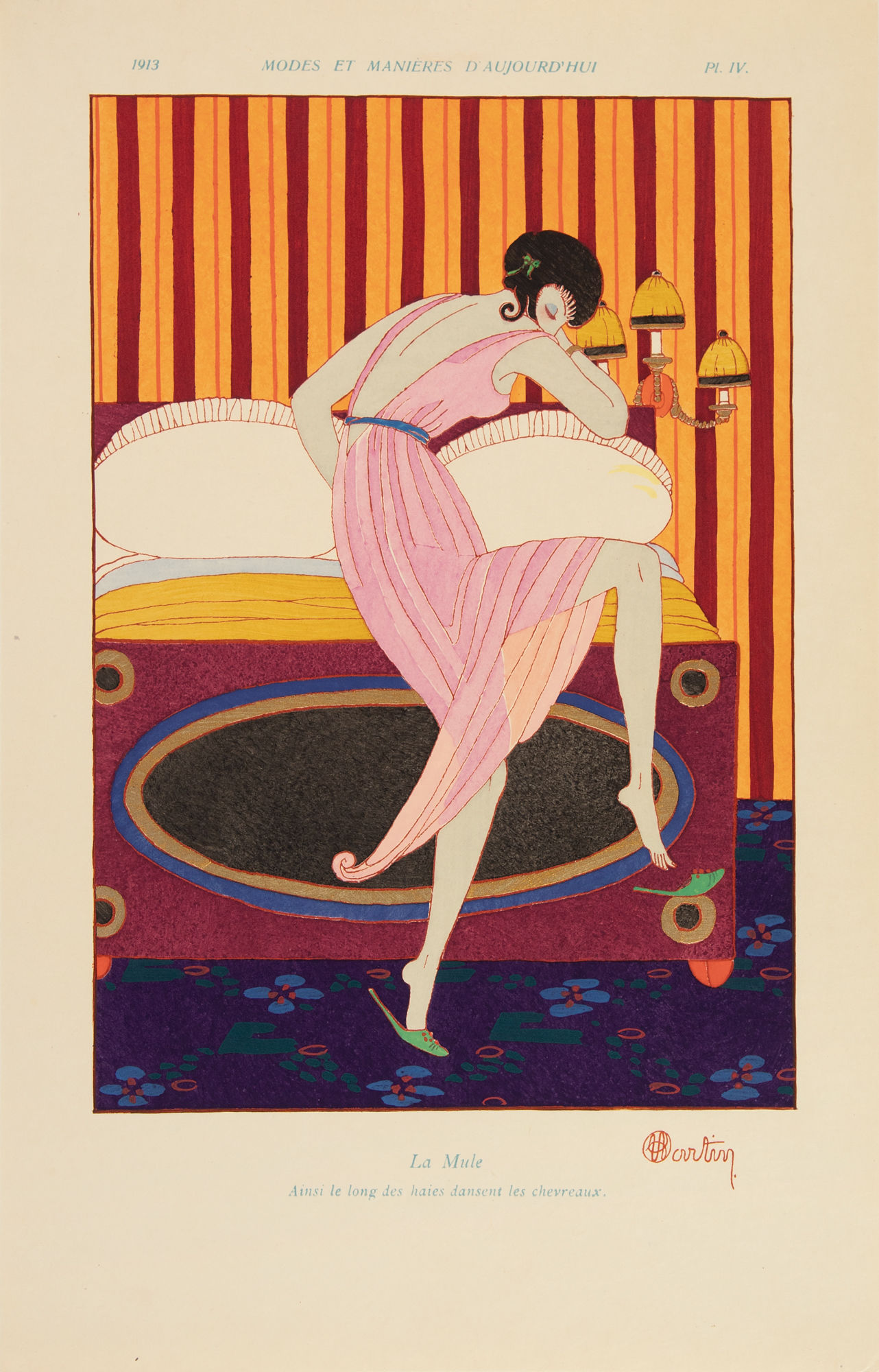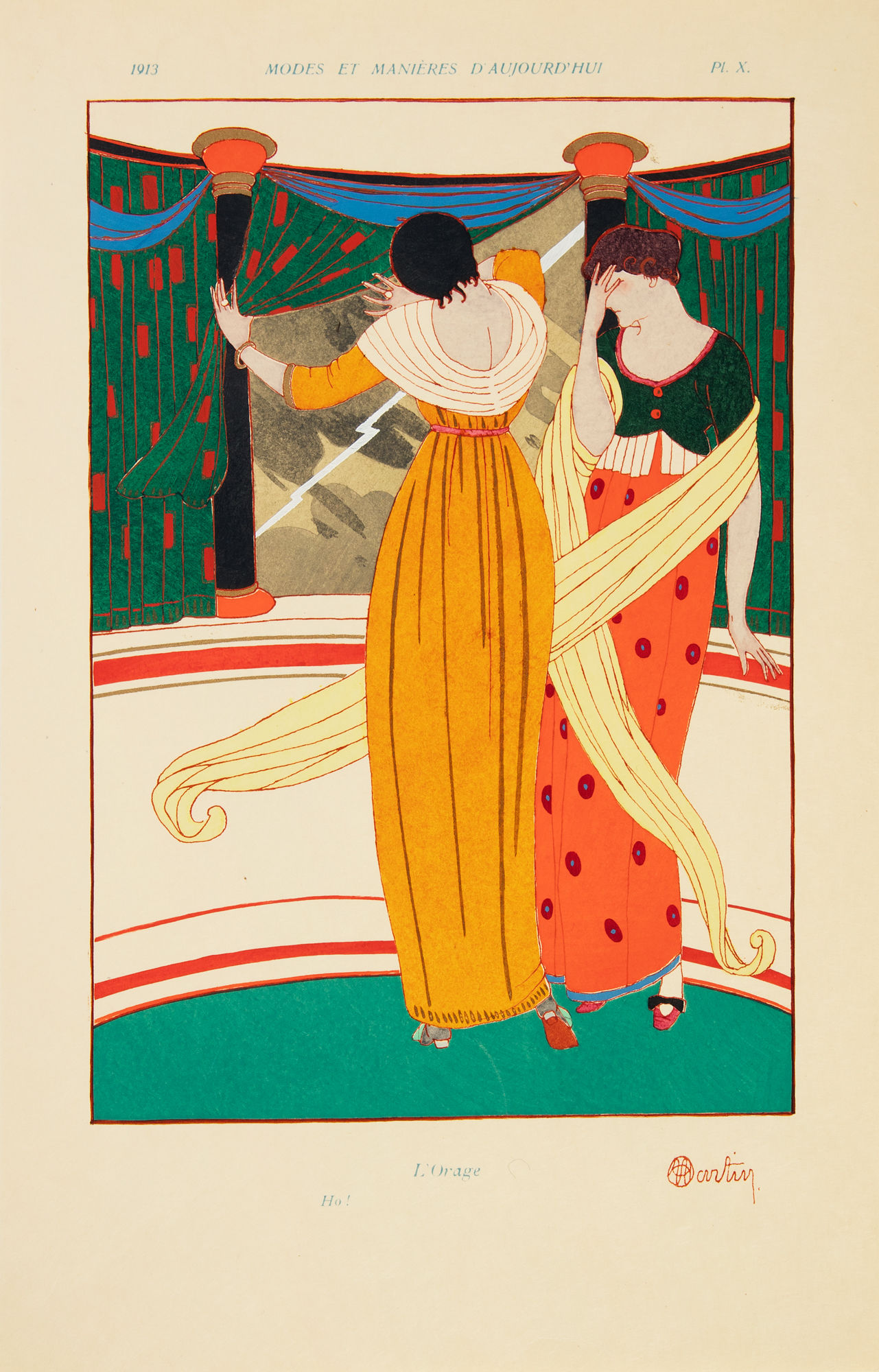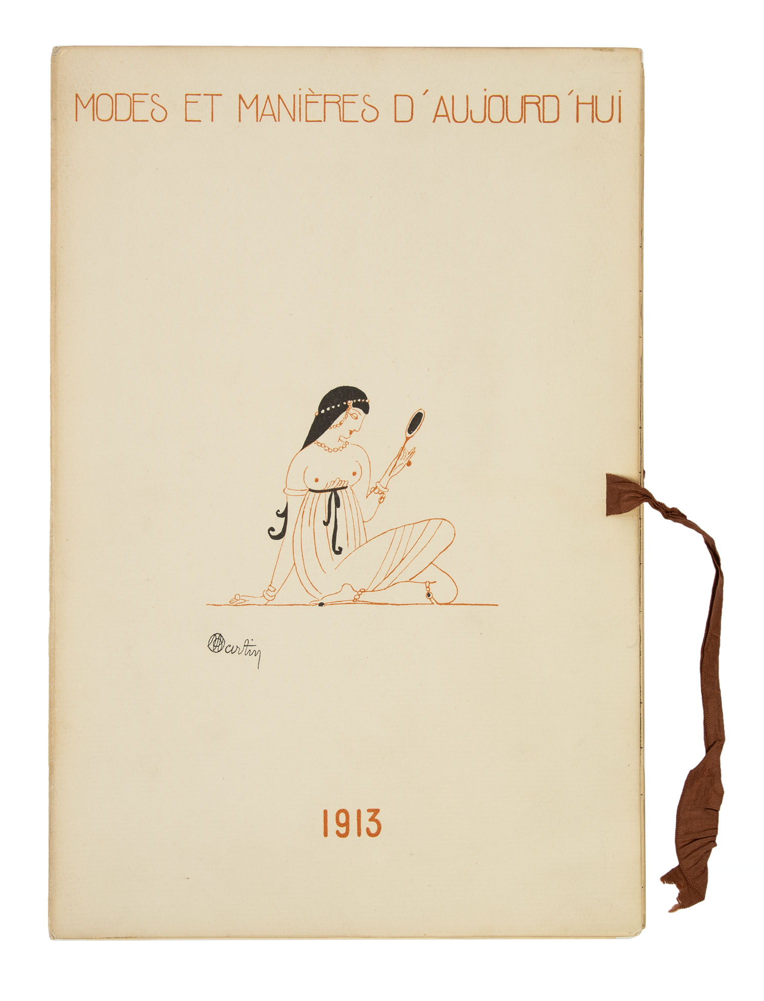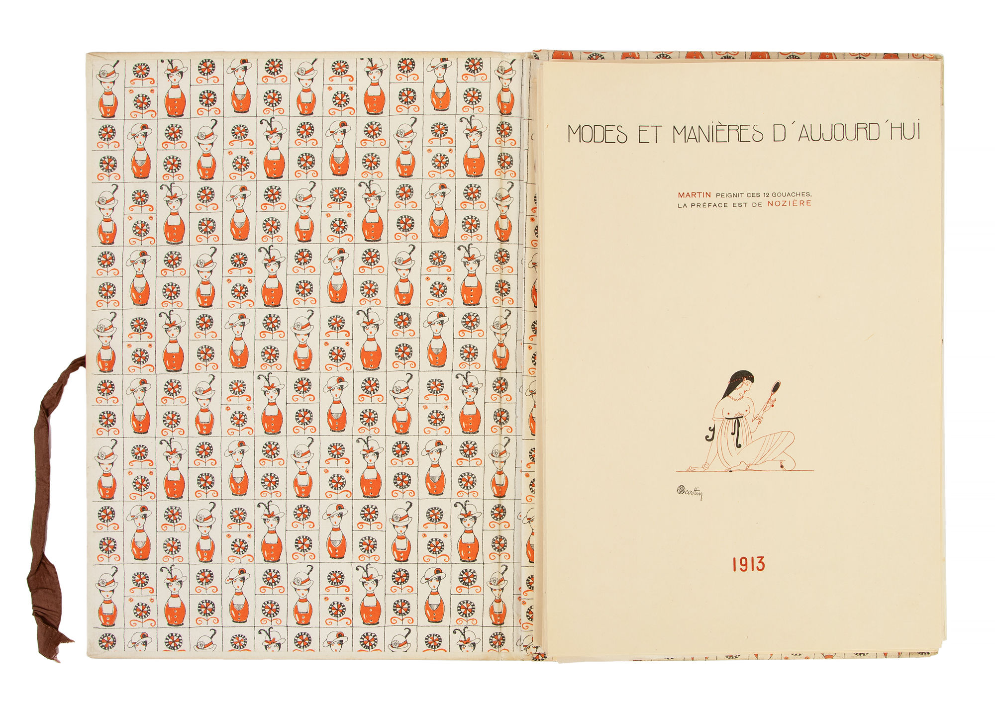 (Paris): Pierre Corrard, 1913. First and only edition of the 1913 number of Modes et Manières d’Aujourd’hui, number 193 of 300 copies, signed by illustrator Charles Martin. In 1912, inspired by the Napoleonic-era fashion journal Modes et Manières du Jour, Pierre Corrard launched Modes et Manières d’Aujourd’hui in Paris. Over the next decade, seven numbers in the series appeared, each pairing the work of a contemporary writer with a portfolio of hand-colored prints by a celebrated Art Deco illustrator, among them Georges Lepape, George Barbier, and André Marty. This 1913 number, the “2e année” of the journal, features text by the playwright Fernand Nozière and twelve fashion plates by Charles Martin, a regular contributor to Harper’s Bazaar, Gazette du Bon Ton, and Fémina. Martin’s vibrant fashion plates capture the fluid, freeing styles suited to the leisure pursuits of the modern Parisienne, the “femme languissante” of Nozière’s introduction, whose dresses are always on the verge of slipping off. Accompanied by verse captions, Martin’s models brave the snow in comically voluminous fur coats, fling off their boudoir slippers, chase fireflies and birds in the park, and play “le bijoutier de la nature” by picking cherries for earrings. This 1913 number of Modes et Manières d’Aujourd’hui was the most commercially successful in the series, the result of Martin’s whimsical portfolio. Complete volumes of Modes et Manières in the original portfolios are uncommon. Text in French. A fine bright copy of an Art Deco landmark. Unbound sheets as issued, measuring 10.75 x 7 inches: [4], 9, xii. Text printed recto only in black and brown; vignettes to title page and limitation page; numbered and signed in pencil by Charles Martin. Twelve numbered and captioned color pochoir plates, some heightened in gold or silver, with tissue guards. Original illustrated portfolio with brown silk ties, lined with orange and black patterned paper designed by Martin, original tissue dust jacket. Lower silk tie missing, faint mark to final plate. Housed in a custom clamshell box.