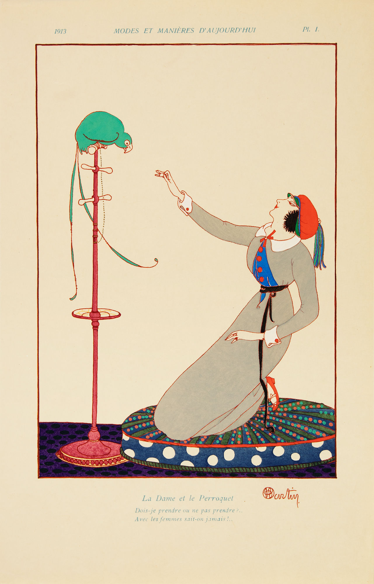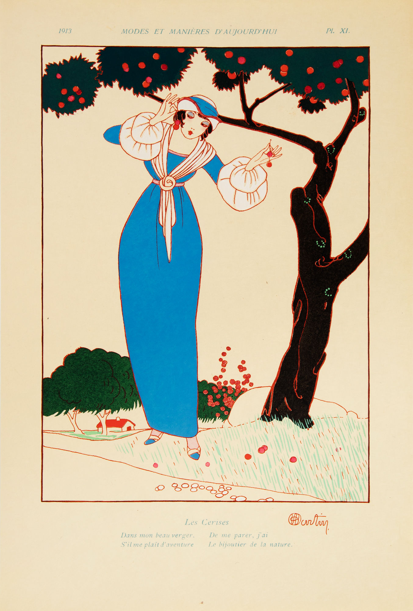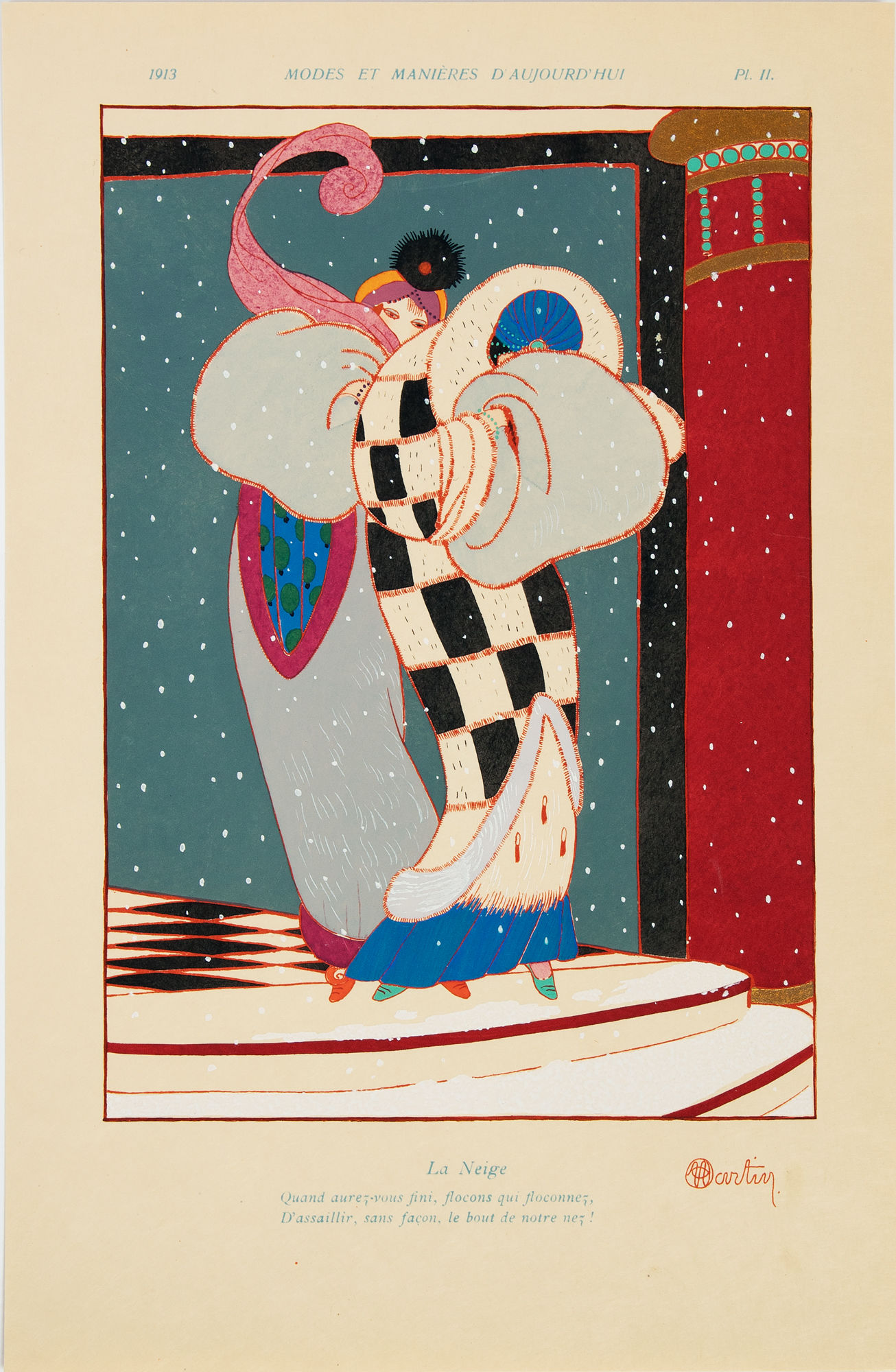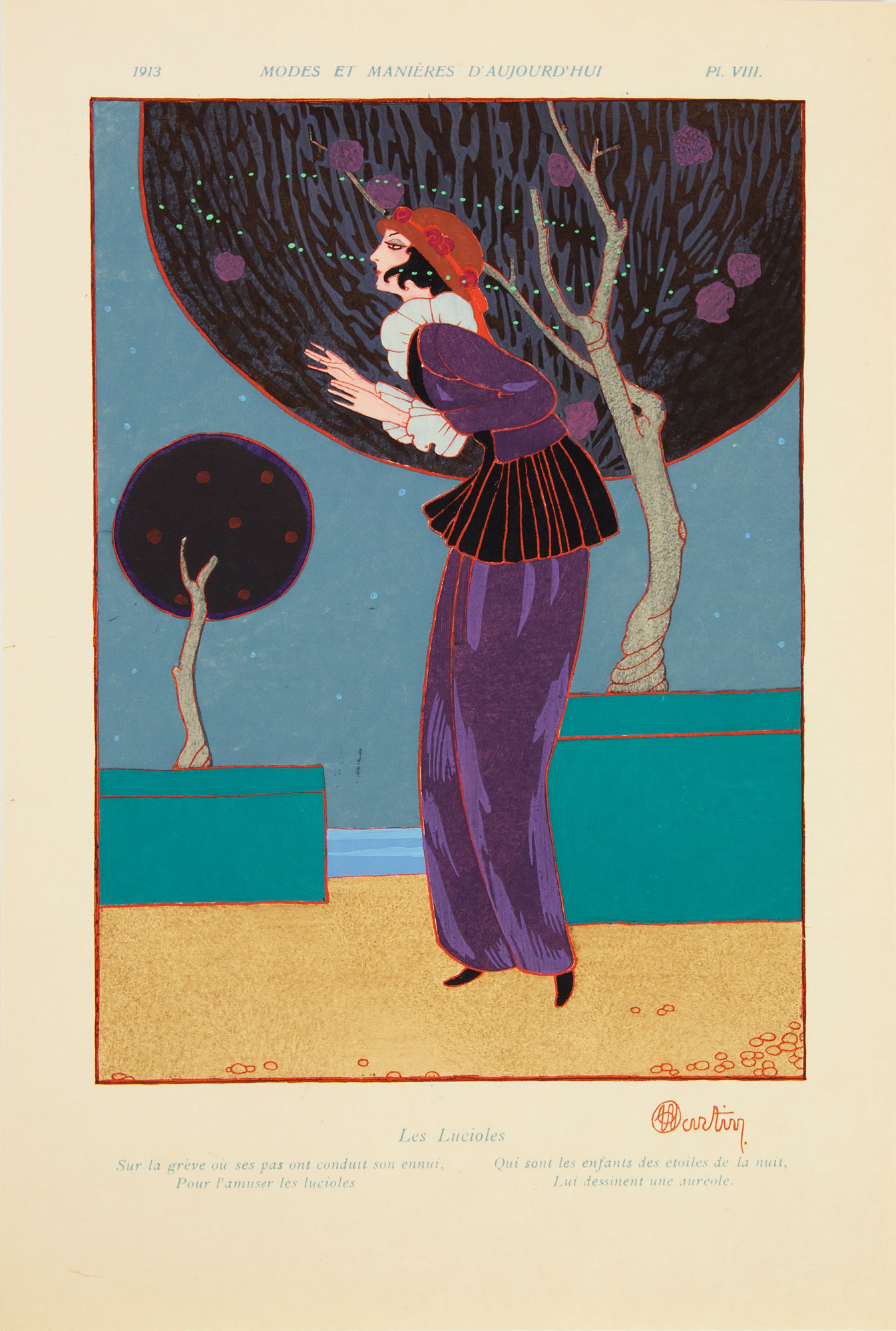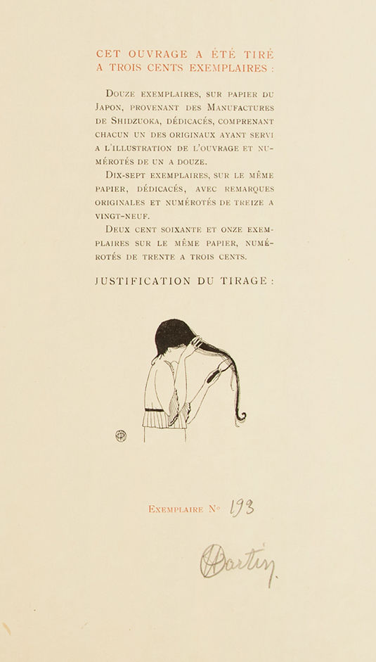 (Paris): Pierre Corrard, 1913. First and only edition of the 1913 number of Modes et Manières d’Aujourd’hui, number 193 of 300 copies, signed by illustrator Charles Martin. In 1912, inspired by the Napoleonic-era fashion journal Modes et Manières du Jour, Pierre Corrard launched Modes et Manières d’Aujourd’hui in Paris. Over the next decade, seven numbers in the series appeared, each pairing the work of a contemporary writer with a portfolio of hand-colored prints by a celebrated Art Deco illustrator, among them Georges Lepape, George Barbier, and André Marty. This 1913 number, the “2e année” of the journal, features text by the playwright Fernand Nozière and twelve fashion plates by Charles Martin, a regular contributor to Harper’s Bazaar, Gazette du Bon Ton, and Fémina. Martin’s vibrant fashion plates capture the fluid, freeing styles suited to the leisure pursuits of the modern Parisienne, the “femme languissante” of Nozière’s introduction, whose dresses are always on the verge of slipping off. Accompanied by verse captions, Martin’s models brave the snow in comically voluminous fur coats, fling off their boudoir slippers, chase fireflies and birds in the park, and play “le bijoutier de la nature” by picking cherries for earrings. This 1913 number of Modes et Manières d’Aujourd’hui was the most commercially successful in the series, the result of Martin’s whimsical portfolio. Complete volumes of Modes et Manières in the original portfolios are uncommon. Text in French. A fine bright copy of an Art Deco landmark. Unbound sheets as issued, measuring 10.75 x 7 inches: [4], 9, xii. Text printed recto only in black and brown; vignettes to title page and limitation page; numbered and signed in pencil by Charles Martin. Twelve numbered and captioned color pochoir plates, some heightened in gold or silver, with tissue guards. Original illustrated portfolio with brown silk ties, lined with orange and black patterned paper designed by Martin, original tissue dust jacket. Lower silk tie missing, faint mark to final plate. Housed in a custom clamshell box.