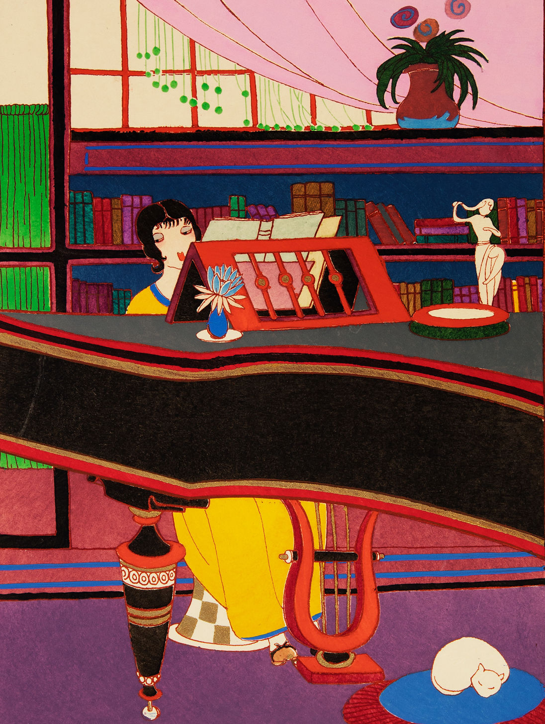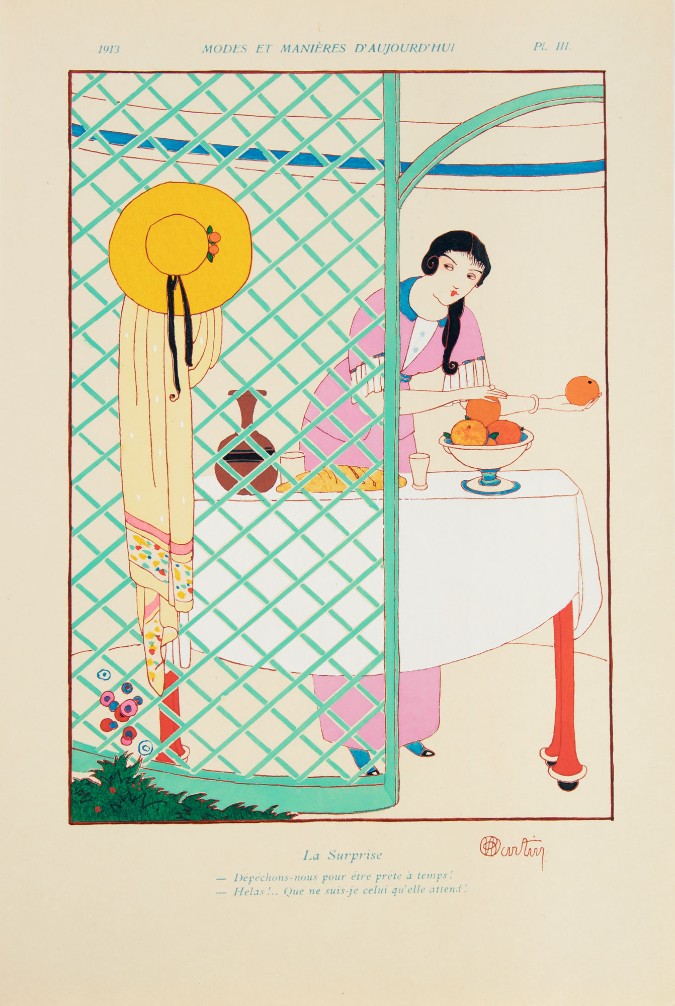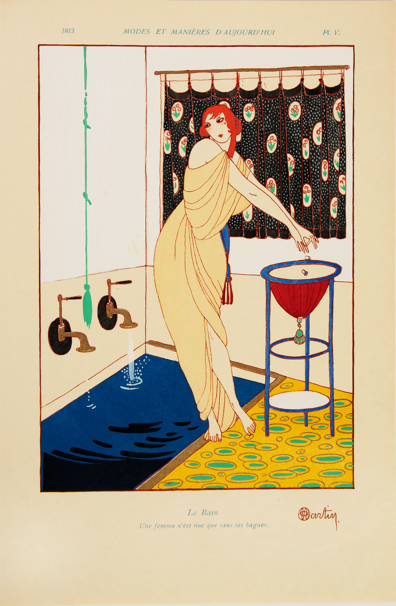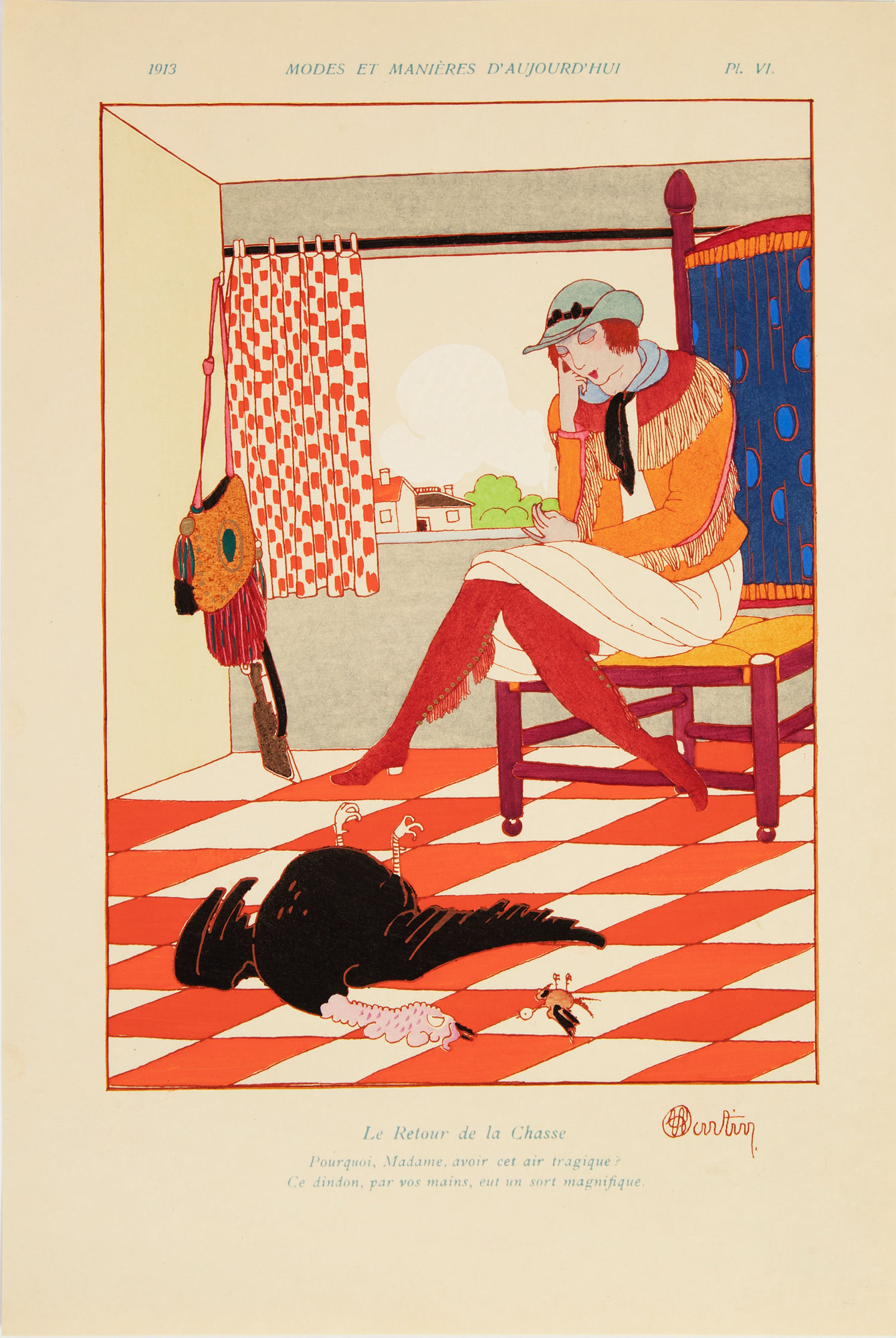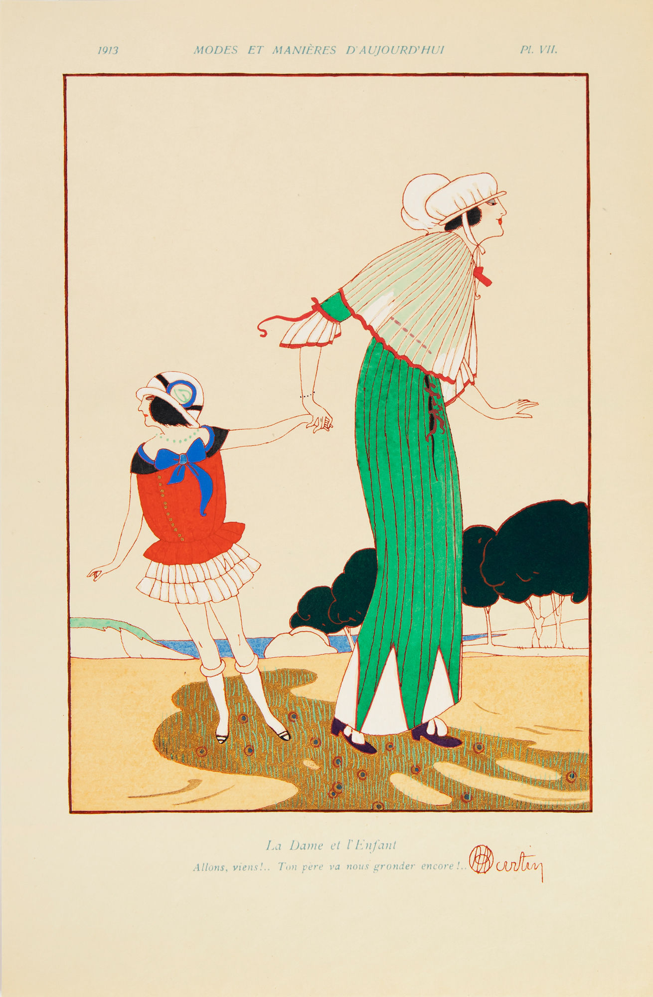 (Paris): Pierre Corrard, 1913. First and only edition of the 1913 number of Modes et Manières d’Aujourd’hui, number 193 of 300 copies, signed by illustrator Charles Martin. In 1912, inspired by the Napoleonic-era fashion journal Modes et Manières du Jour, Pierre Corrard launched Modes et Manières d’Aujourd’hui in Paris. Over the next decade, seven numbers in the series appeared, each pairing the work of a contemporary writer with a portfolio of hand-colored prints by a celebrated Art Deco illustrator, among them Georges Lepape, George Barbier, and André Marty. This 1913 number, the “2e année” of the journal, features text by the playwright Fernand Nozière and twelve fashion plates by Charles Martin, a regular contributor to Harper’s Bazaar, Gazette du Bon Ton, and Fémina. Martin’s vibrant fashion plates capture the fluid, freeing styles suited to the leisure pursuits of the modern Parisienne, the “femme languissante” of Nozière’s introduction, whose dresses are always on the verge of slipping off. Accompanied by verse captions, Martin’s models brave the snow in comically voluminous fur coats, fling off their boudoir slippers, chase fireflies and birds in the park, and play “le bijoutier de la nature” by picking cherries for earrings. This 1913 number of Modes et Manières d’Aujourd’hui was the most commercially successful in the series, the result of Martin’s whimsical portfolio. Complete volumes of Modes et Manières in the original portfolios are uncommon. Text in French. A fine bright copy of an Art Deco landmark. Unbound sheets as issued, measuring 10.75 x 7 inches: [4], 9, xii. Text printed recto only in black and brown; vignettes to title page and limitation page; numbered and signed in pencil by Charles Martin. Twelve numbered and captioned color pochoir plates, some heightened in gold or silver, with tissue guards. Original illustrated portfolio with brown silk ties, lined with orange and black patterned paper designed by Martin, original tissue dust jacket. Lower silk tie missing, faint mark to final plate. Housed in a custom clamshell box.