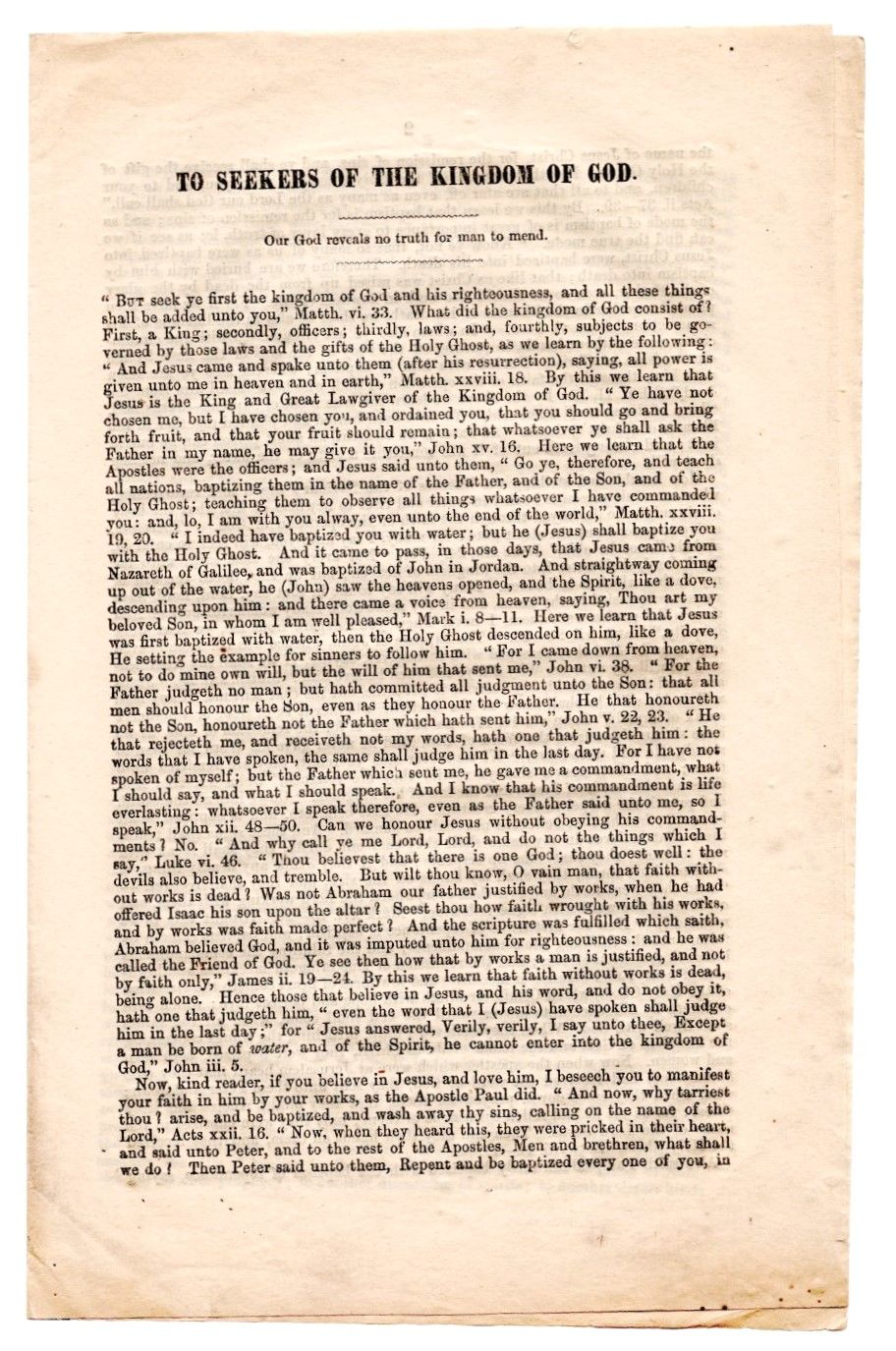 [Edinburgh], 1850. Pamphlet. Near Fine. 4pp. Octavo [22 cm] pamphlet; unsewn. Minor age toning and staining; else Near Fine. We are able to locate four institutional copies at the time of cataloguing. Rare. According to Crawley "Dunn notes in his diary that he composed 'To Seekers of the Kingdom of God' on June 28 and 29 - midway through his stay in Edinburgh, about seven months before he left Great Britain to return to America. A proselytizing tract intended to convince the unconverted of the validity of the Mormon message, it consists largely of biblical quotations leading to the conclusion on the fourth page that Jesus is the king of the kingdom heaven, that Apostles are the officers of the kingdom and the gospel is its laws, that this gospel is faith, repentance, baptism by immersion for the remission of sins, and the laying on of hands for the gift of the Holy Ghost, and that miraculous signs follow those who have obeyed the gospel. Nowhere does this tract mention the Latter-day Saints; one knows it is a Mormon piece only because of Dunn's name at the end." Crawley 497. Flake/Draper 3045.