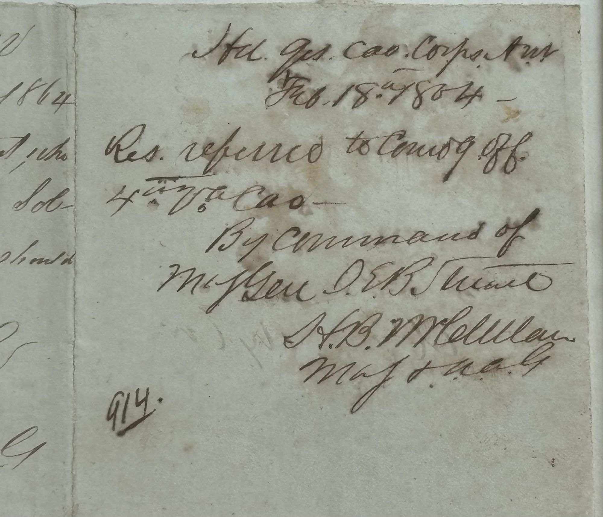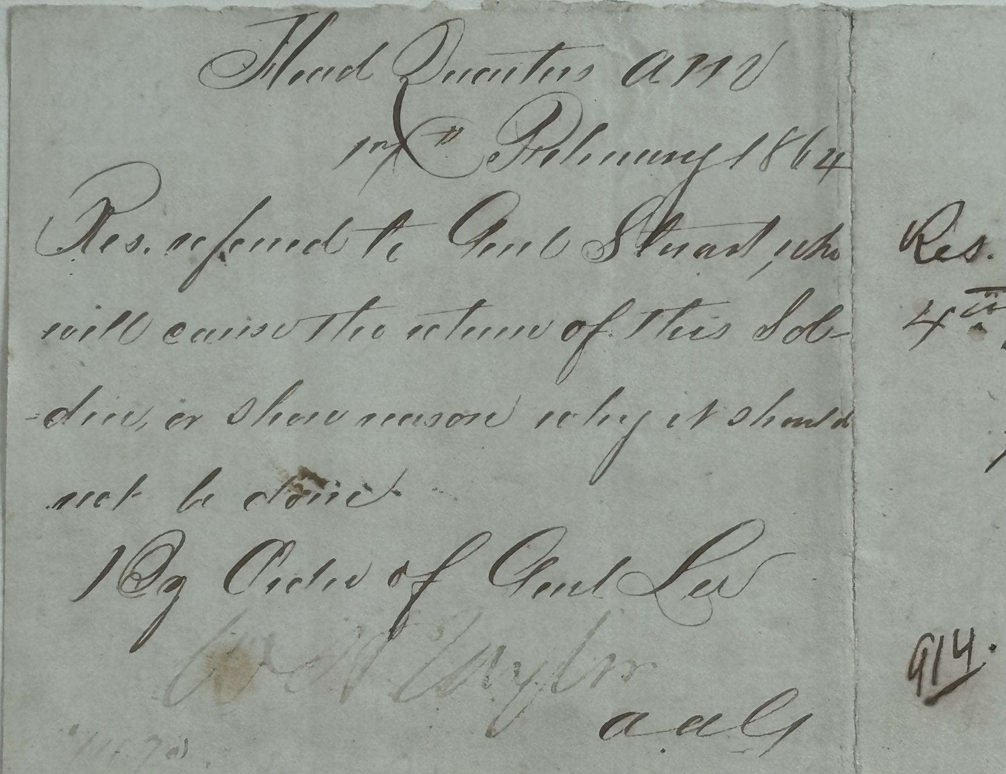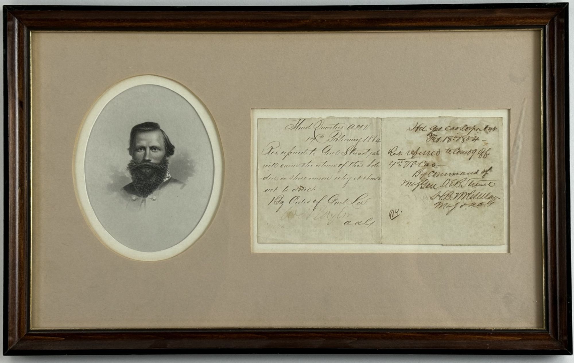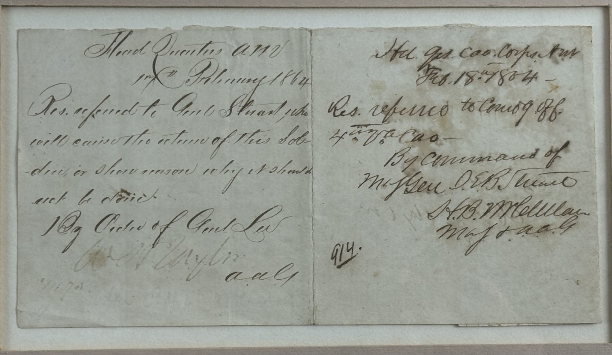 Virginia, 1864. War date clipped autograph endorsement, dated Feb. 18th 1864. mounted with steel engraving. Endorsement includes signatures of W.H. Taylor, AAG (Adjutant-General of the Army of Northern Virginia) and H.B. McClellan (Major, Assistant Adjutant-General, and Chief of Staff of the Cavalry Corps, Army of Northern Virginia) on behalf of J.E.B. Stuart. Professionally mounted and framed (measuring 14.5 in. x 9 in.). Endorsement in Good condition with mild age toning. Signature of WH Taylor is clear but slightly faded. Glass has abrasion along right edge. JL Consignment. Shelved in DuPont. Column One: "Referred to Genl. Stuart who will cause the return of the soldier or show reason why it should not be done.