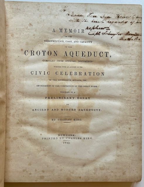 New York: Charles King, 1843. Decorative Cloth. Very Good. A very nice Association copy: WARMLY INSCRIBED BY THE AUTHOR AND PUBLISHER (CHARLES KING) TO ALEXANDER HAMILTON'S GRANDSON, CAPTAIN SCHUYLER HAMILTON (1822-1903), WHO IN TURN INSCRIBED THIS COPY TO HIS UNCLE, CHASE VAN DEN KEENE, on the title page. A solid copy to boot of the 1843 1st edition. Tight and VG in its patterned dark cloth, with fading along the spine and light offsetting at the fore-edges. Pronounced foxing as well to the preliminaries and, to a much lesser extent, along the text. Still though, bright and crisp and eminently legible. Lightly-tinted frontispiece ("View of the Croton Dam"), engraved by Jordan & Halpin. Continuing from the title page: "Together with an Account of the Civic Celebration of the Fourteenth October, 1842, on Occasion of the Completion of the Great Work: Preceded by a Preliminary Essay on Ancient and Modern Aqueducts.