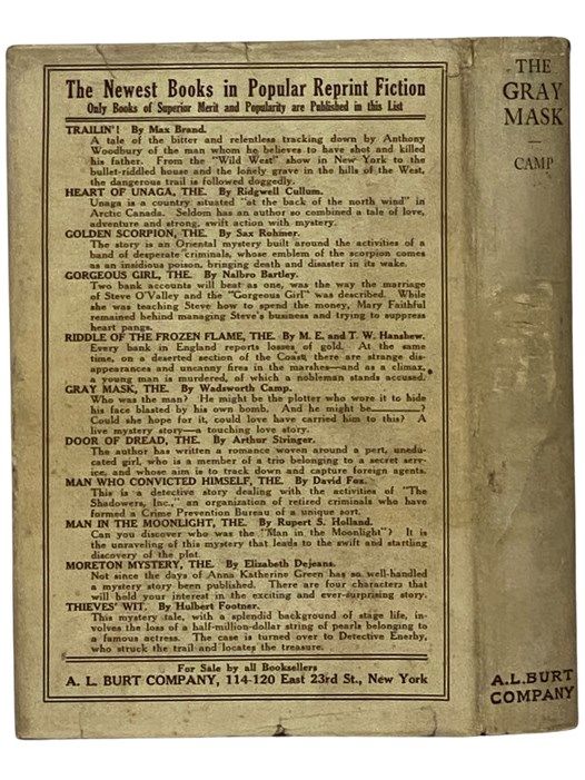 New York: A.L. Burt Company, 1920. Reissue. Hard Cover. Very Good/Good. De Maris, Walter. Reissue. Jacket edges rubbed with some chips and tears. Page ridges foxed. 1920 Hard Cover. 301 pp. Frontispiece and jacket art by Walter De Maris. Detective Garth and his daughter Nora are supernatural mystery hunter and on a mission to find schemers and hoaxers! Excerpt: "Garth, in response to the unforeseen summons, hurried along the hallway and opened the inspector's door. As he faced the rugged figure behind the desk, and gazed into those eyes whose somnolence concealed a perpetual vigil, his heart quickened. He had been assigned to the detective bureau less than six months. That brief period, however, had revealed a thousand eccentricities of his chief. The pudgy hand beating a tattoo on the table desk, the lips working at each other thirstily, the doubt that slipped from behind the veil of the sleepy eyes, were all like largely printed letters to Garth—letters that spelled delicate work for him, possibly an exceptional danger.