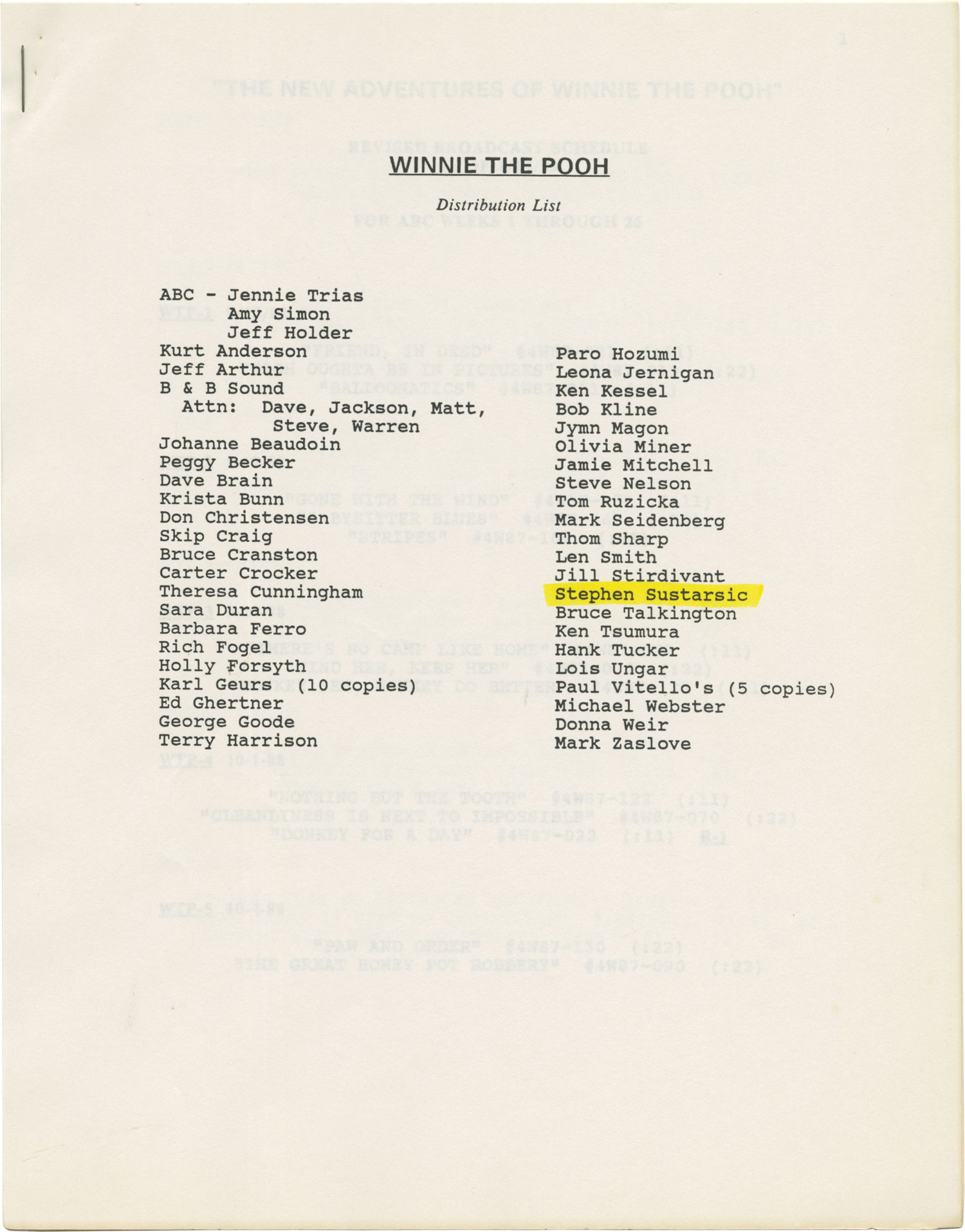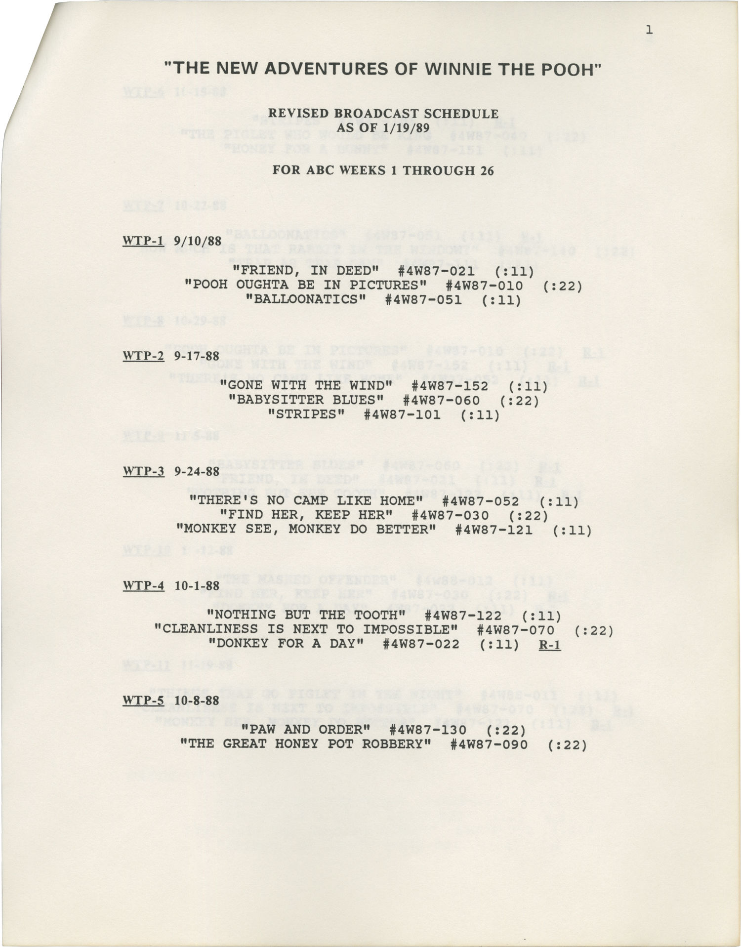 N.p.: N.p., 1989. Revised ABC Broadcast schedule for the first season of the 1988-1991 television series. Season 1 originally aired from January 17, 1988 to March 4, 1989 on The Disney Channel until switching to ABC in September 1988.