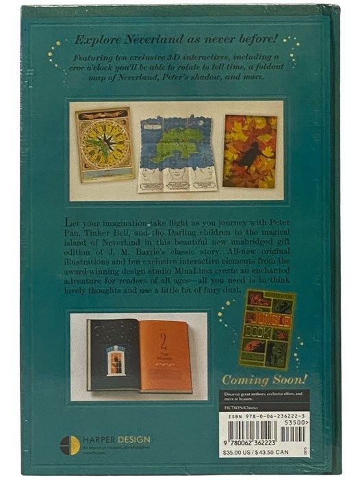 Harper Design, 2015. Hard Cover. Fine/No Jacket. 6x1x9. MinaLima. New. Still ink shrink wrap. 2015 Hard Cover. 256 pp. J. M. Barrie's classic children's story is reimagined in this delightful full-color deluxe edition filled with all-new illustrations and ten removable features specially designed by MinaLima, the award-winning design studio behind the graphics for the Harry Potter films. For more than a century, the adventures of Peter Pan - the boy who can fly and never grows up - and Wendy Darling have captured the hearts of generations of readers. In this enchanting illustrated volume, the fantastical world of Neverland and its magical inhabitants, including the Lost Boys, Captain Hook, Tiger Lily, and the beloved Tinker Bell, are brought to life like never before. Peter Pan is packed with a lush array of colorful illustrations and interactive removable features, including a detailed map of Neverland, a croc o'clock with hands you can rotate to tell time, Peter's shadow, and more. Beautiful and captivating, filled with breathtaking artwork, this stunning book is sure to become a treasured keepsake for fans of all ages.