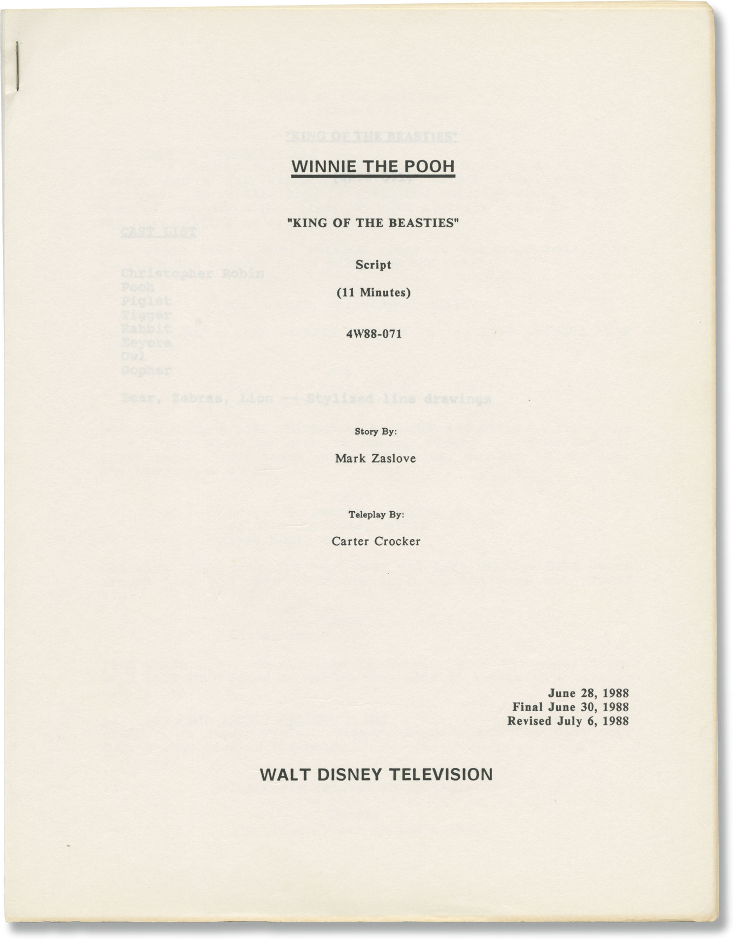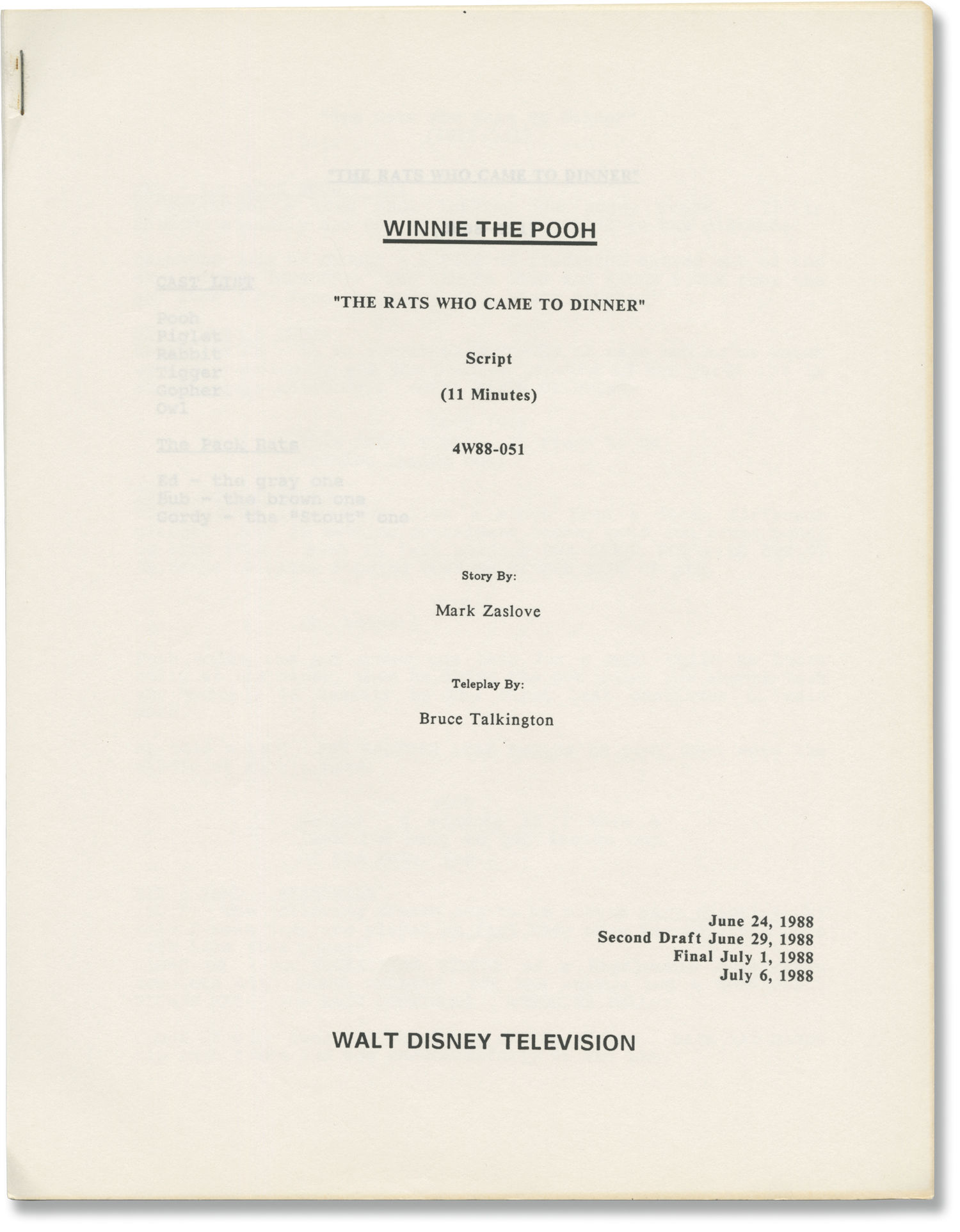 Burbank, CA: Walt Disney Television, 1988. One Revised Draft script for "King of the Beasties" and one Final Draft script for "The Rats Who Came to Dinner", presented together as Season 1 Episode 17 of 1988-1991 television series. Originally aired January 7, 1989 on ABC.