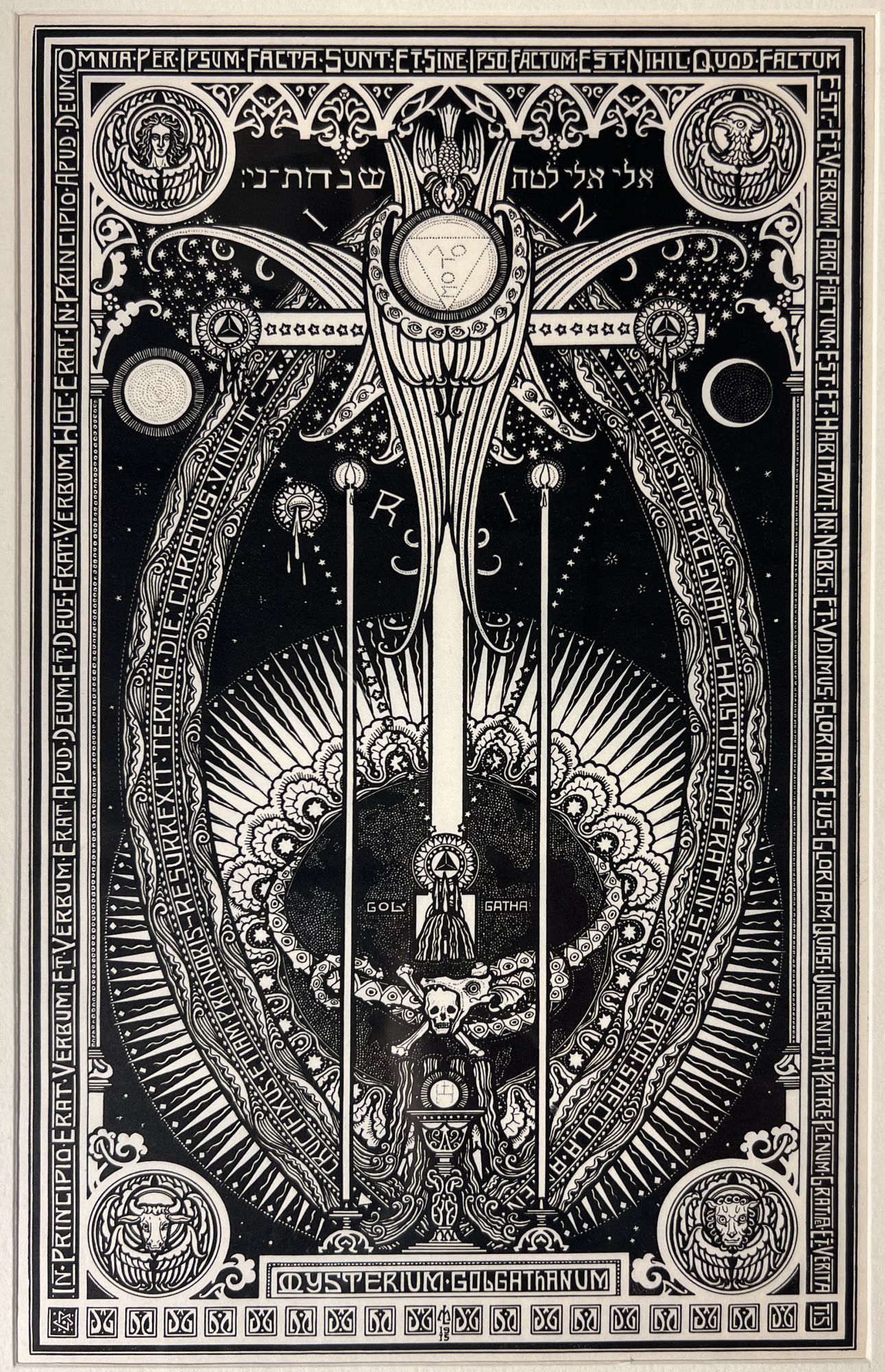 Image size 131/4" x 8" Printed in black with red accent. Elaborate decorative designs. Title page from The four books of the Imitation of Christ. Design dated 1915 at base. Melchior Lechter (* 2. October 1865 in Münster (Westphalia); † 8. October 1937 in Raron, canton of Valais, Switzerland) was a German painter, graphic artist and book artist. Best known for his work in the decorative design of books and ex libris, stained glass windows and painting. He was an active participant in the circle of artists and writers around the poet, Stefan George.