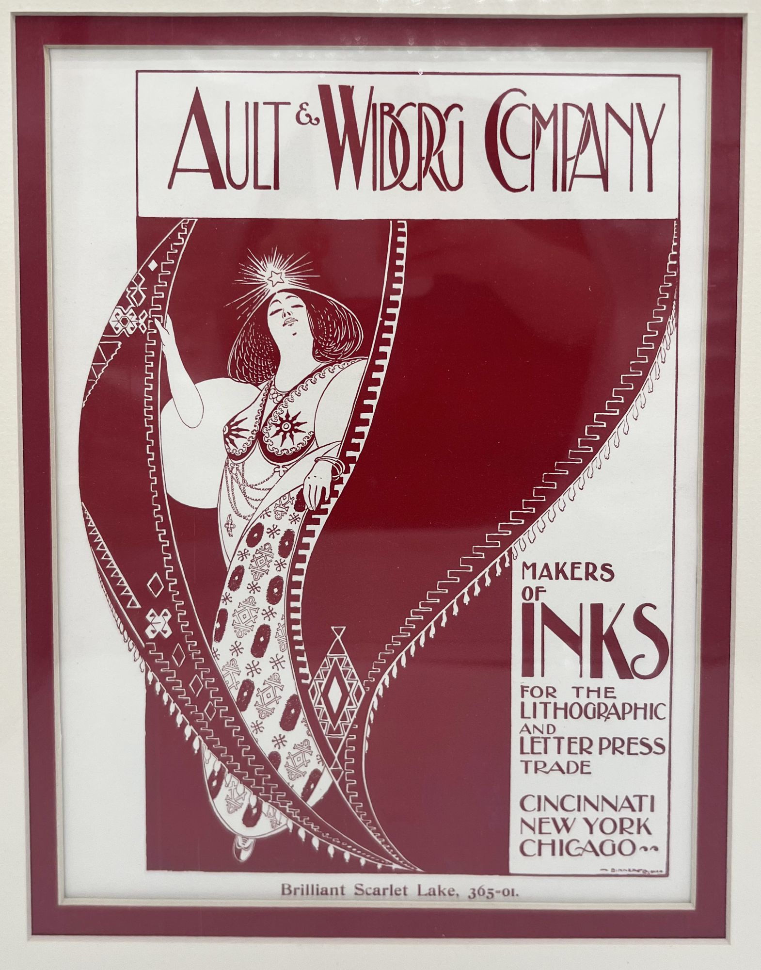 Cincinnati: Ault & Wiborg Company, 1895. Image of a maiden exemplifying the vibrant inks used by The Ault & Wiborg Company. The queen of hearts arrives - artistic printing. Captioned "Makers of Inks for the Lithographic and Letter Press Trade. Color - brilliant Scarlet Lake 365-01 Image on reverse promotes Osborne Green. 12" x 8 3/4