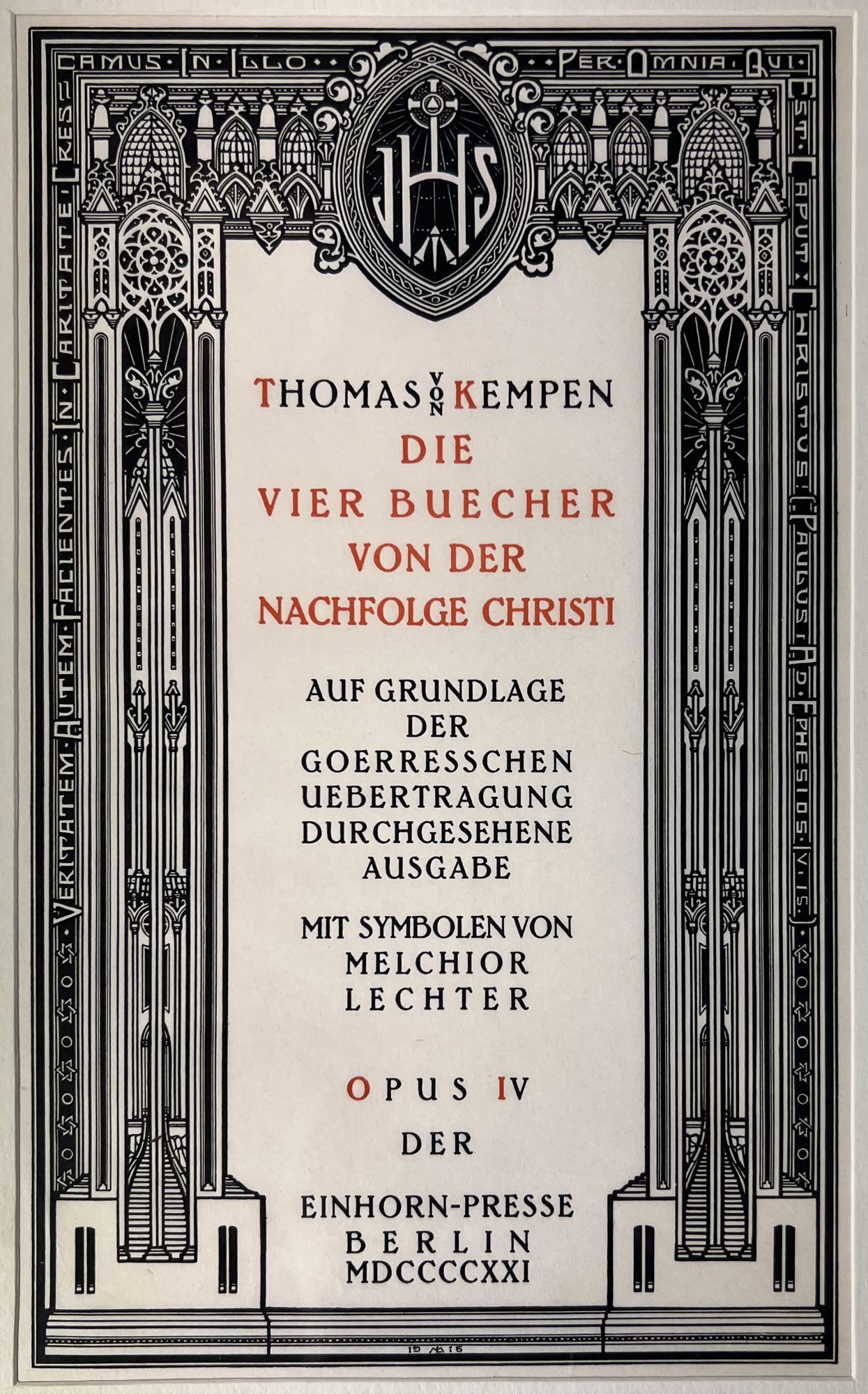 Image size 131/4" x 8" Printed in black with red accent. Elaborate decorative designs. Title page from The four books of the Imitation of Christ. Vorchristliches Praeludium. Melchior Lechter (* 2. October 1865 in Münster (Westphalia); † 8. October 1937 in Raron, canton of Valais, Switzerland) was a German painter, graphic artist and book artist. . Best known for his work in the decorative design of books and ex libris, stained glass windows and painting. He was an active participant in the circle of artists and writers around the poet, Stefan George.