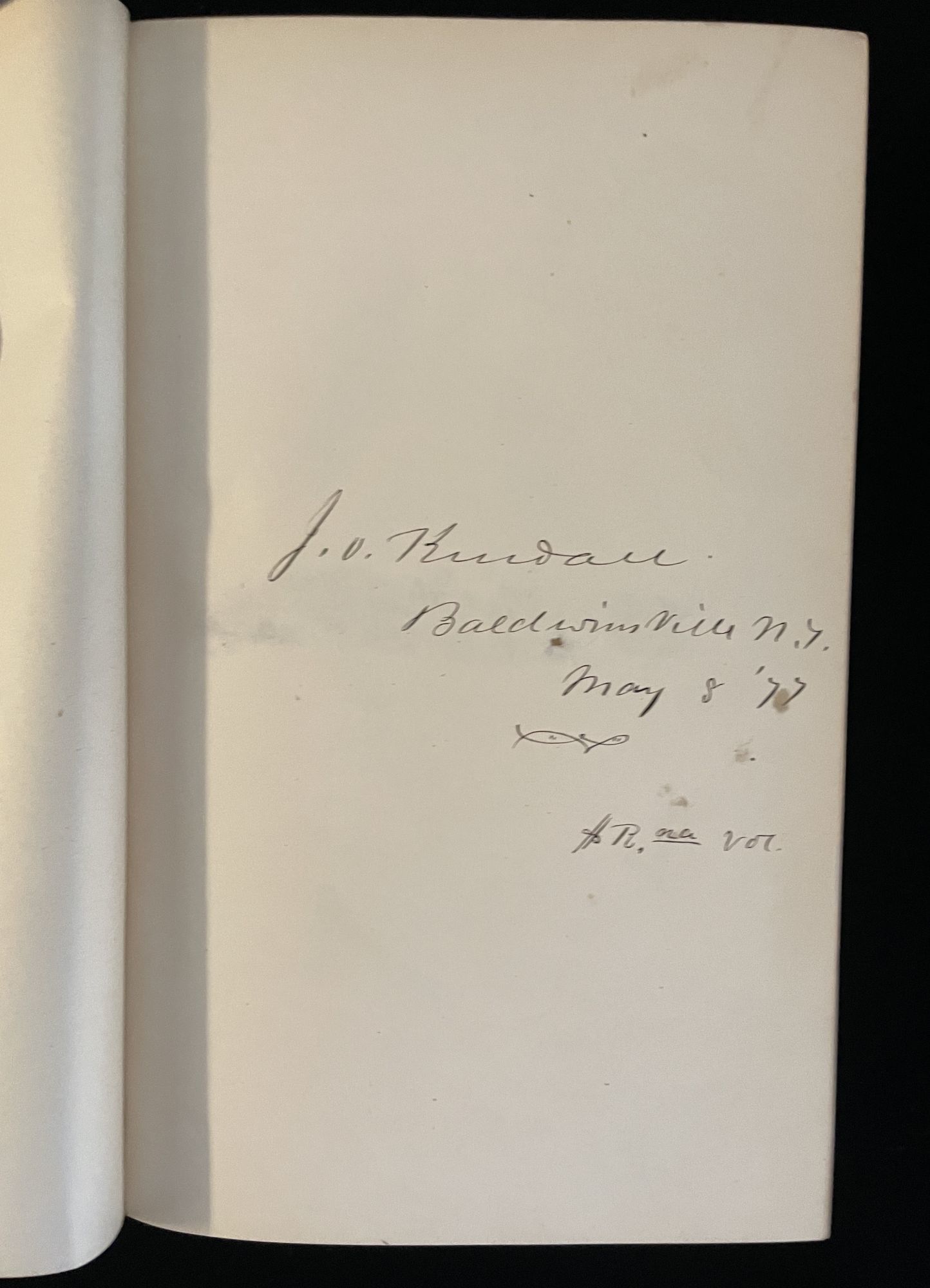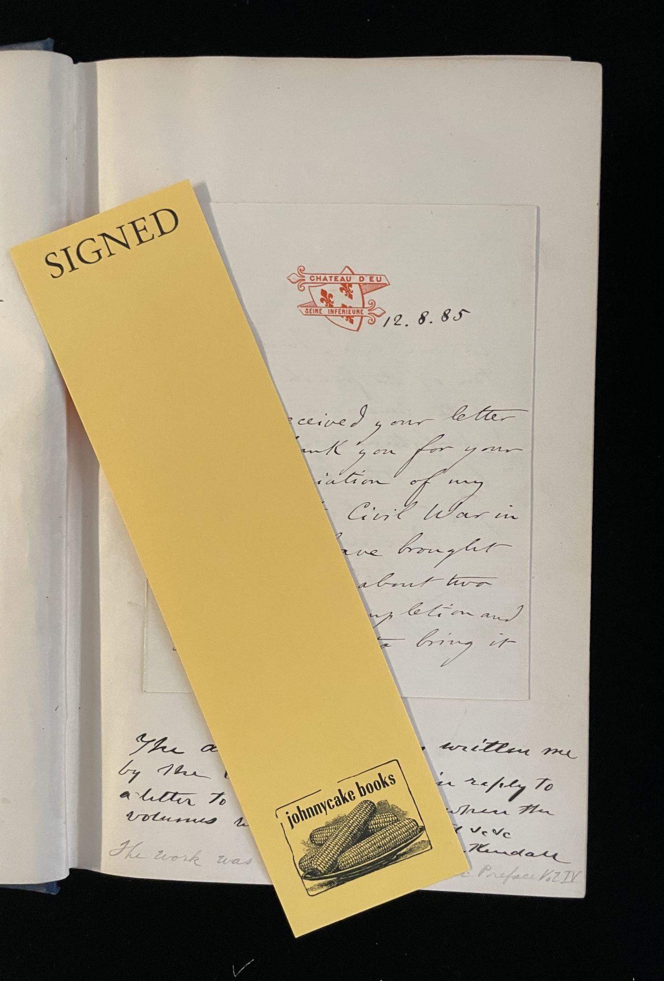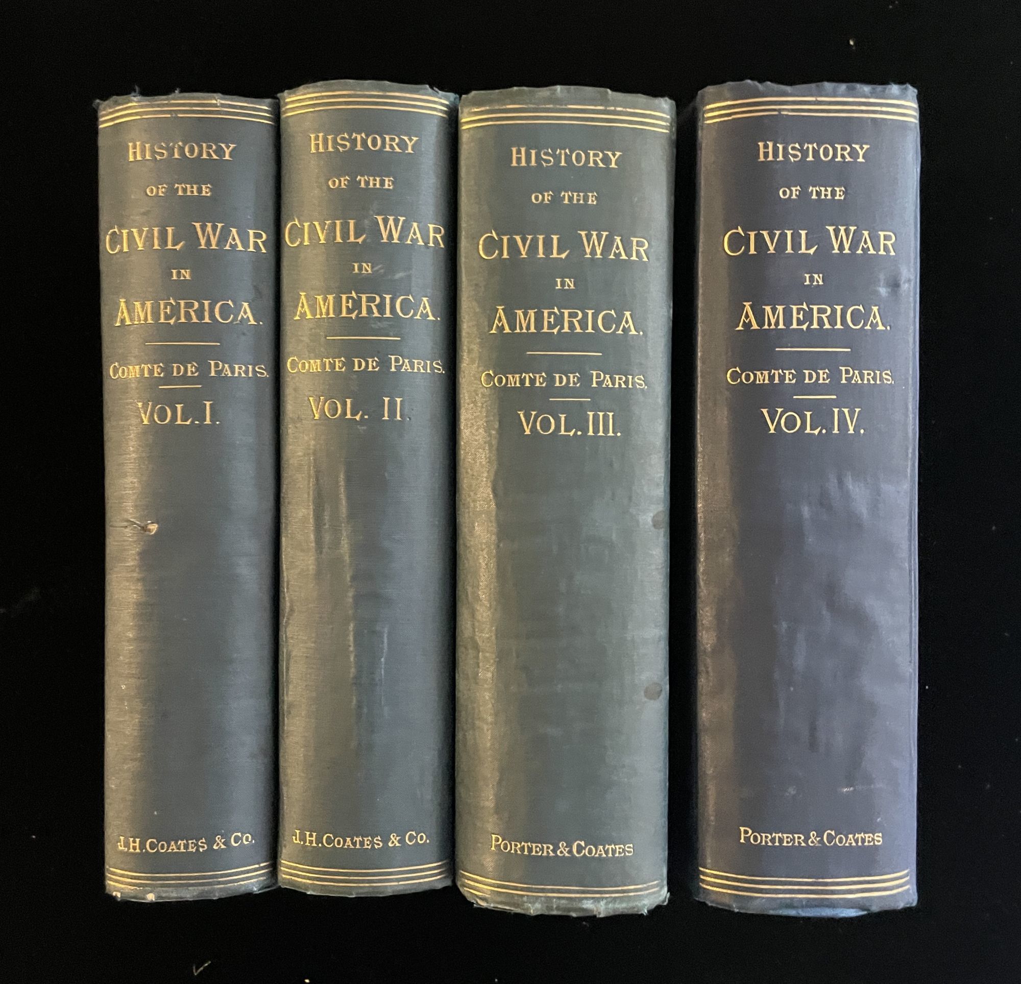 Phildalephia: Joseph H. Coates & Co, 1876. 1st Edition. Hardcover. VG+. First edition, 4 volumes, printed 1876-1873, uniform blue cloth, gilt device front,. gilt tites spine. Ownership copy of Civil War surgeon Dr. James V. Kendall, with his signature, and address of Baldwinsville NY, and the date each volume was purchased on the flyleaf of both volumes. Pasted into the second fly of the Volume I is a two-page ANS on chateau letterhead dated 12.8.85 from le Comte de Paris, the author, to Dr. Kendall, in English, in which le Comte acknowledges Kendall's laudatory letter and comments that he "has brought this work to about two thirds completion', anticipating "there will be ten in the French and five in the American edition' and regretting "unfortunately I can devote but little time to this great work". Beneath the pasted note Kendall has written a signed note in which he explains the nature of the correspondence from le Comte. Underneath that, in pencil. Kendall notes that the work was never completed. Dr. Kendall (1818-1901) served in the 149th Regiment during the War between the States. Prince Philippe of Orléans, Count of Paris (Louis Philippe Albert (1838 -1894), was disputedly King of the French from 24 to 26 February 1848 as Louis Philippe II, although he was never officially proclaimed as such. He was the grandson of Louis Philippe I, King of the French. A historian, journalist and outspoken democrat, Philippe volunteered to serve as a Union Army officer in the American Civil War along with his younger brother, Prince Robert, Duke of Chartres. He was appointed as an assistant adjutant general with the rank of captain on 24 September 1861 and served under the name of Philippe d'Orléans, the Count of Paris. He served on the staff of the commander of the Army of the Potomac, Major General George B. McClellan, for nearly a year. He distinguished himself during the unsuccessful Peninsular Campaign. He resigned from the Union Army, along with his brother, on 15 July 1862. Philippe's History of the Civil War in America is considered a standard reference work on the subject. (Source: Wikipedia). All volumes in uniform condition. All maps and foldouts present. Covers are modestly rubbed and the internal hinges, front and rear, are exposed but binding still quite solid.