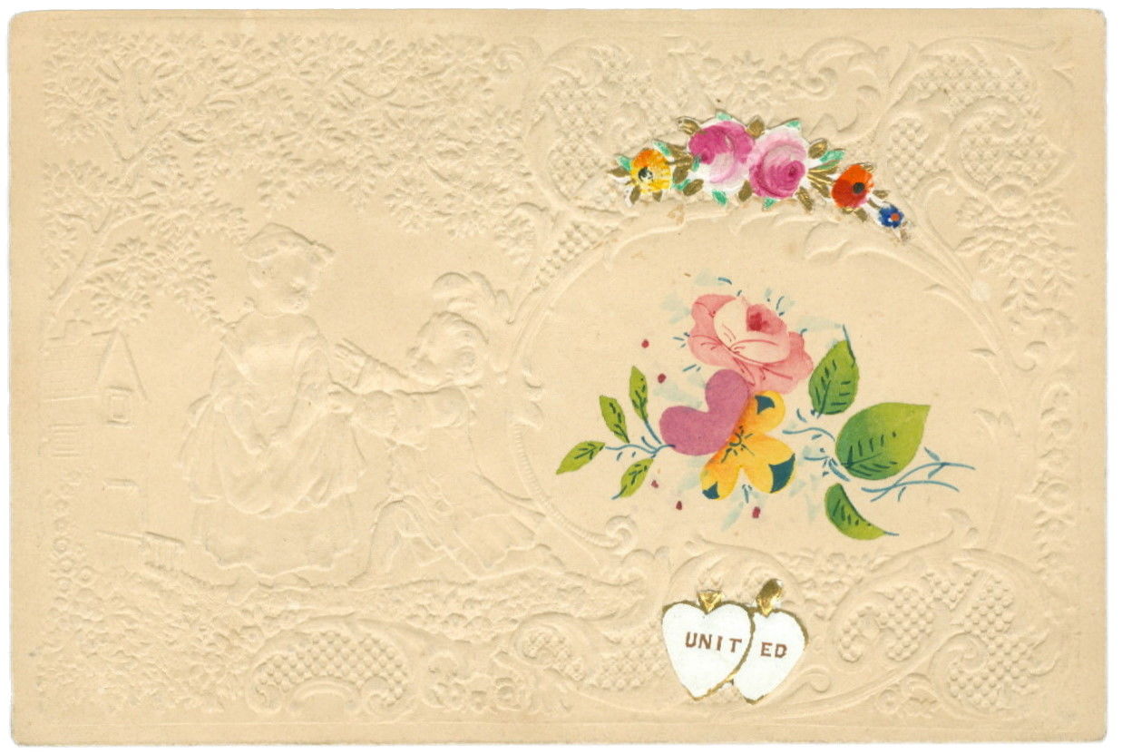 A bottom-fold embossed paper valentine.depicting a garden scene, with a man on bended knee before his intended. A theorem-like floral watercolor vignette at right adorned with handcolored scrap at top and polished paper joined hearts captioned in gold, reading "United". Blank inside. Condition: excellent.
