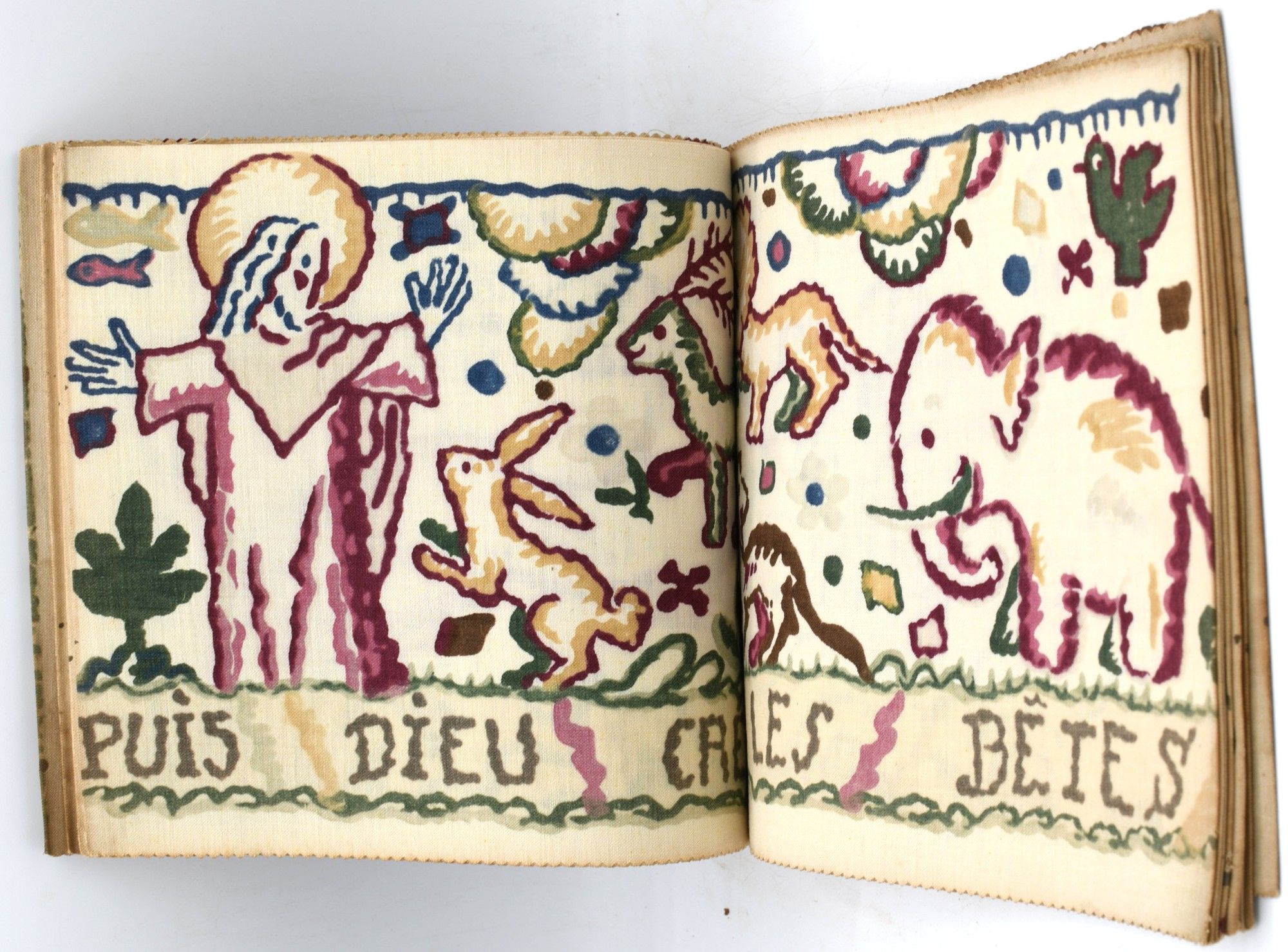 Paris: Jardin des Modes, 1931. Very Good binding. Oblong quarto; batik printed fabric; [26] pages [13 French-fold leaves] and serrated edges as issued; string-tied, with a woven cloth overlay; the covers are soiled as isoften the case with this book, and the first and last leaves have tide lines. ~~The oldest history in the world -- the creation story in Genesis, printed in a pochoir style in four colors on linen, with quite charming illustrations by Francois. ~~. Very Good binding.