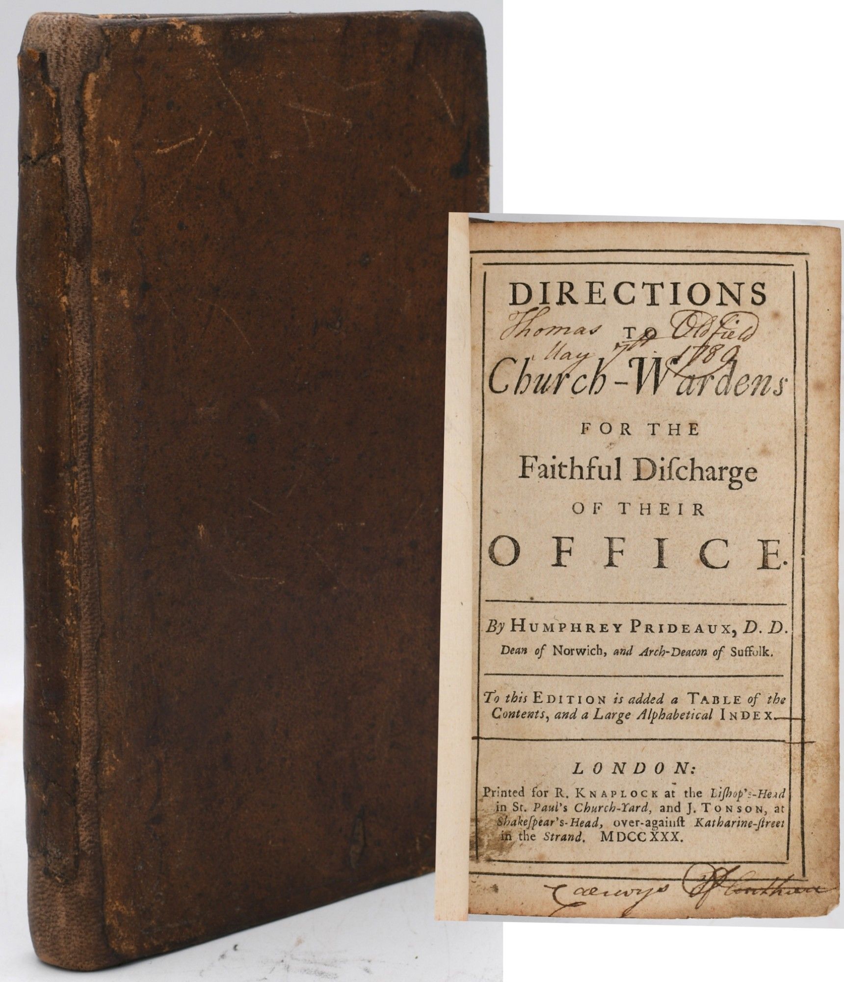 London: R. Knaplock & J. Tonson, 1730. Hard Cover. Very Good binding. 12mo; in calf, with borders rolled in blind; 179 pages followed by [11] pages of Index; rebacked in leather, with the original blank spine laid down; there are new endpapers; on the title page is penned "Thomas Oldfield, May 7th, 1789"; the title page states: "To this edition is added a Table of Contents and a large Alphabetical INDEX."~~Humphrey Prideaux was Dean of Norwich when he published Directions of Church-Wardens. He was quite intent that the ministers instruct the Wardens as to their duties (one can infer that there was a certain laxity from time to time). The role of the Wardens is delineated with great detail, and offers a useful picture of English parish churches in the early 18th century. An early printing.~~~. Very Good binding.
