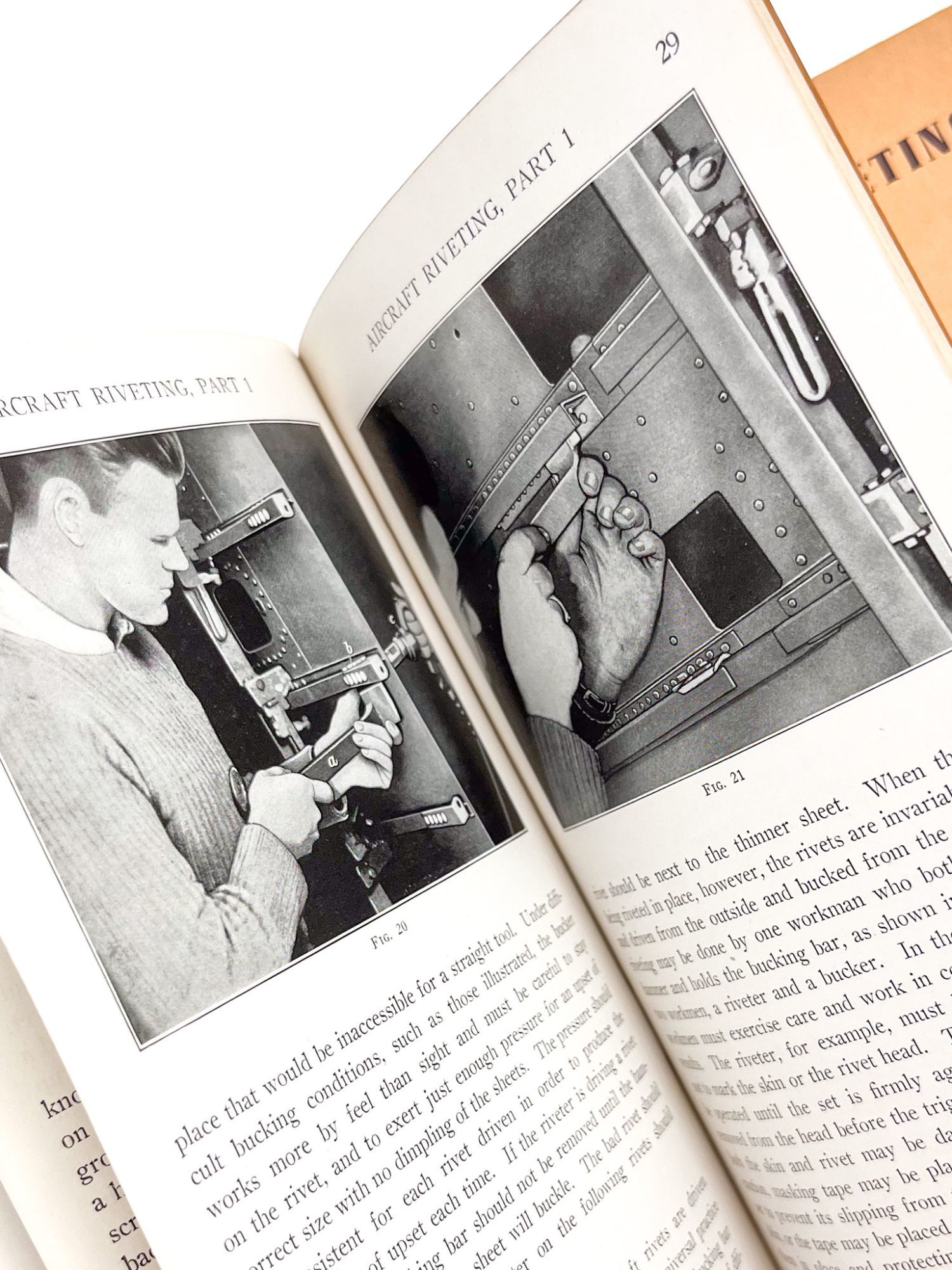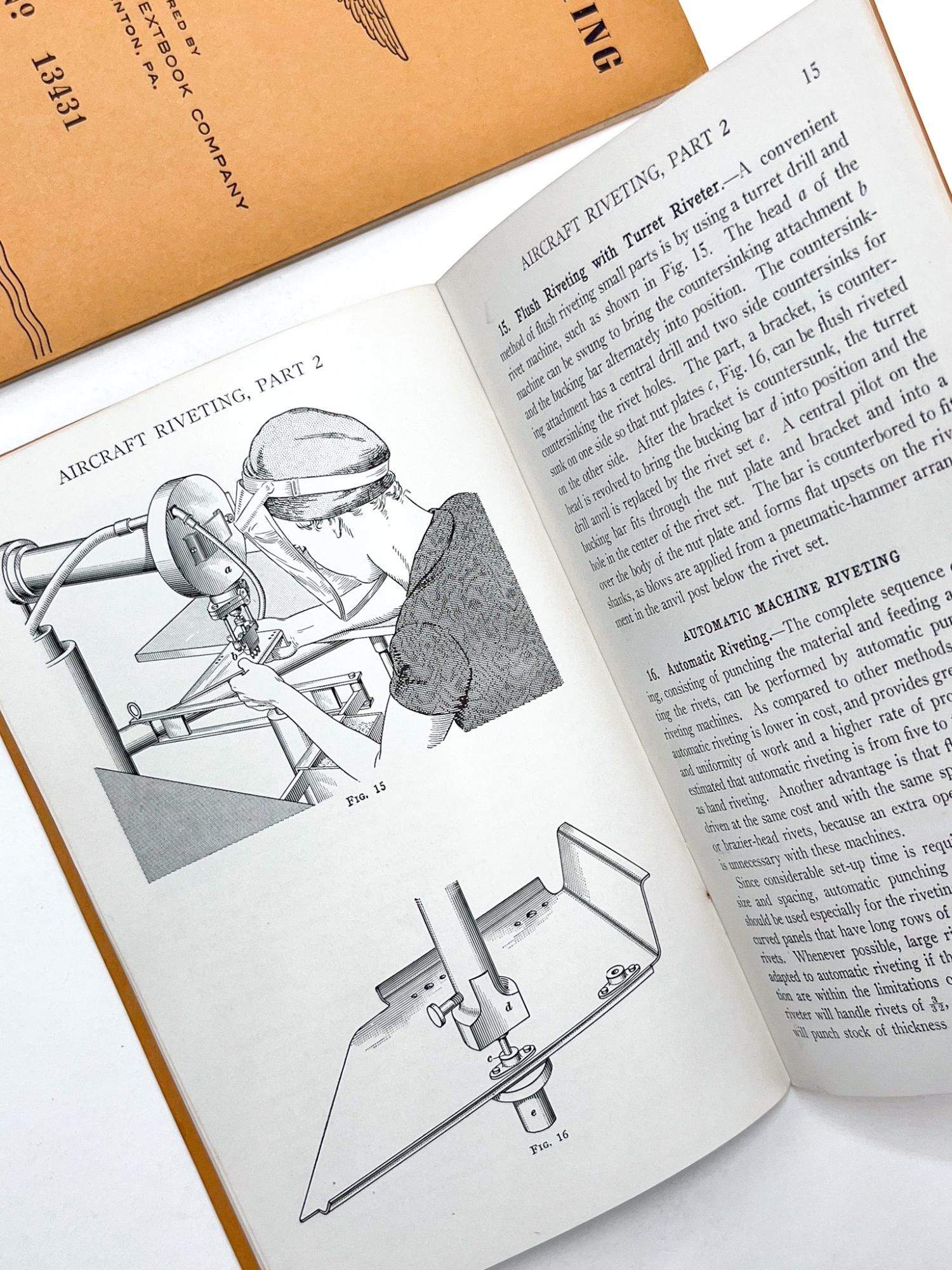 (Scranton, Pennsylvania): (International Textbook Company), 1943. First printings. Very good plus.. World War II-era Navy manual on aircraft riveting applications, materials, and methods, illustrated with photographs and line drawings of the women who famously flooded into heavy construction machinery jobs during the war. At the peak of wartime aircraft industry employment in 1943, women workers made up more than a third of the labor force, building bombers and stylized in song, film, and popular art as "Rosie the Riveters." As a technical manual, AIRCRAFT RIVETING is largely free of the gendered persuasion common to recruiting advertisements of the time, assuming the reader may be a woman new to the field while making little fuss about it. ("Since the squeezer is to [sic] heavy for a woman operator, it is suspended by a cable [...].")