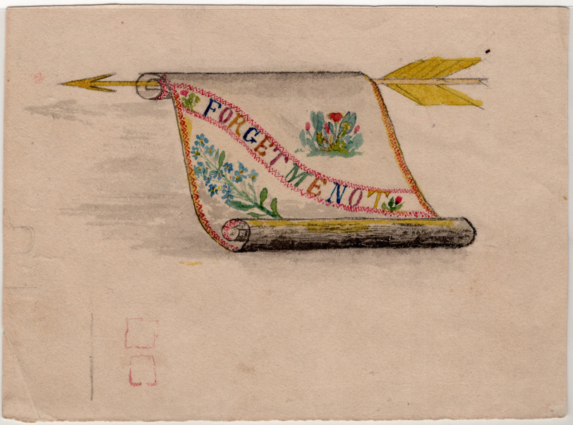 1850. Very good.. A fine little snippet of a watercolor, well executed but naive depicting of a scroll of paper on an arrow unfurled to reveal the oft said and eternal message. Forget me not. Decorated with an array of flowers upper right and what else but forget-me-nots at the lower left. reverse is blank. c.1850s. Measures 4" by 5.75