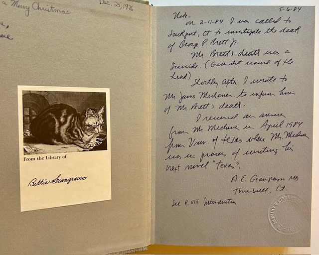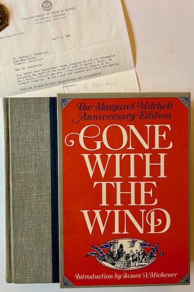 New York: Macmillan, 1975. Cloth. Very Good +. A handsome copy of the 1975 stated 1st printing of the first "Anniversary edition". The elegant Introduction by James Michener ties into the uniqueness of this copy, in which the former owner --a doctor from Trumbull, CT named A.E. Giangrasso-- was called down to Southport, CT to investigate the death (a suicide) of the former head of Macmillan (and young James Michener's boss for a spell) -- George P. Brett. Doctor Giangrasso, as he explains in his handwritten note on the front free endpaper, wrote to James Michener to break this sad news to him and the 1 pg, typed letter from Michener in response (the TLS) is what accompanies this copy of the Anniversary edition of GWTW. Small former owner inscription and bookplate at the front pastedown, blindstamp of Dr. Giangrasso below his inscription, otherwise very clean. Thick octavo, also includes a very sharp copy of the publisher's printed laminate slipcase. Plus of course James Michener's 8 1/2" x 11" signed typed letter to Dr. Giangrasso.