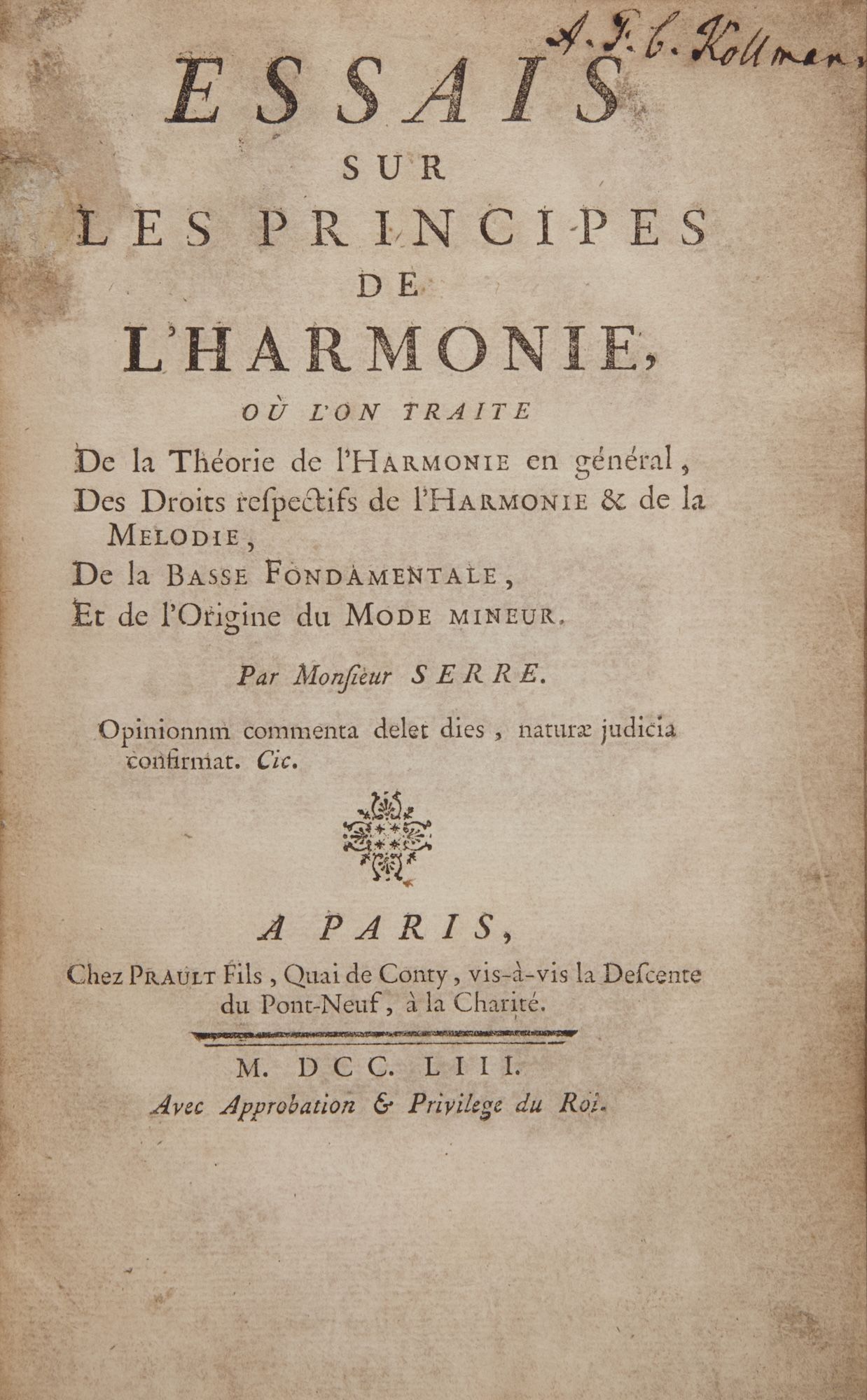 Essais sur les Principes de l'Harmonie, où l'on Traite de la Théorie de l'Harmonie en général, des Droits respectifs de l'Harmonie & de la Melodie, de la Basse Fondamentale, et de l'Origine du Mode mineur