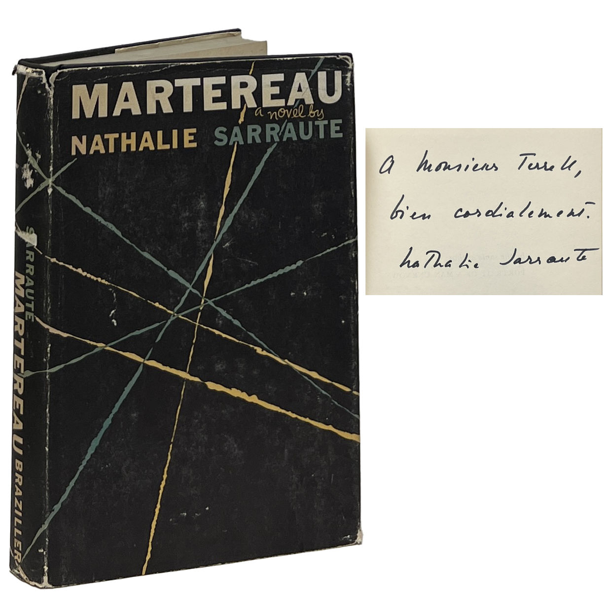 New York: George Braziller, Inc, 1959. First Edition. Hardcover. Very Good/Very Good. Translated by Maria Jolas. Inscribed by Sarraute on the half-title. Very Good in a Very Good jacket, clipped but stamped with a new price ($4.50), generally rubbed at the surface and edges, a scuff on the spine. Black cloth with blue and white ink lettering and designs on the spine and front board. Square and firmly bound, a few stains at the edges, additional inscription on the half-title, clean otherwise. Sarraute's novel of "a tubercular young man who demands 'to know...always what they are hiding, to peer behind their outside decorations, to see confirmed what I scent, what I forsee.'